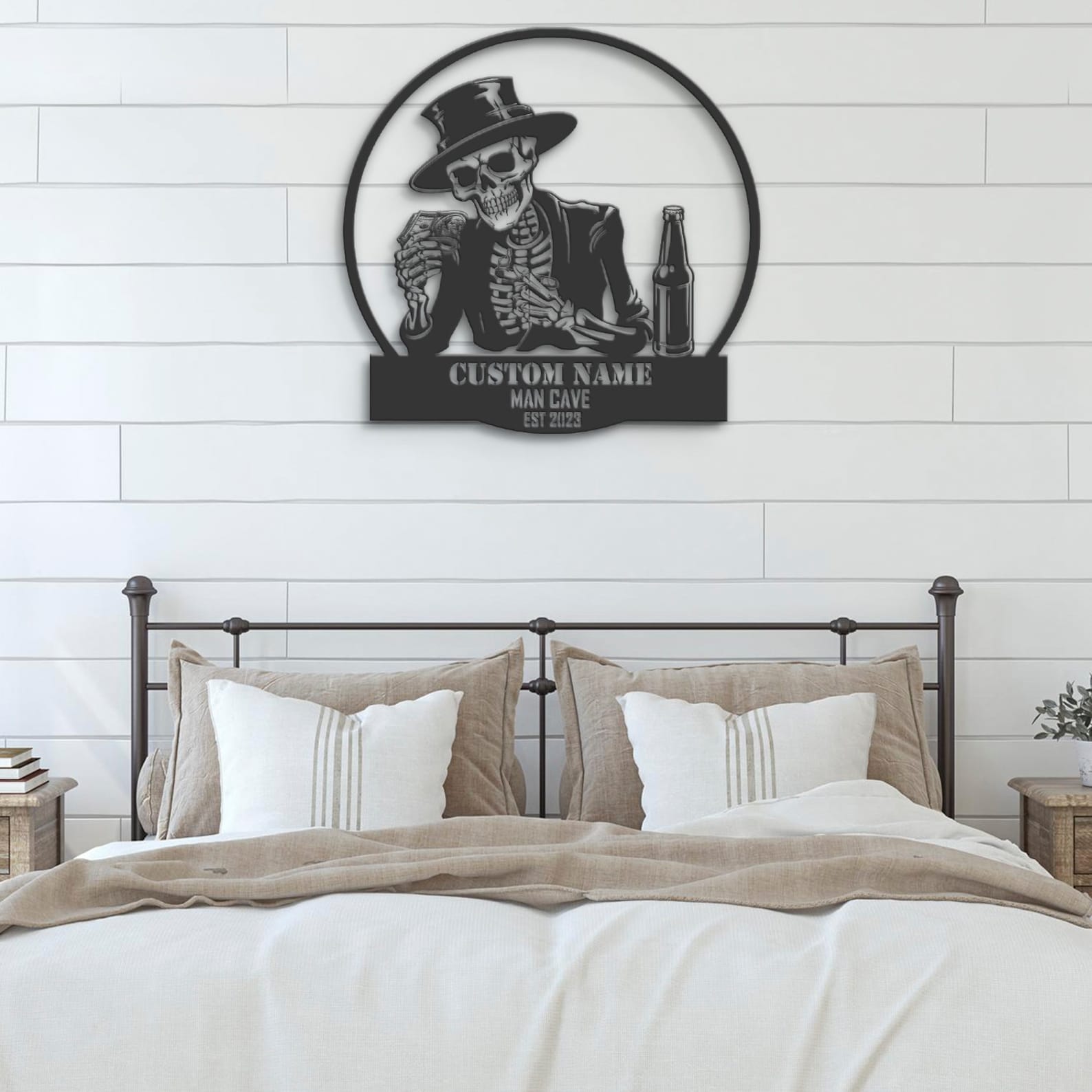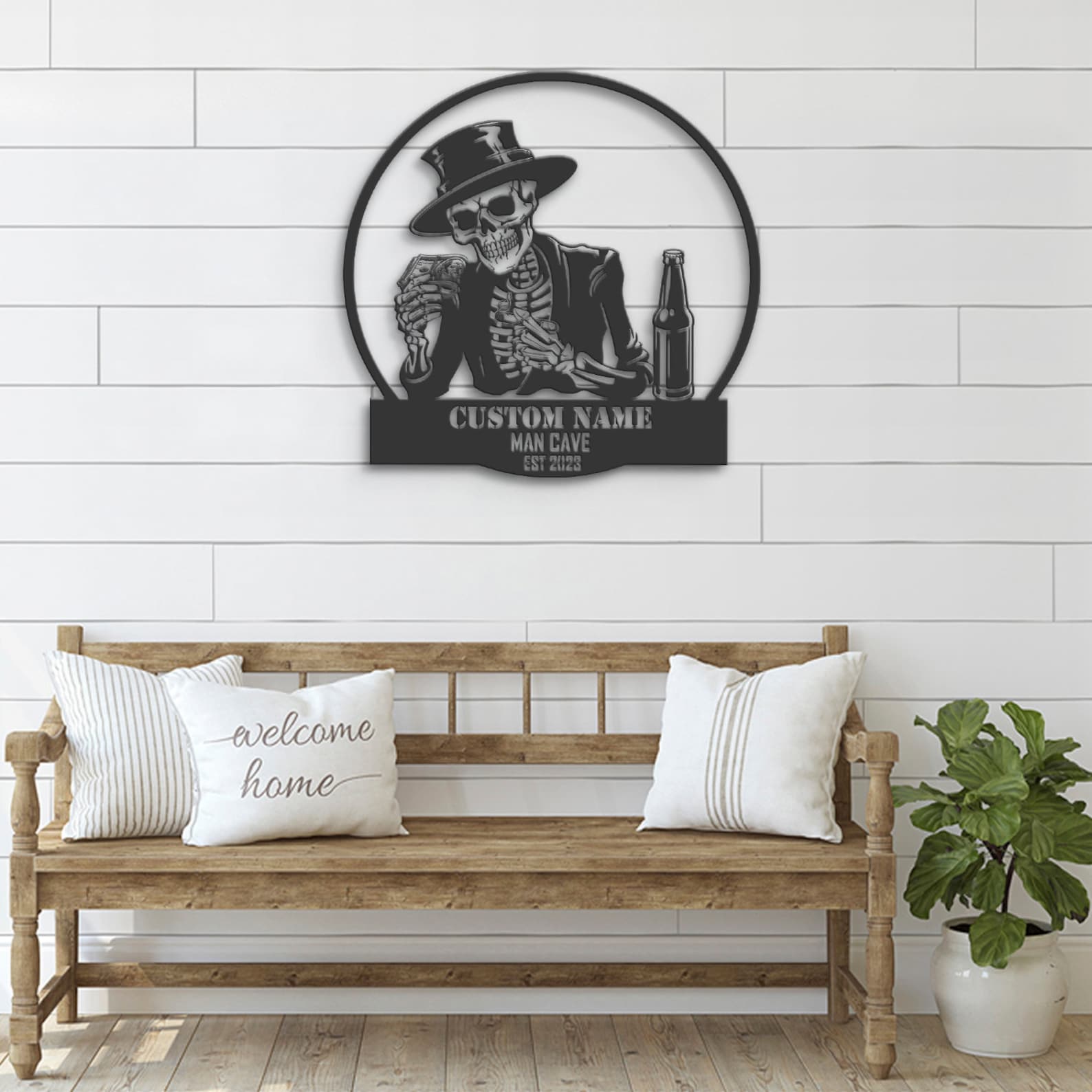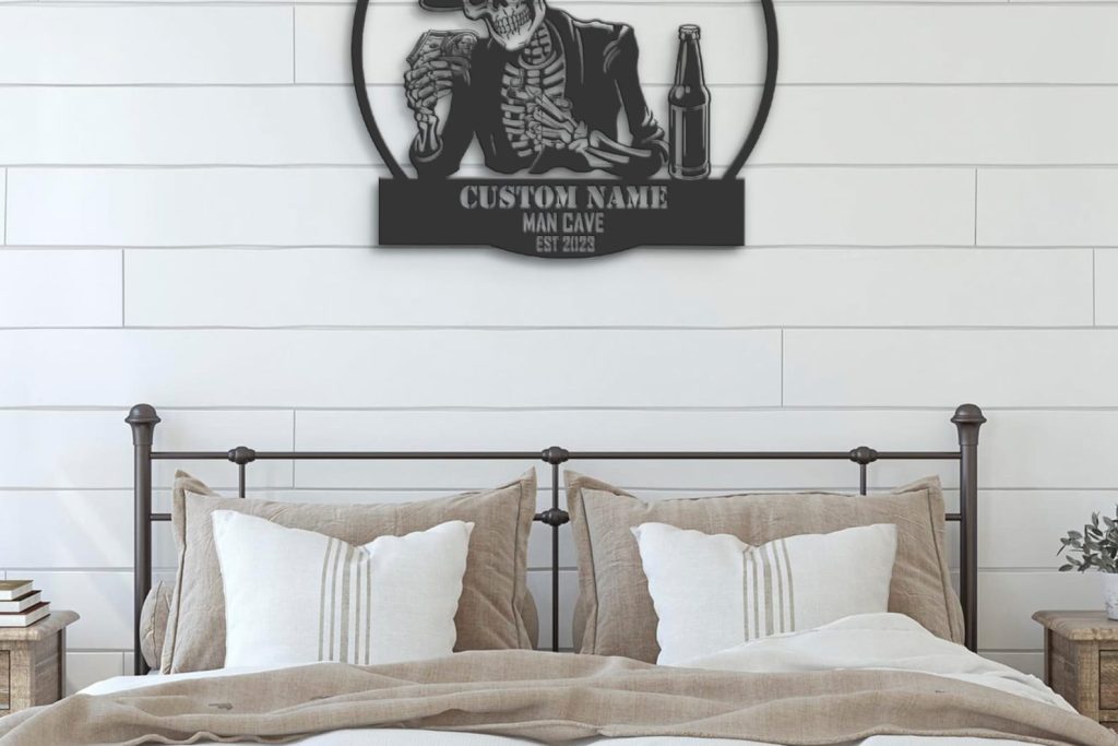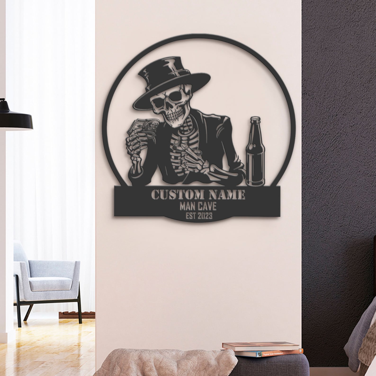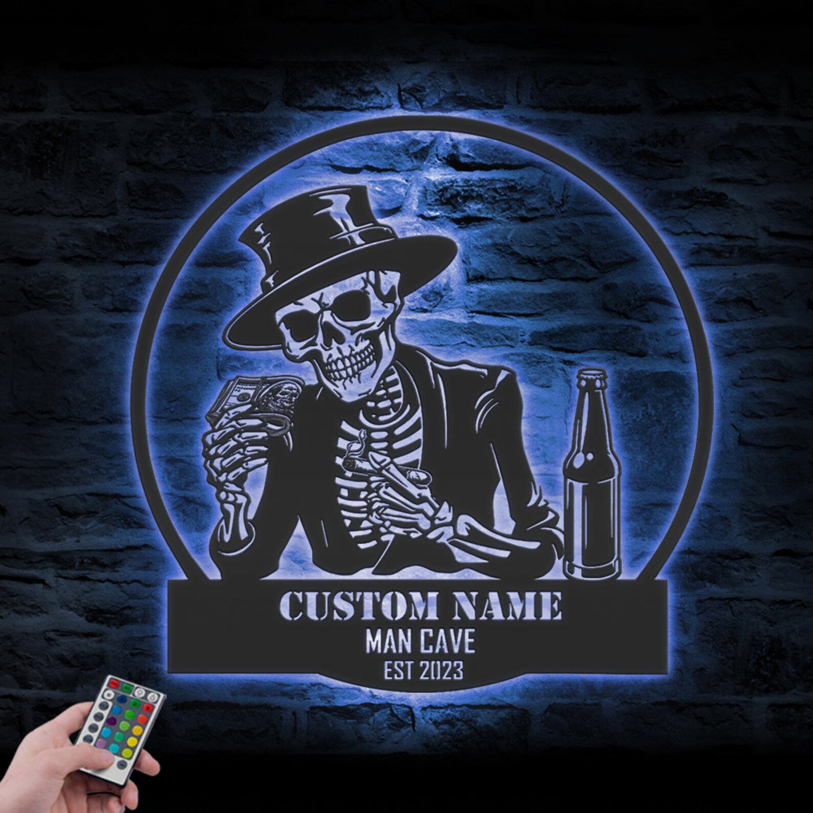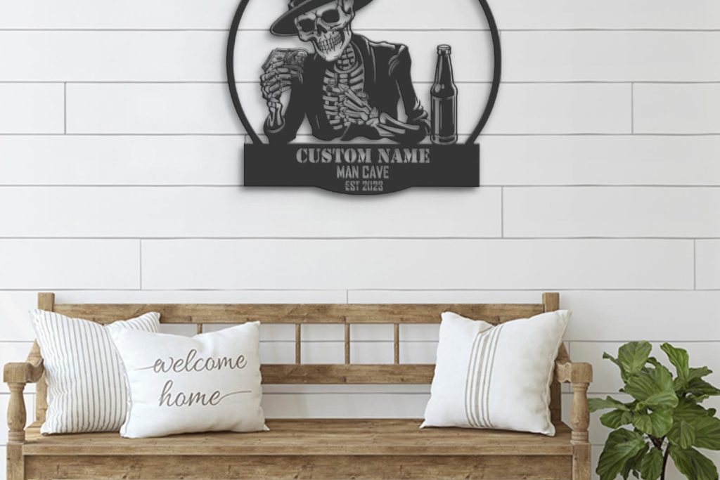 Custom Skeleton Beer Cigar Dollars Metal Wall Art – LED Light, Personalized Sign
