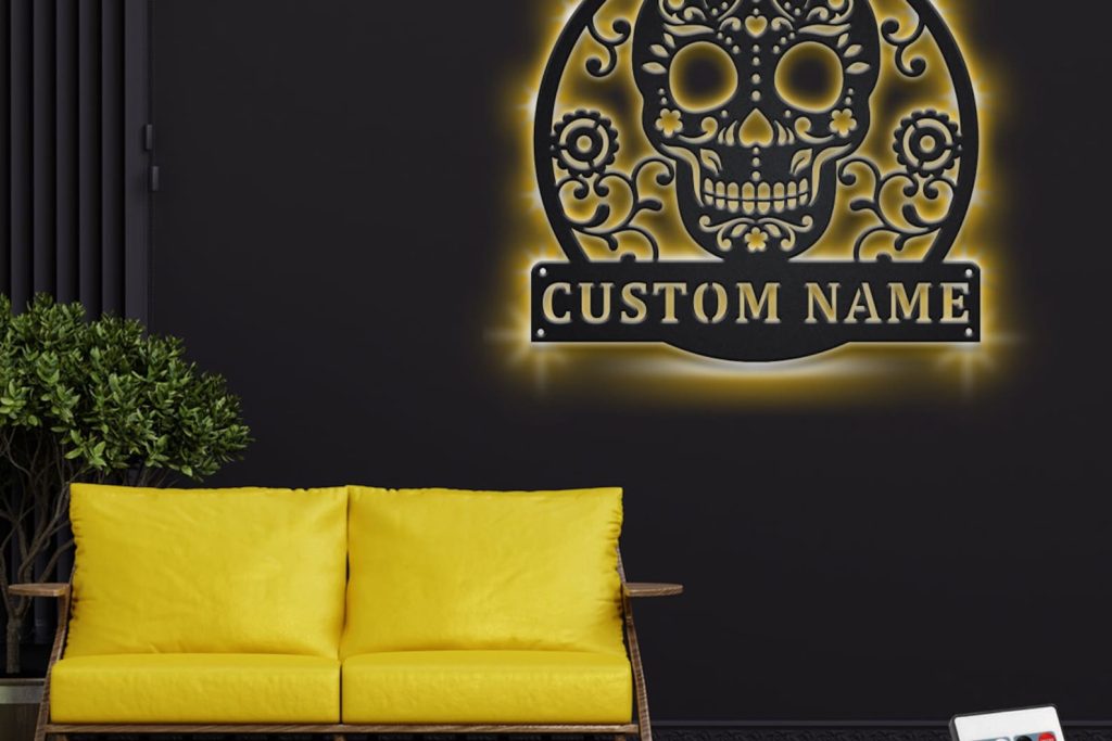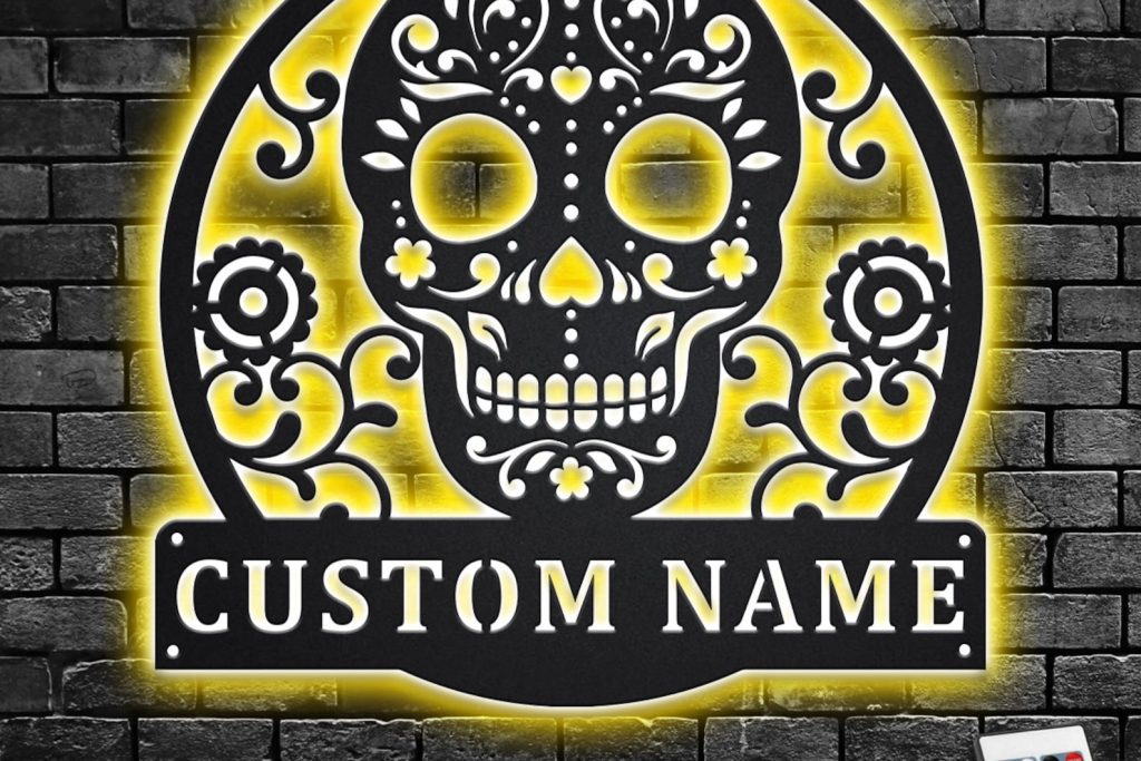 Custom Sugar Skull Metal Wall Art with LED Light, Personalized Name Sign