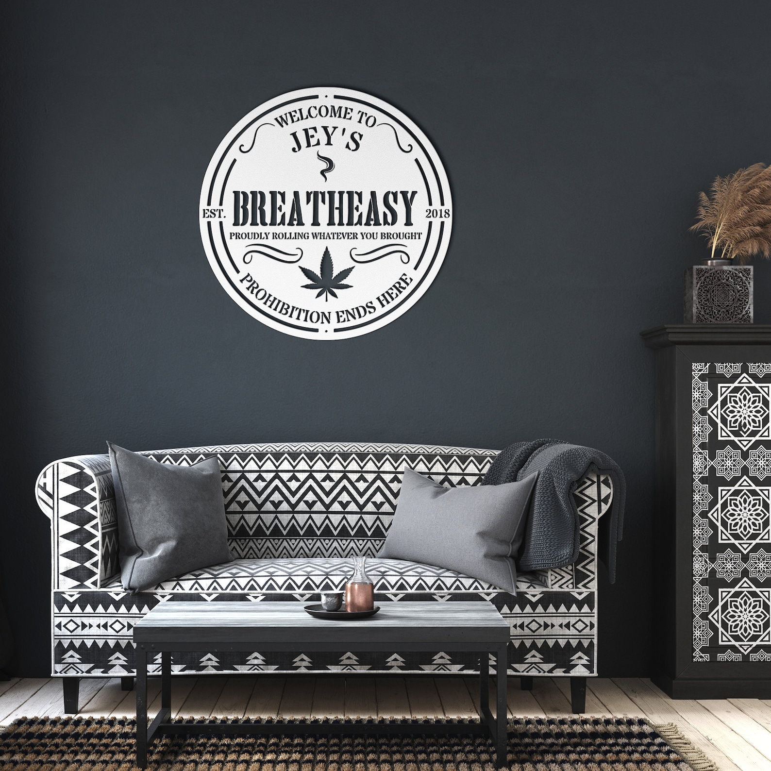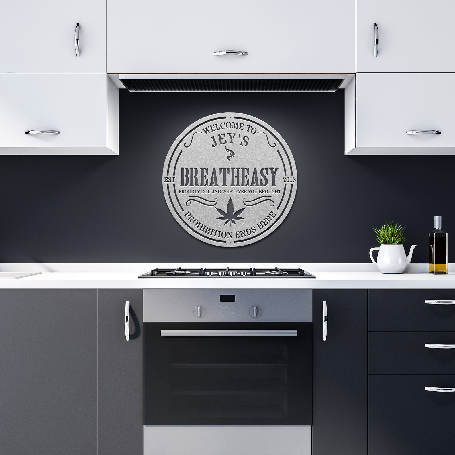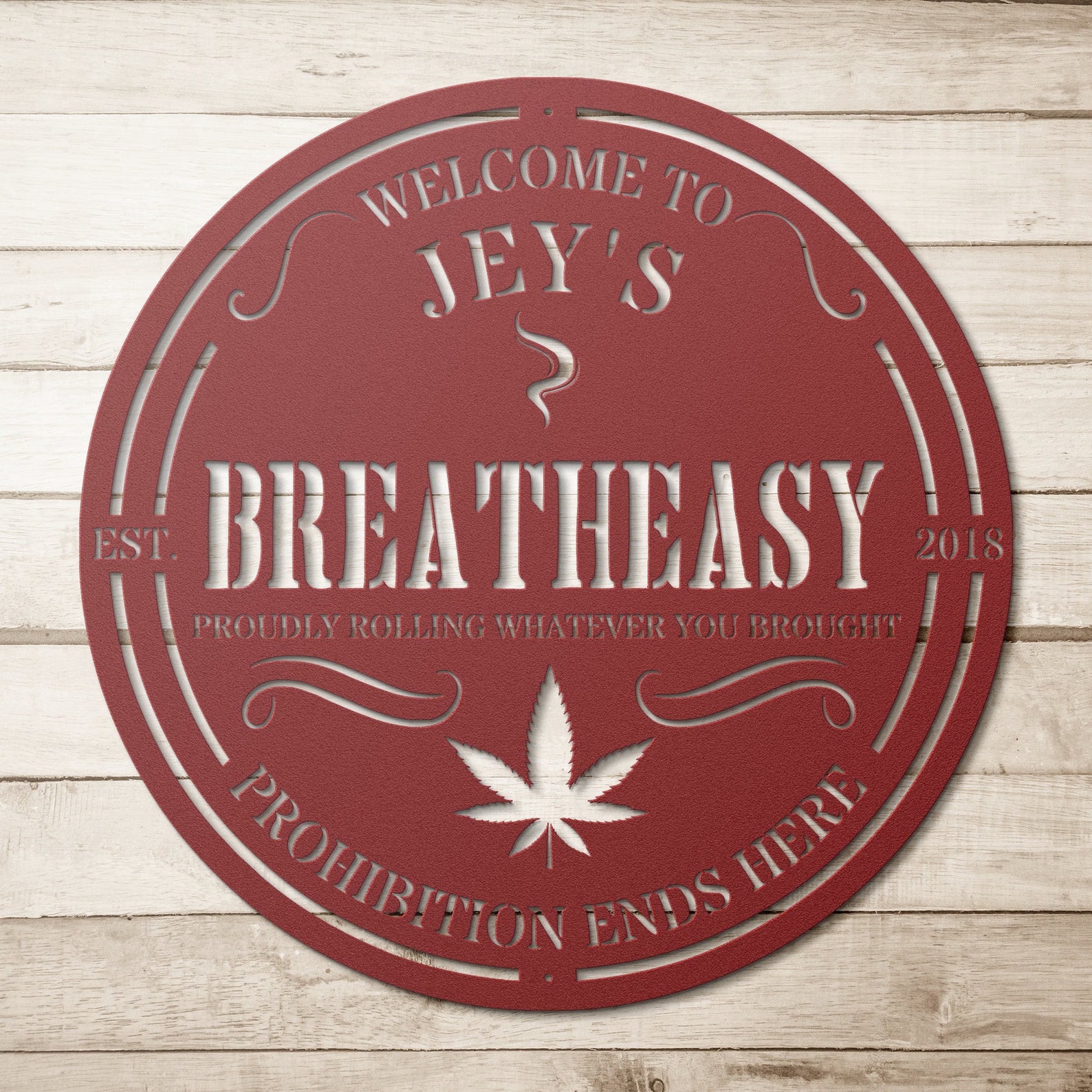 Create a secret haven for cannabis enthusiasts with this personalized "Breatheasy" cannabis-themed speakeasy sign. Crafted with intricate details and a touch of mystique, this metal sign captures the essence of the Prohibition-era speakeasies, infusing it with a modern cannabis twist. Personalize it with your name or desired message to make it uniquely yours. Hang it discreetly in your designated cannabis space or hangout, inviting like-minded individuals to unwind and indulge in a rela and welcoming atmosphere. The combination of vintage-inspired design elements and cannabis motifs adds a playful yet sophisticated touch to any room. Whether you9;re hosting intimate gatherings or seeking a private sanctuary to enjoy your favorite herb, this personalized cannabis-themed speakeasy sign sets the stage for elevated experiences and a sense of camaraderie among fellow cannabis enthusiasts.