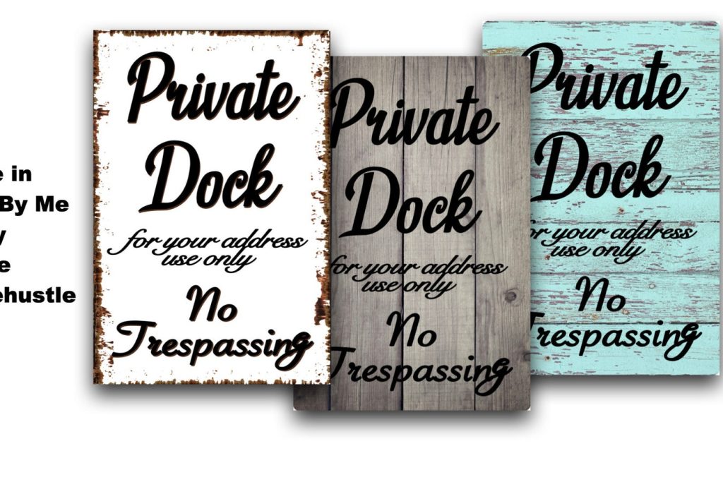 Private Dock No Trespassing – customize and choose backgrounds – Barn wood, Grey Wood, White Crackle, teal, blue etc – wood style backgrounds – Metal Sign Door Plaque – (Note not actual wood so smooth and safe to the touch)