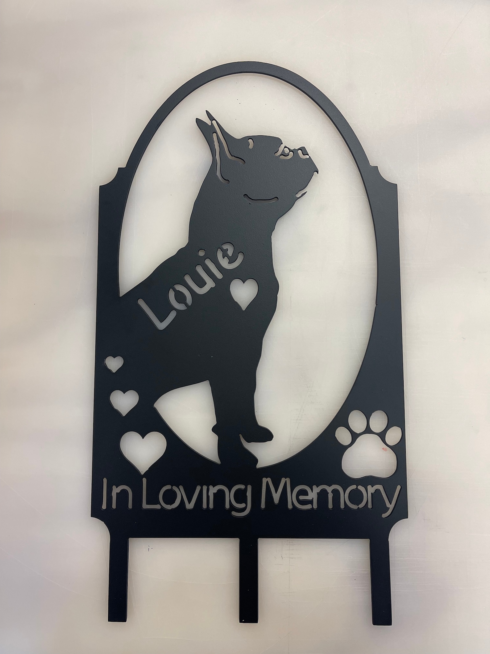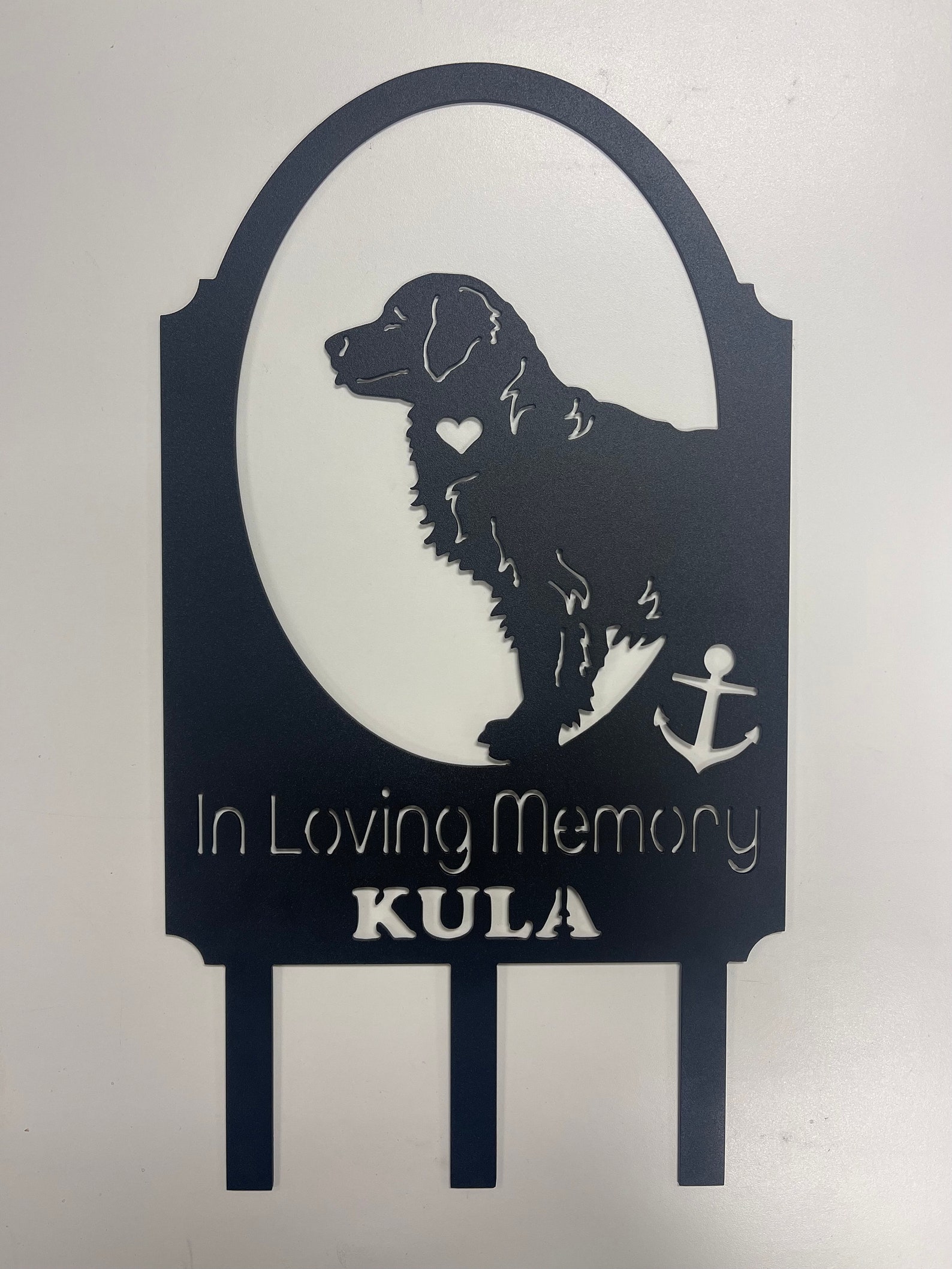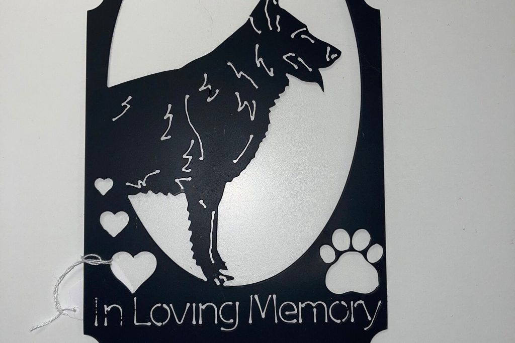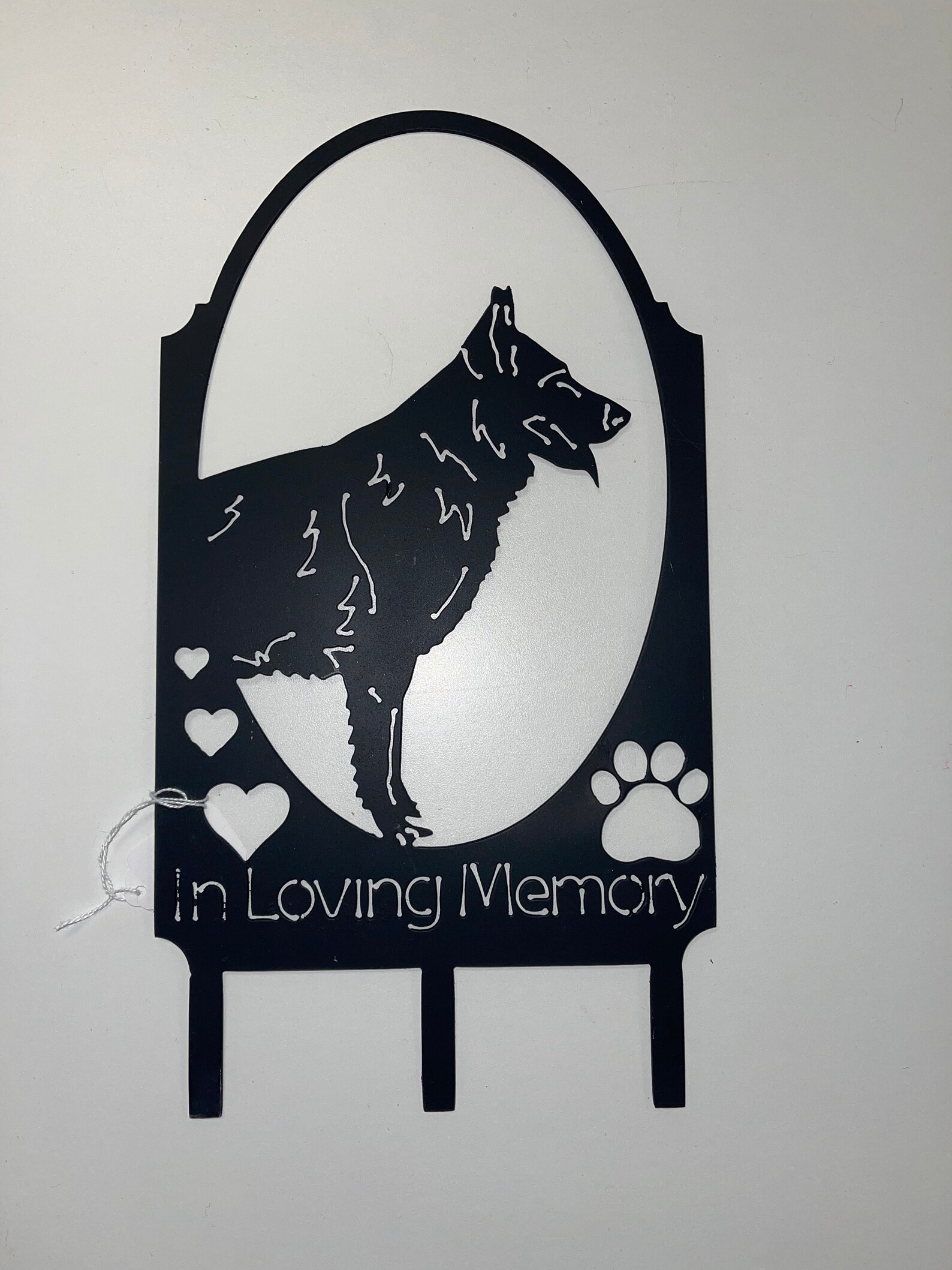 Dog Memorial Sign. Metal Dog Sign for Garden. "In Loving Memory." Always remember your beloved pet with one of our metal cut memorial signs. We can do any breed. Please specify in the personalization box. 14 gauge metal, powder coated, black. Size- 18" x 11"