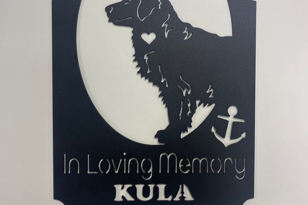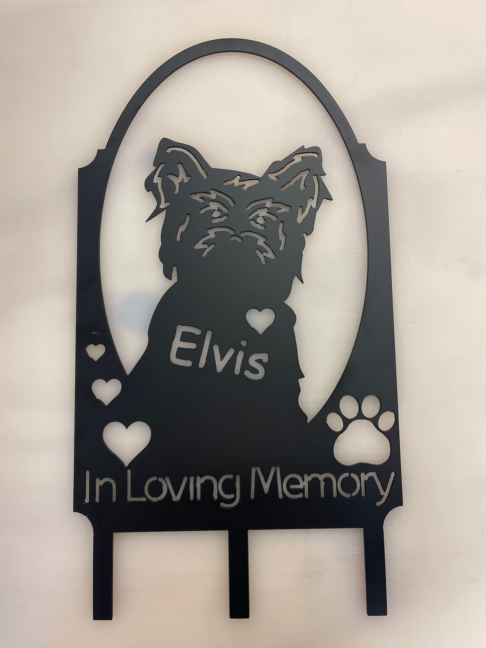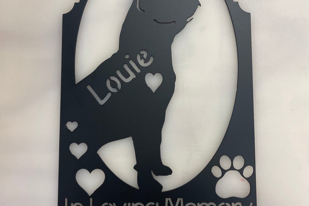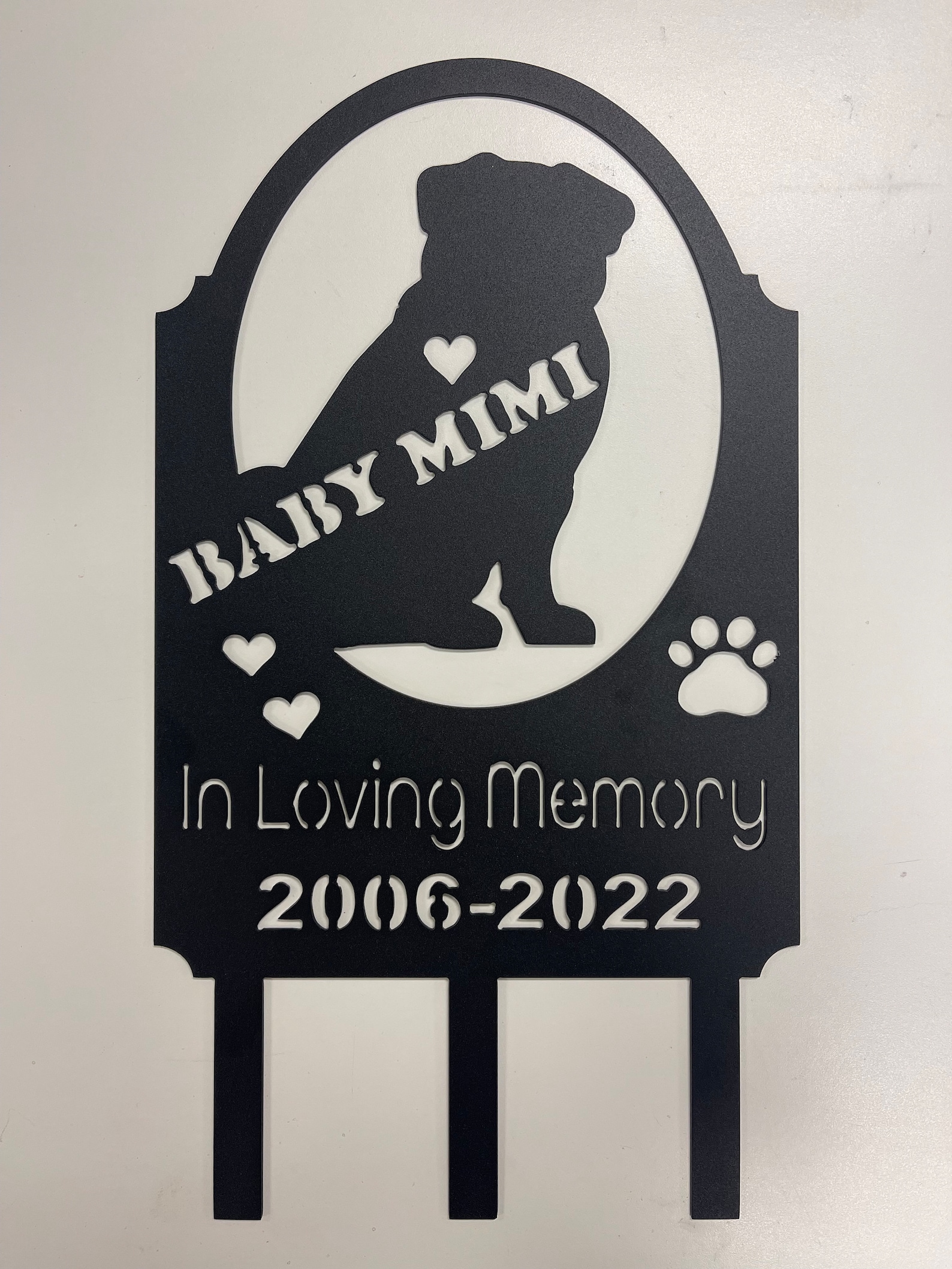 Dog Memorial Sign. Metal Dog Sign for Garden. "In Loving Memory." Always remember your beloved pet with one of our metal cut memorial signs. We can do any breed. Please specify in the personalization box. 14 gauge metal, powder coated, black. Size- 18" x 11"