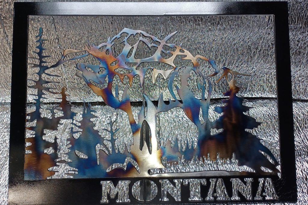 Great addition to your home or as a gift. Customize with the state of your choice, or a name to personalize with. Rocky Mountain elk nature scene finished with Black border and heat treated for the bluing effect. No two are etly the same in the that regard.