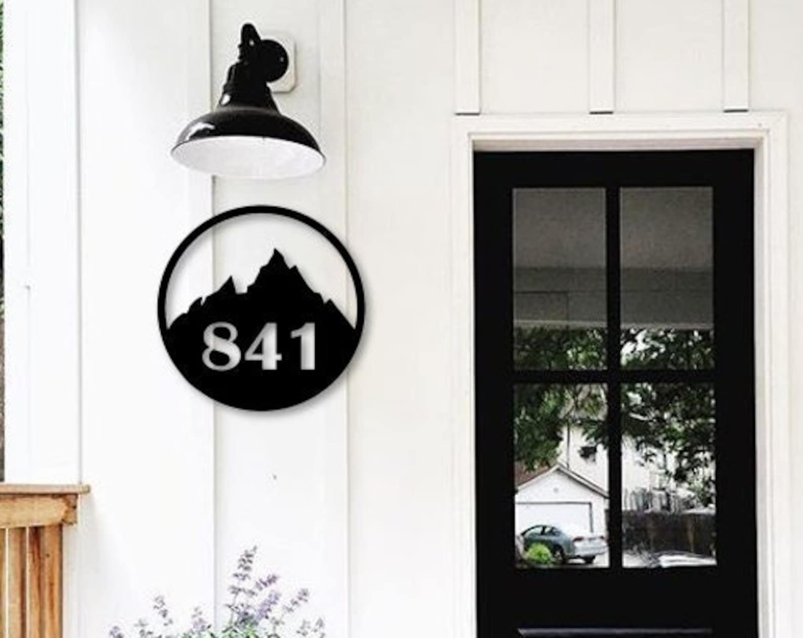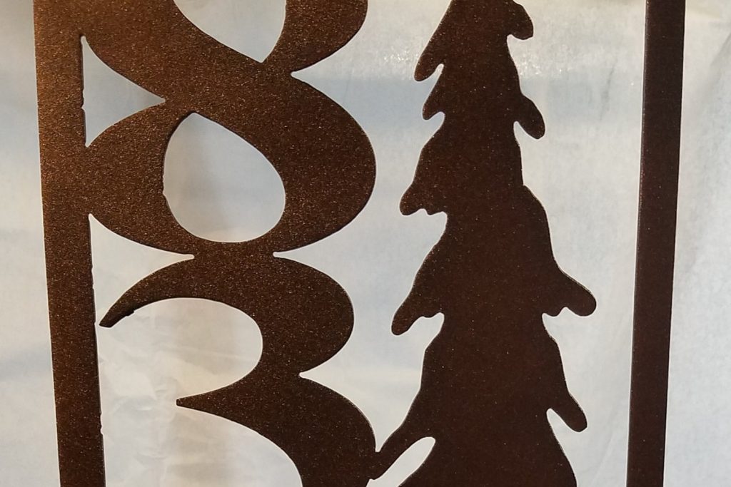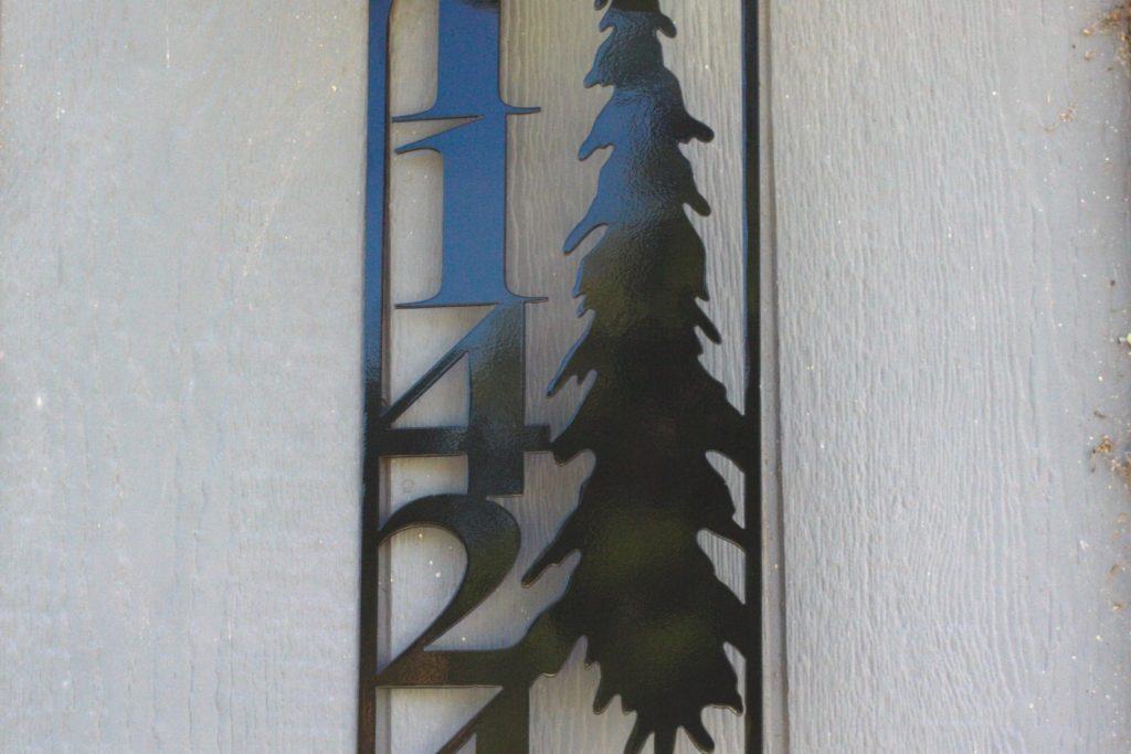 Custom designed evergreen inspired vertical metal address plate. Plasma cut from 16 gauge cold rolled steel and added holes for mounting on house or fence, screws not incl. Choose from heat blued with clear coat, shined metal with clear coat, white, black, bronze. All items are powder coated giving them lasting uv protection and durability.