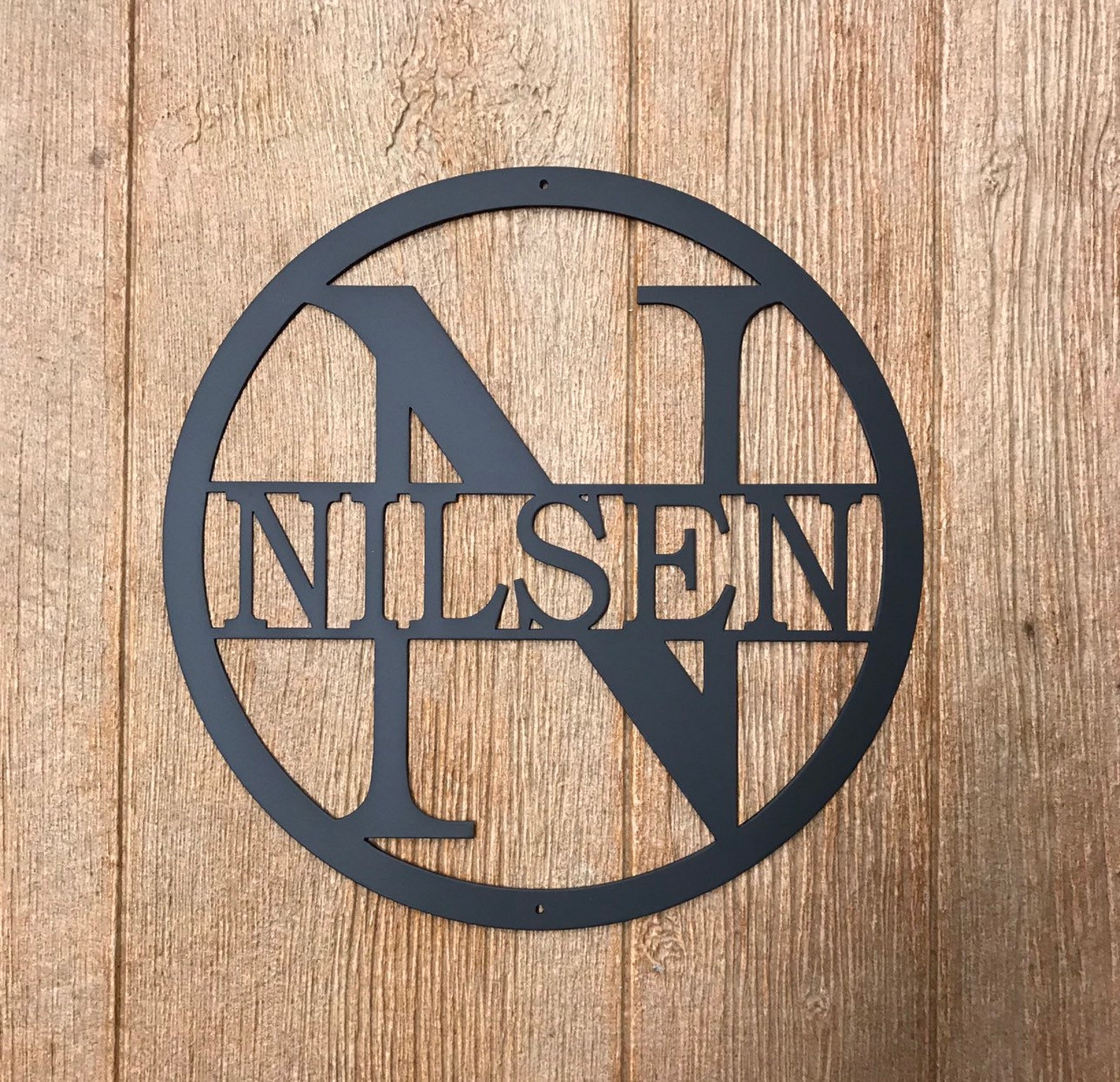 This is our monogrammed metal sign with a modern standard letter in a 15 inch diameter.
