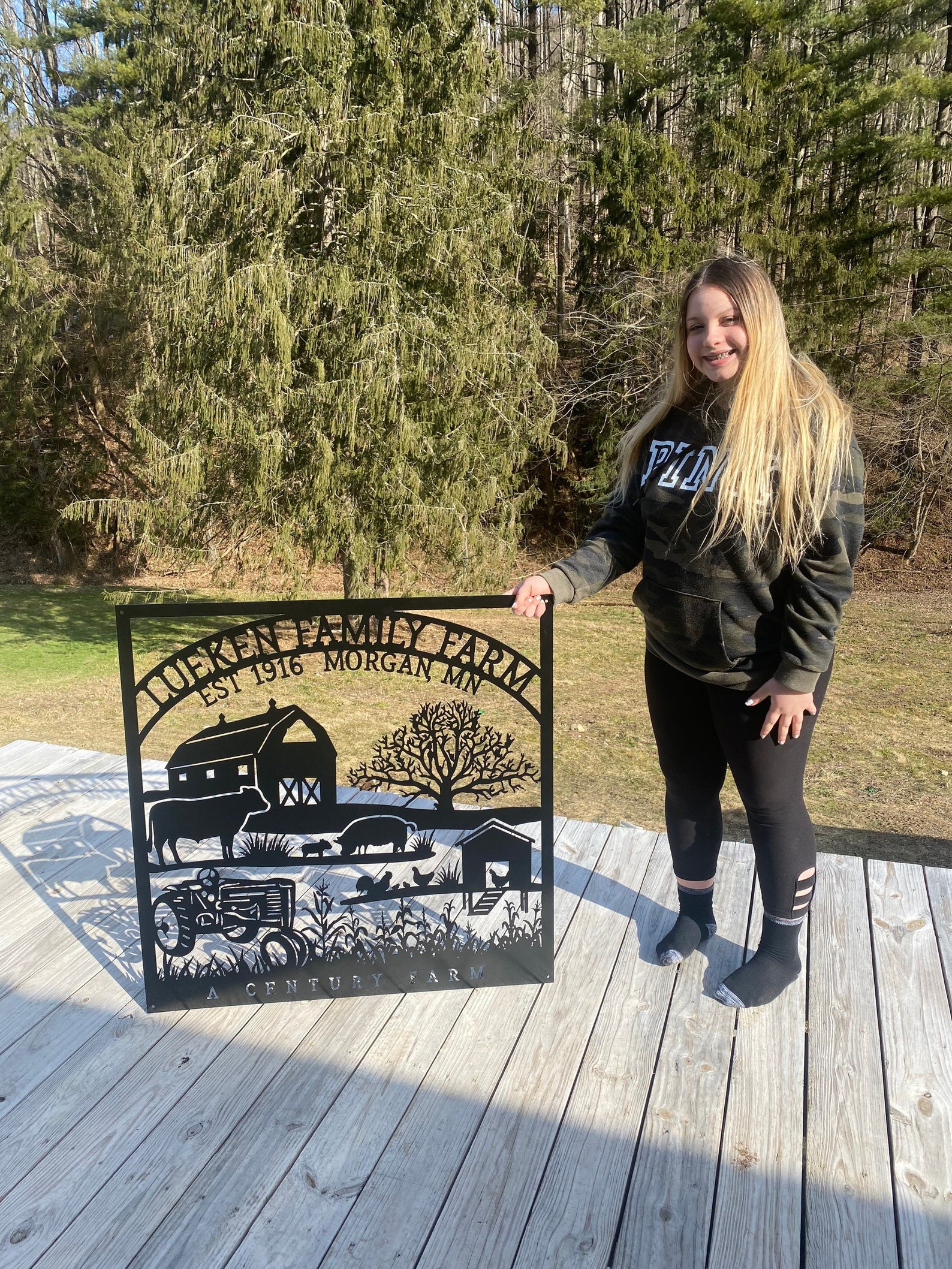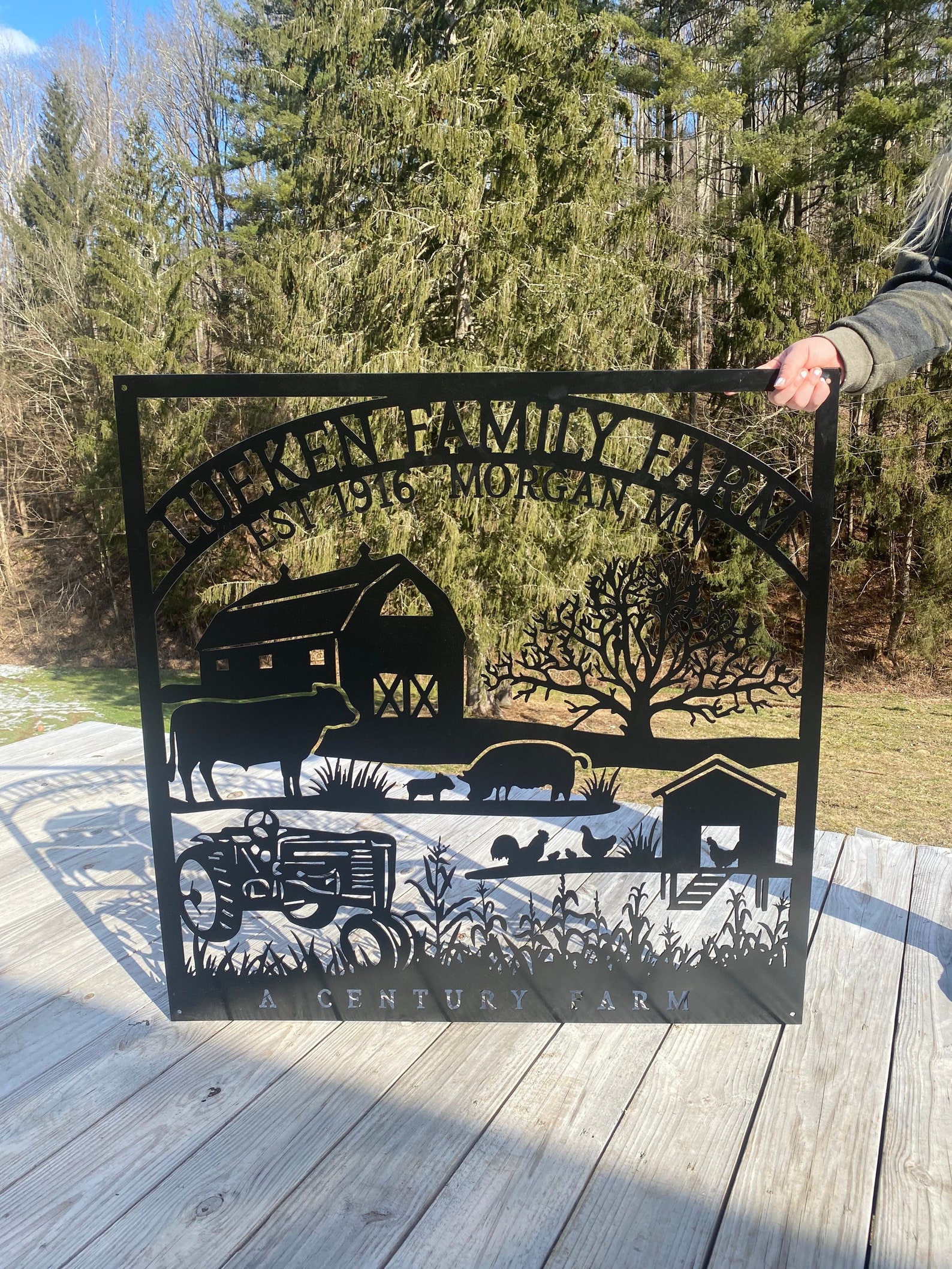 Custom metal farm sign customized for your farm, ranch, home, entrance, garden, barn or business. Our quality steel metal art is laser cut from heavy duty 14-gauge steel. Every sign is powder coated with a waterproof, rustproof finish that will stand the test of time and outdoor weather.