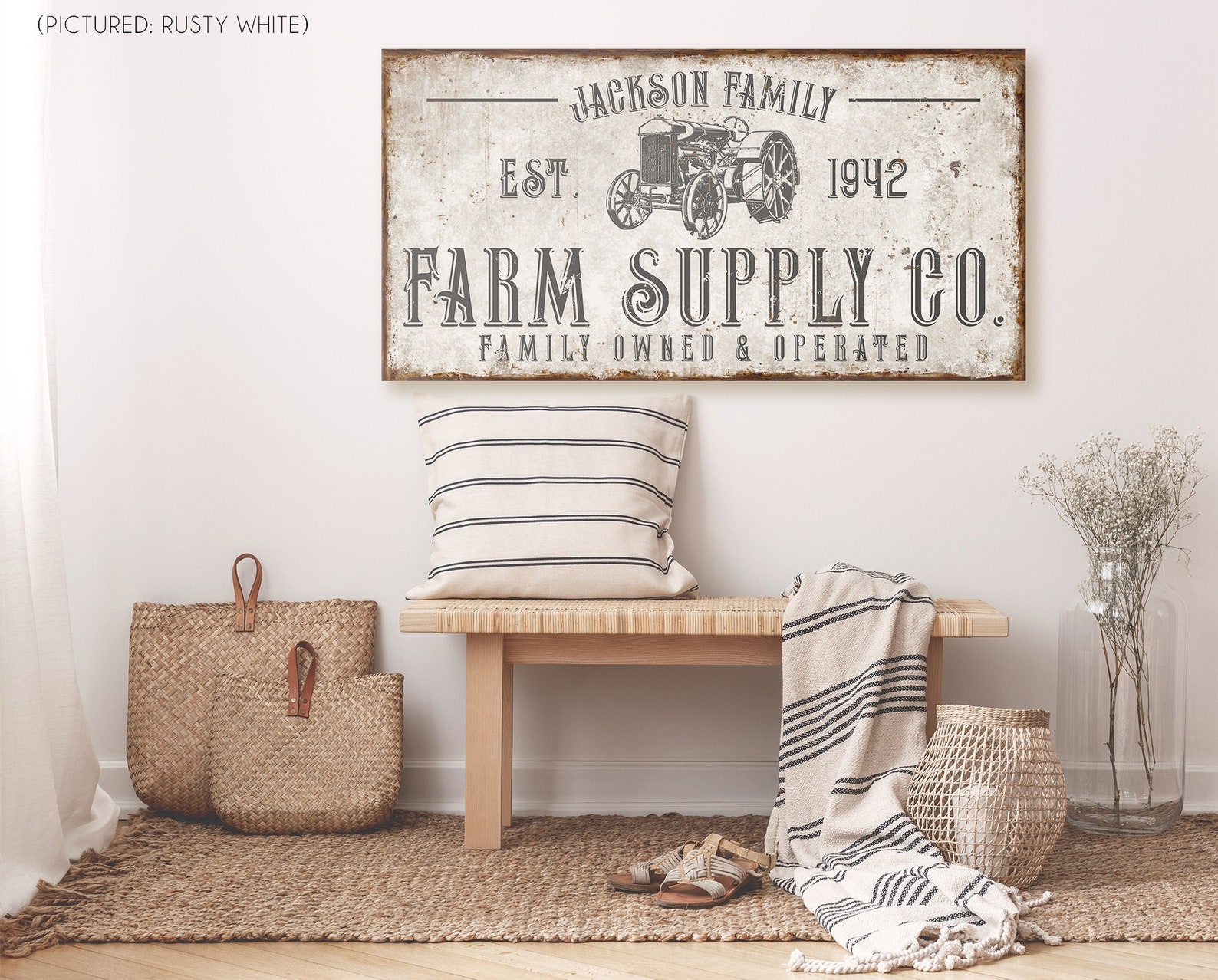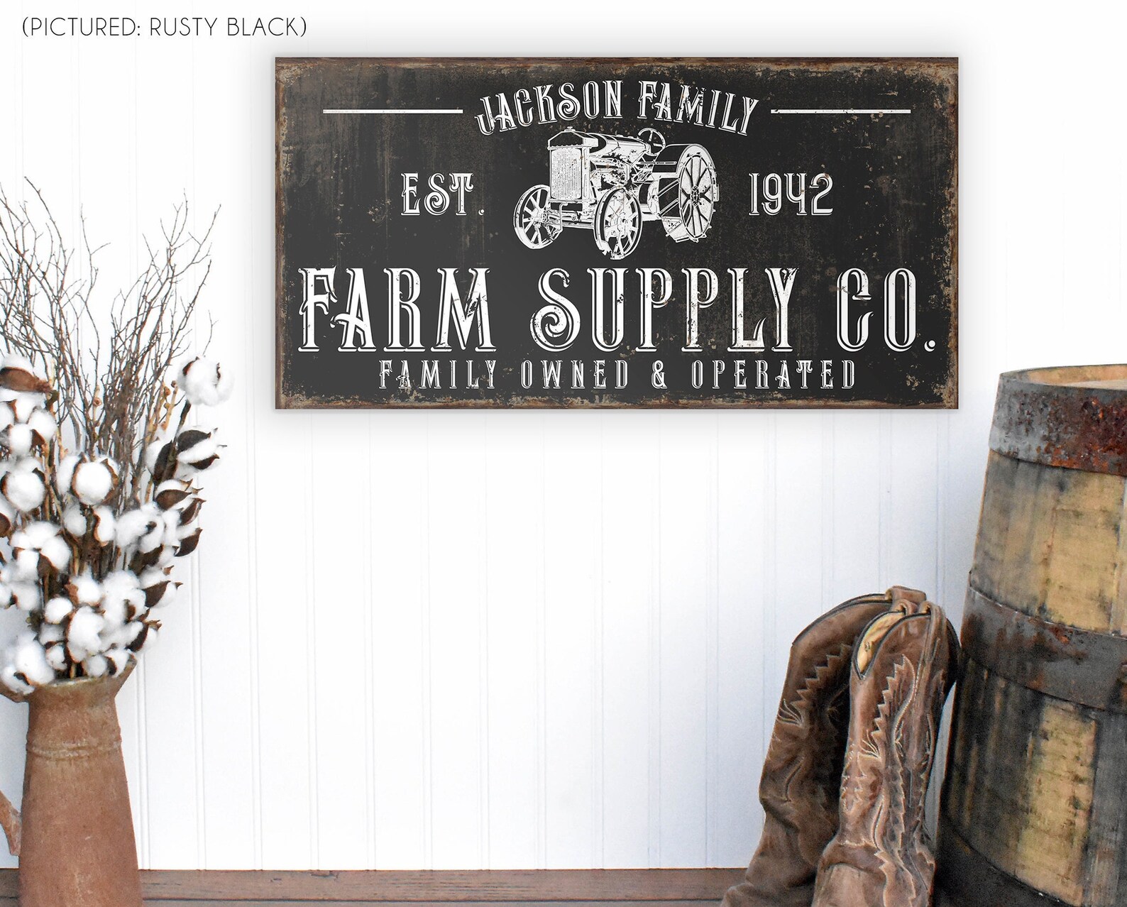 The rustic and weathered textures you see in the artwork will look the same no matter what item you order on. That means metal, wood, and canvas all have the vintage look to them!