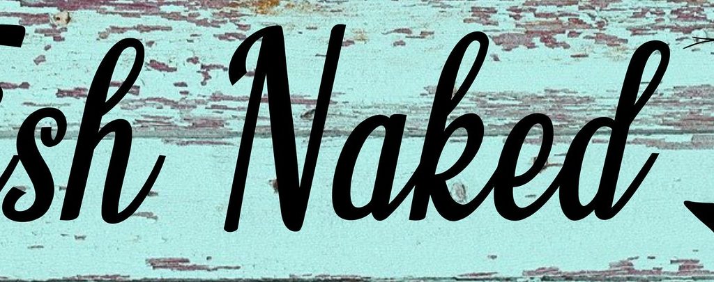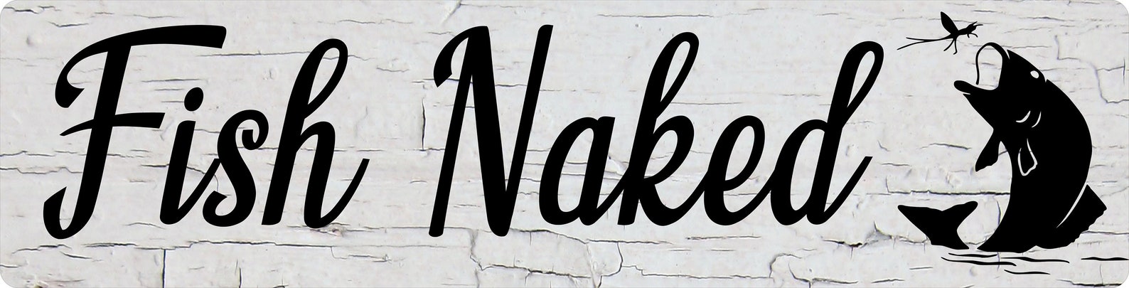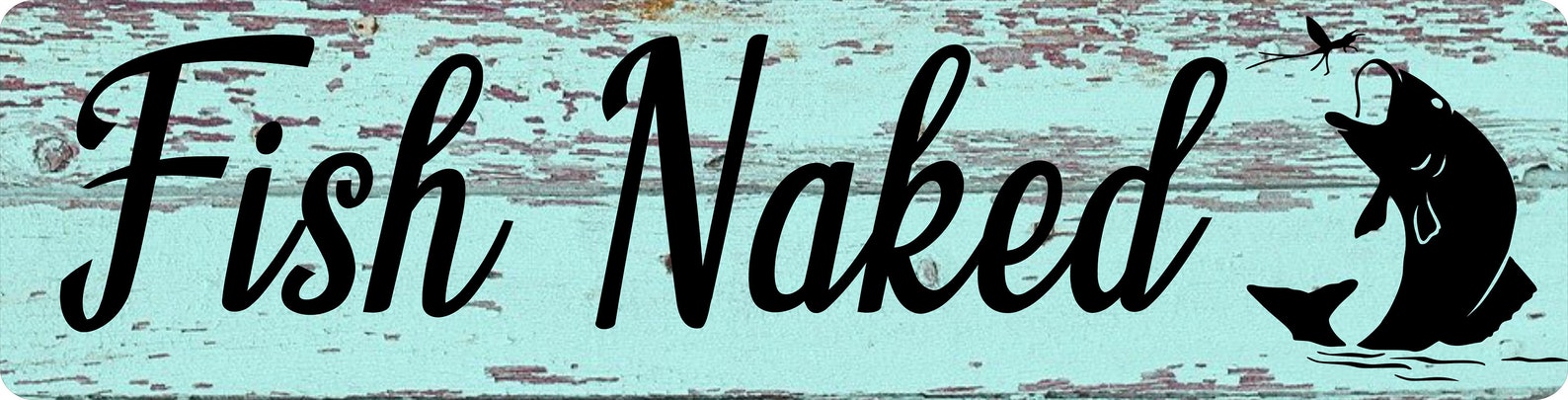 Design: Customize this Fish Naked sign by choosing from three wood style backgrounds – Metal Sign Door Plaque – (Note not actual wood so smooth and safe to the touch)