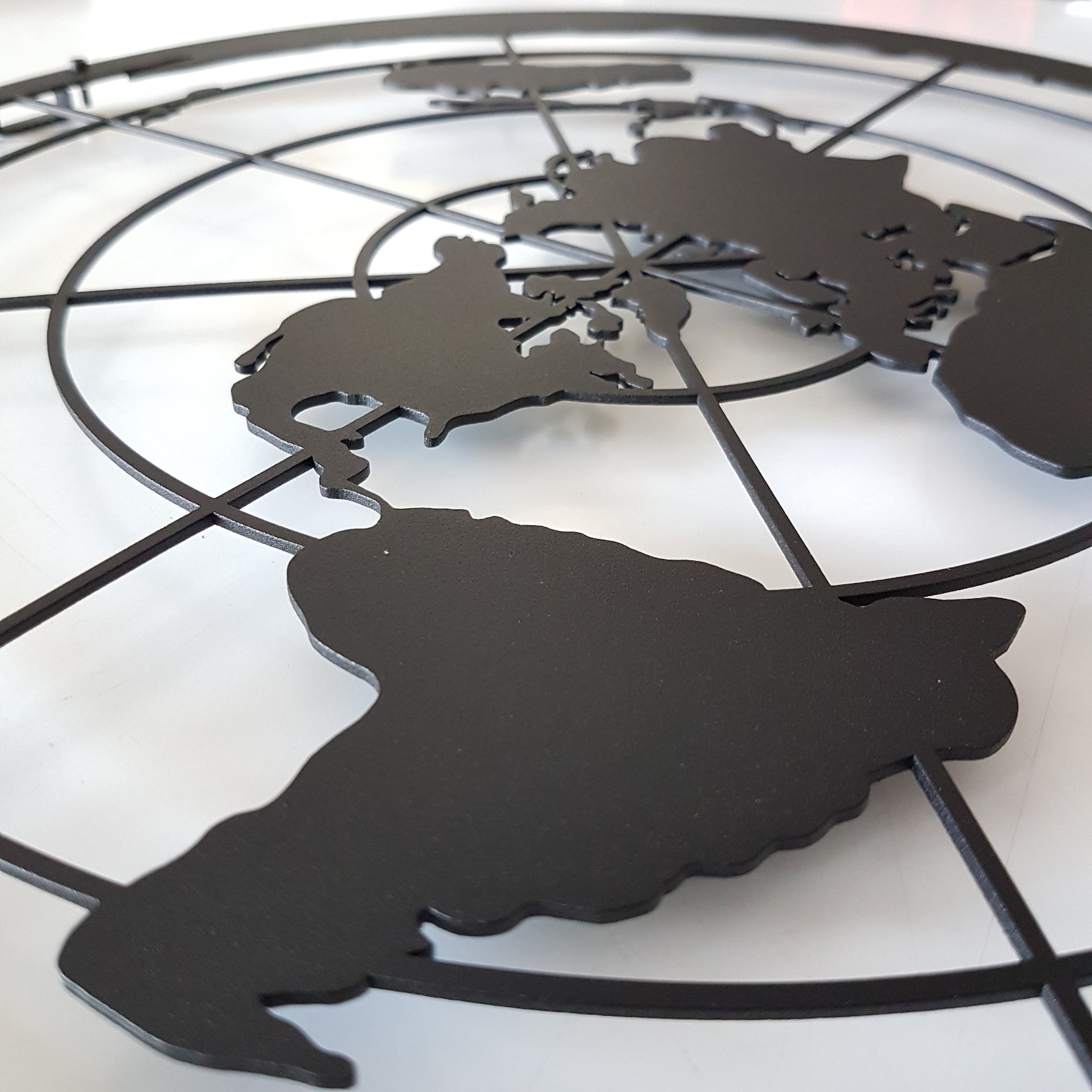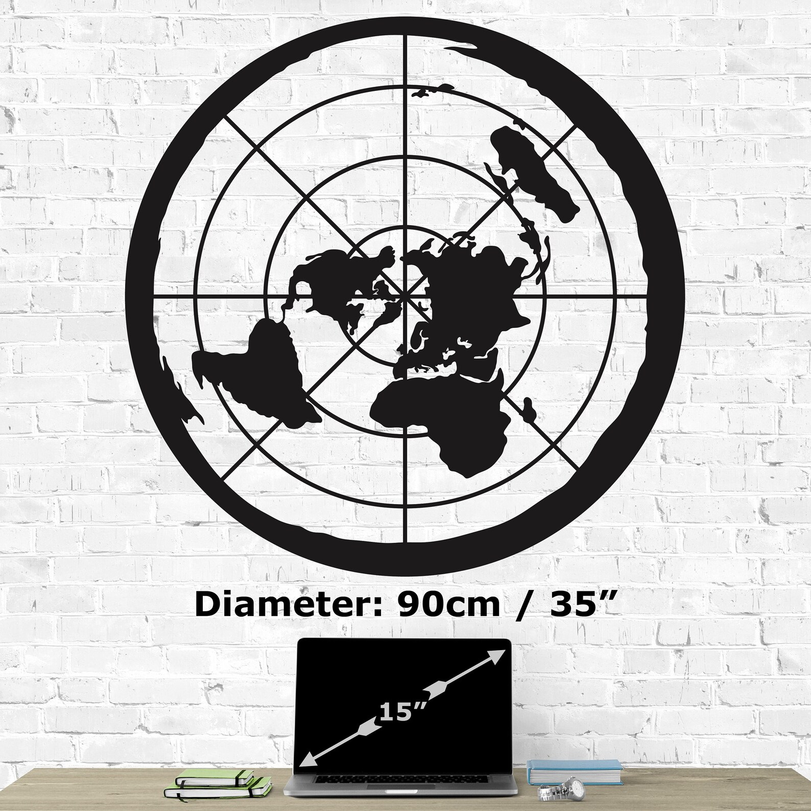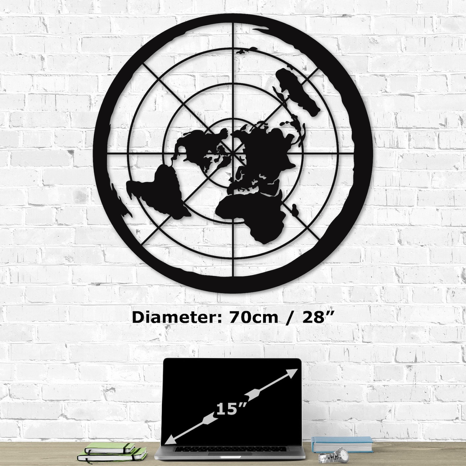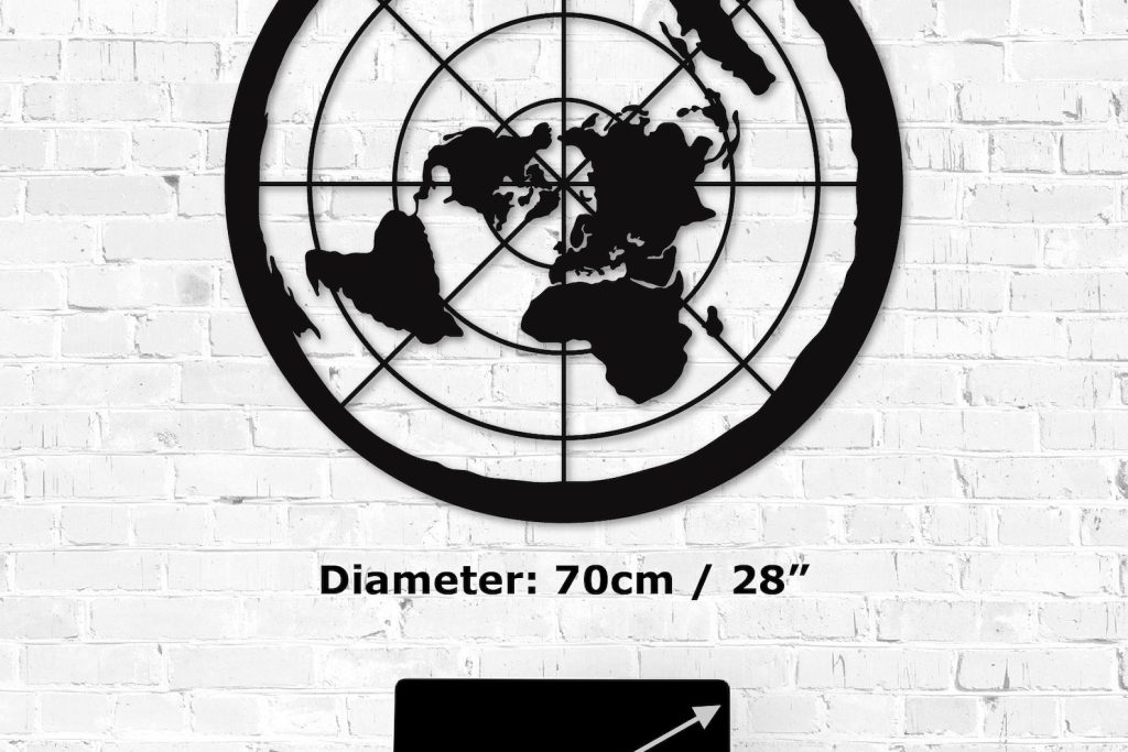 Flat Earth Metal Wall Decor: Add a touch of elegance to your home or office with this Metal Wall Art. Crafted from 0.08" thick iron sheet, this wall decor is durable and long-lasting. The Azimuthal Metal World Map design is perfect for any room, from the entryway to the living room, and even the workshop. The black color complements any decor, making it a great addition for any occasion. This wall decor is easy to install and requires no additional parts. Display your love for travel and geography with this metal world map.