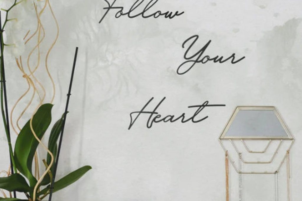 Striking portrayal of "Follow Your Heart" in metal wall art form, perfect for adding a touch of inspiration to any room.