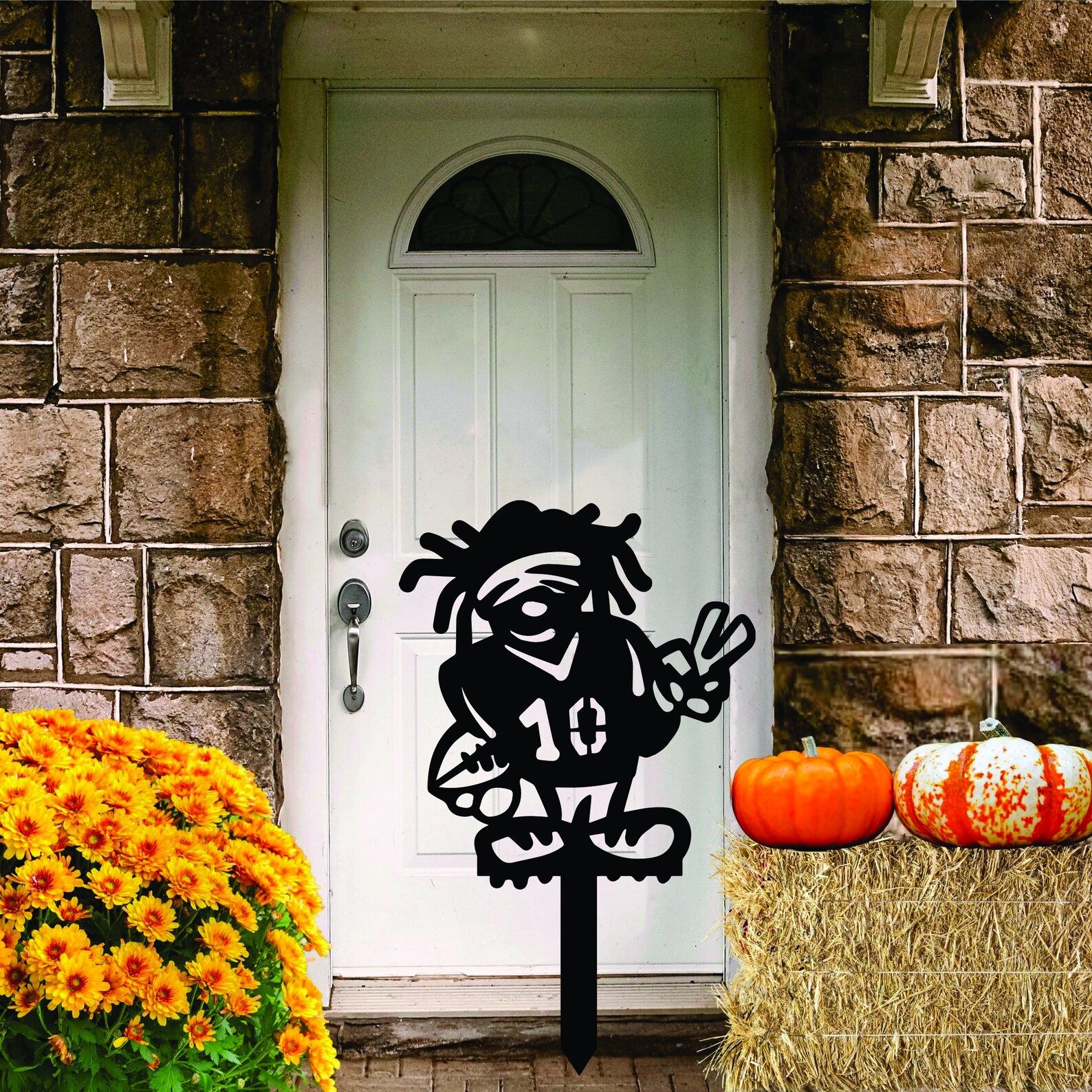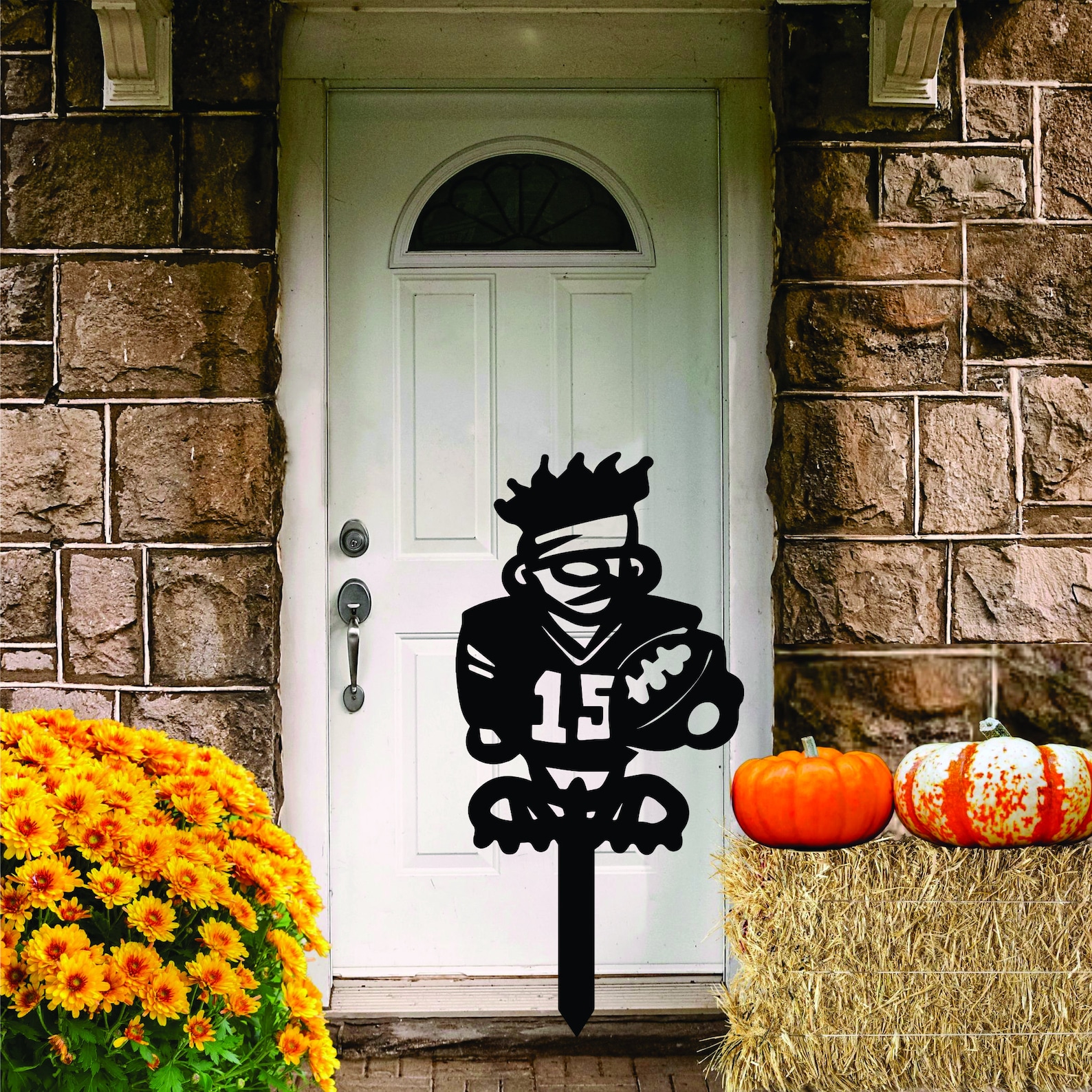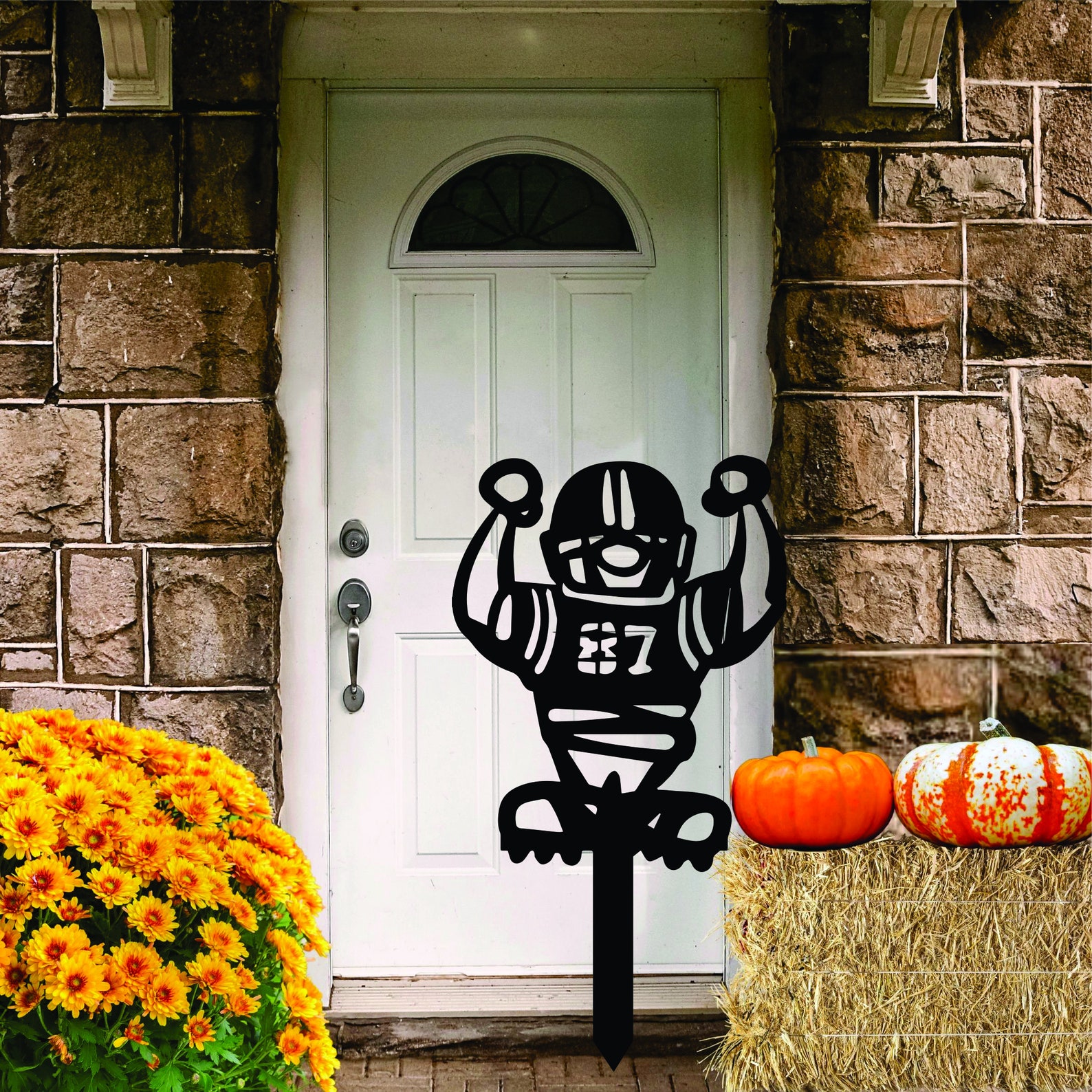 Football Fan Deluxe!! Large, heavy metal Football dude yard stake. These puppies are HEAVY, DURABLE, powder coated to last a lifetime. Stands roughly 24 inches tall. Perfect for adding your players number on the front. Great for school players, as well as promoting favorite professional player. Place the whole team in the front yard if you like.