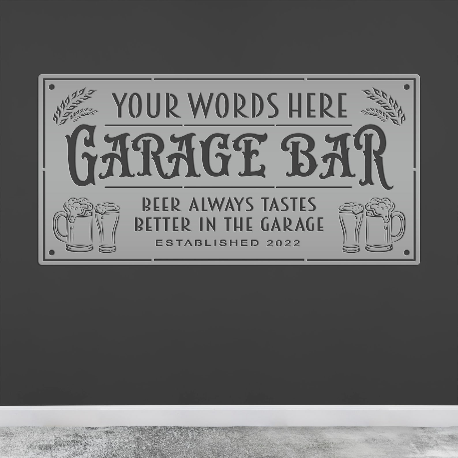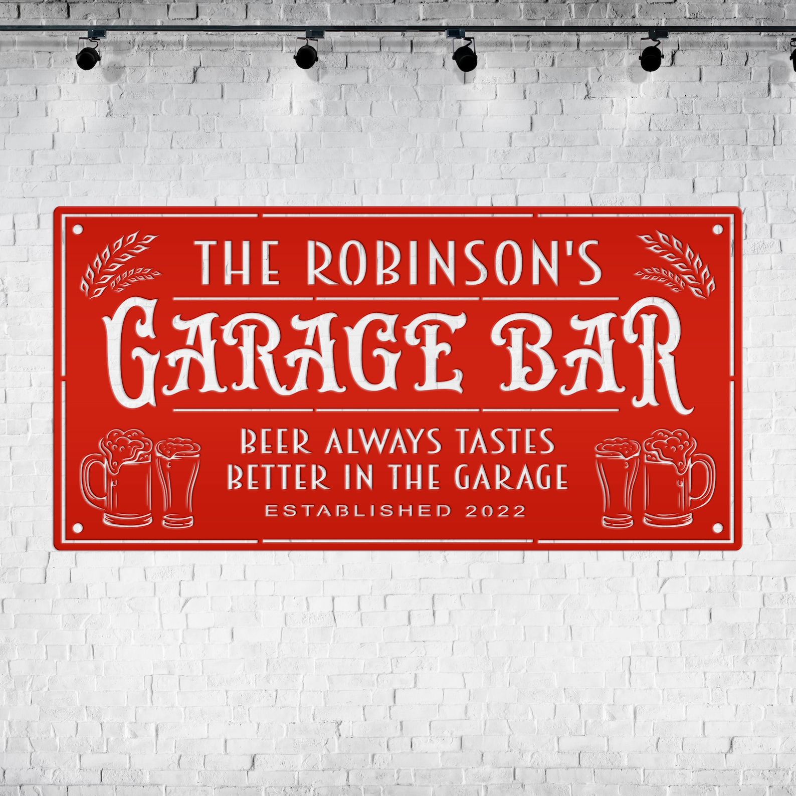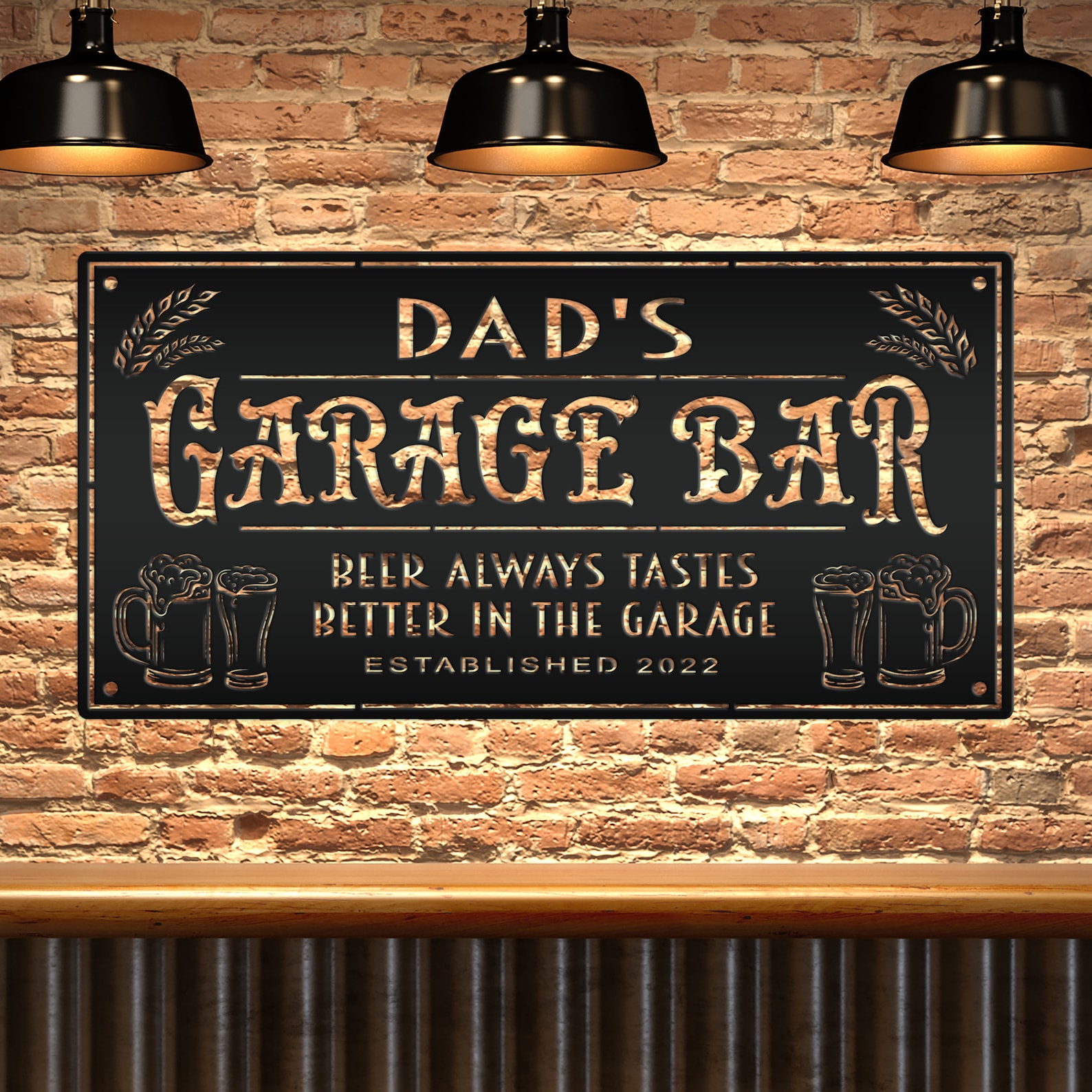 This custom garage bar sign is perfect for any man cave or garage. The personalized metal garage sign features a rectangle design with your own custom wording. It9;s the perfect addition to any home bar, shop, man cave, and makes a great gift for Father9;s Day or any other special occasion. Hang it on the wall or use it as a door hanger to show off your favorite beer drinking hole.