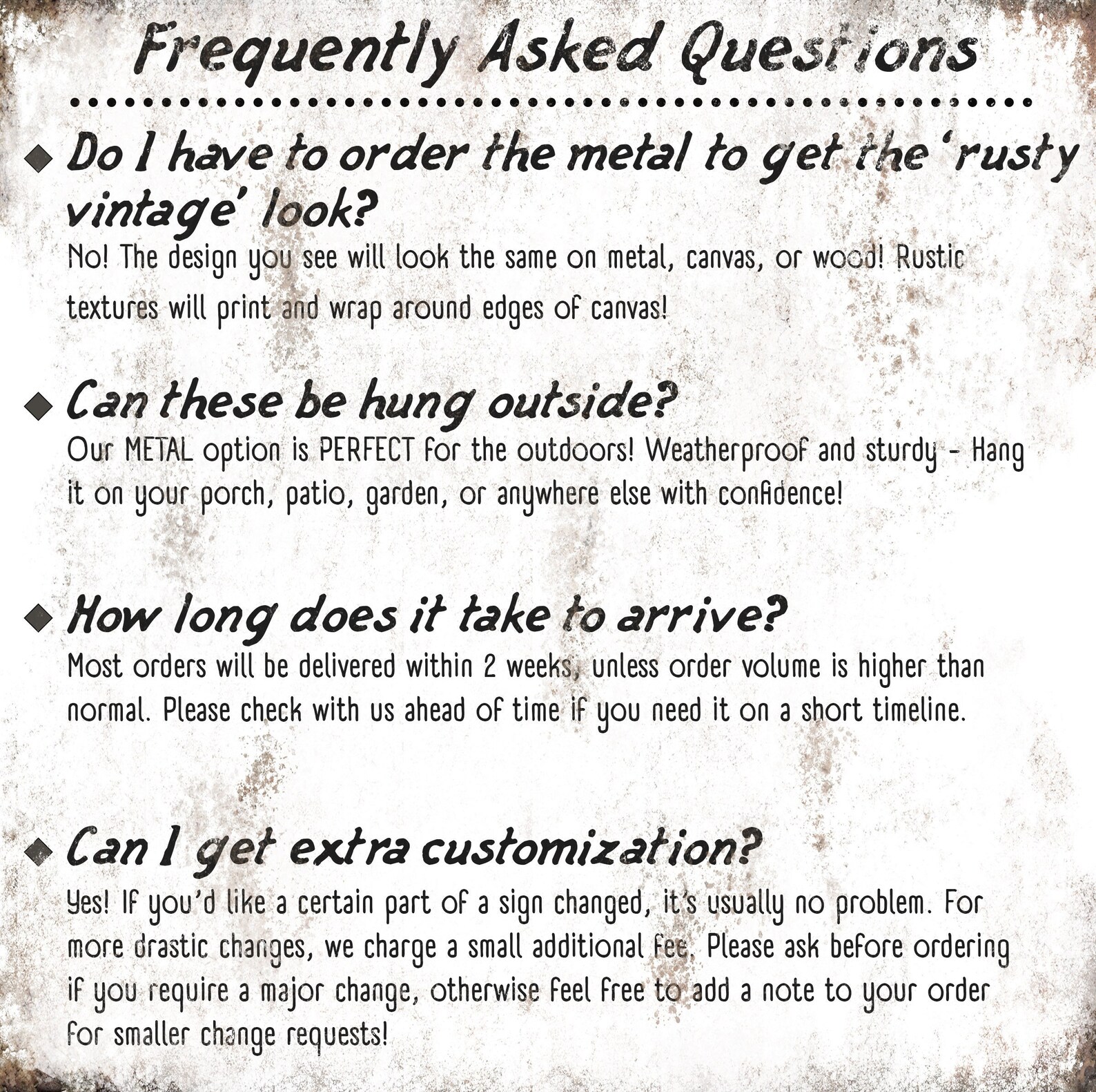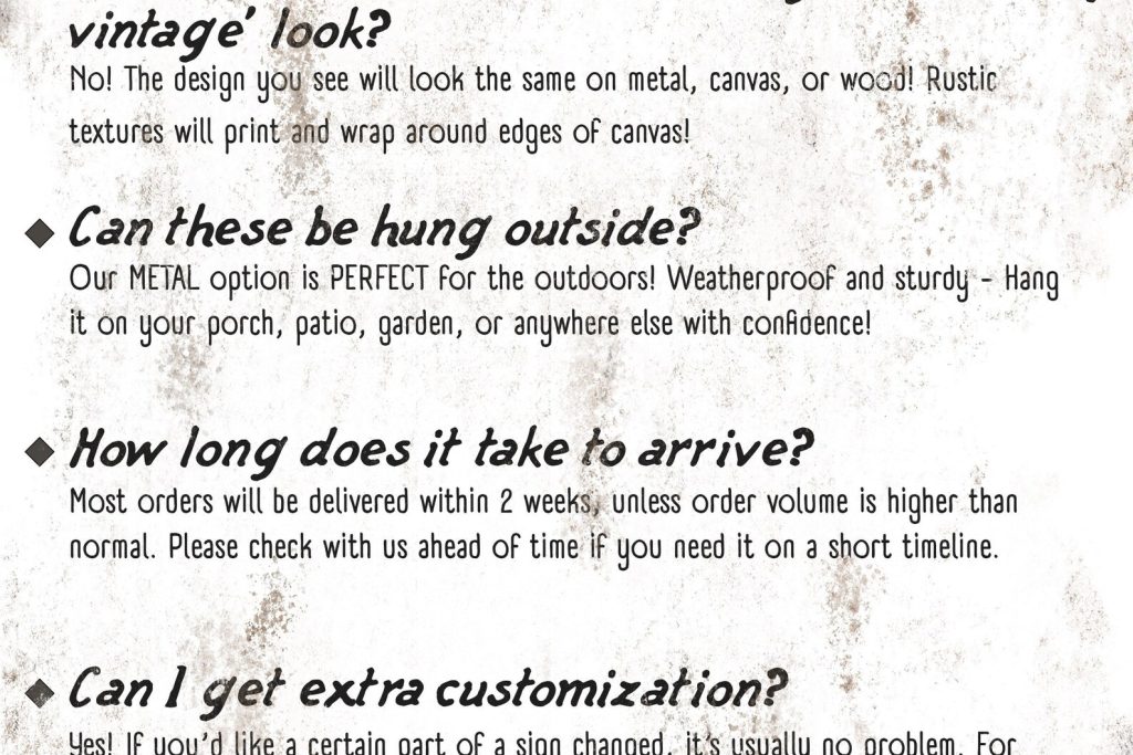 The rustic and weathered textures you see in the artwork will look the same no matter what item you order on. That means metal, wood, and canvas all have the vintage look to them!