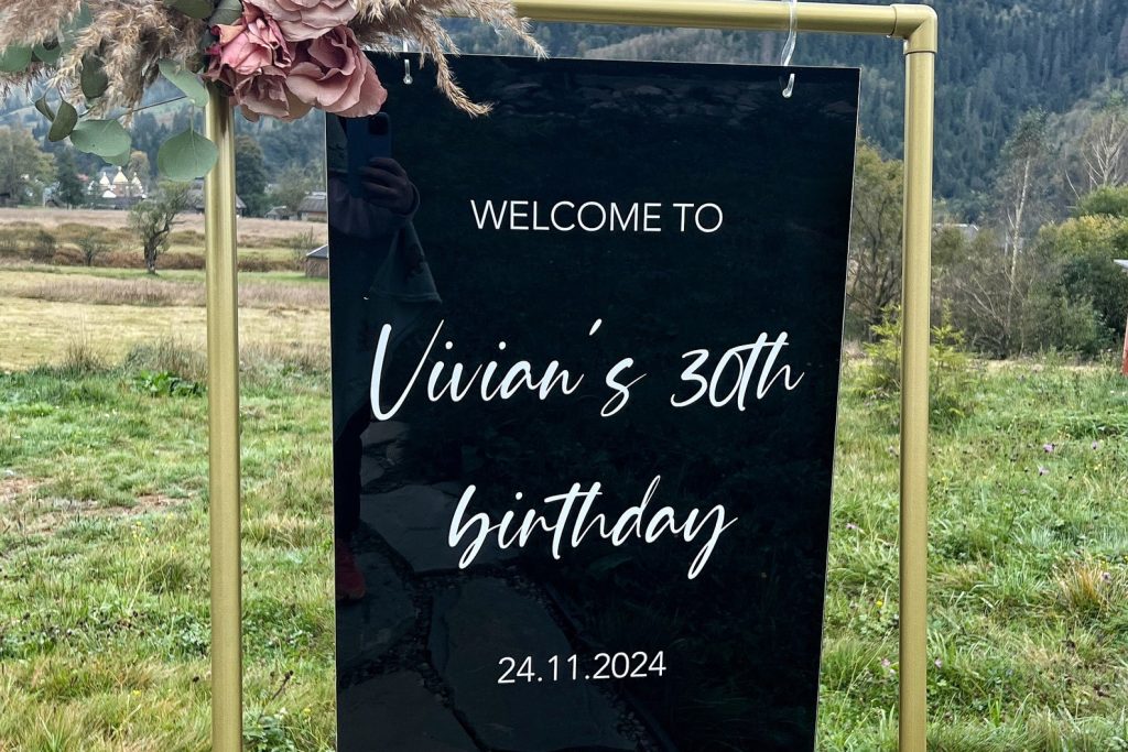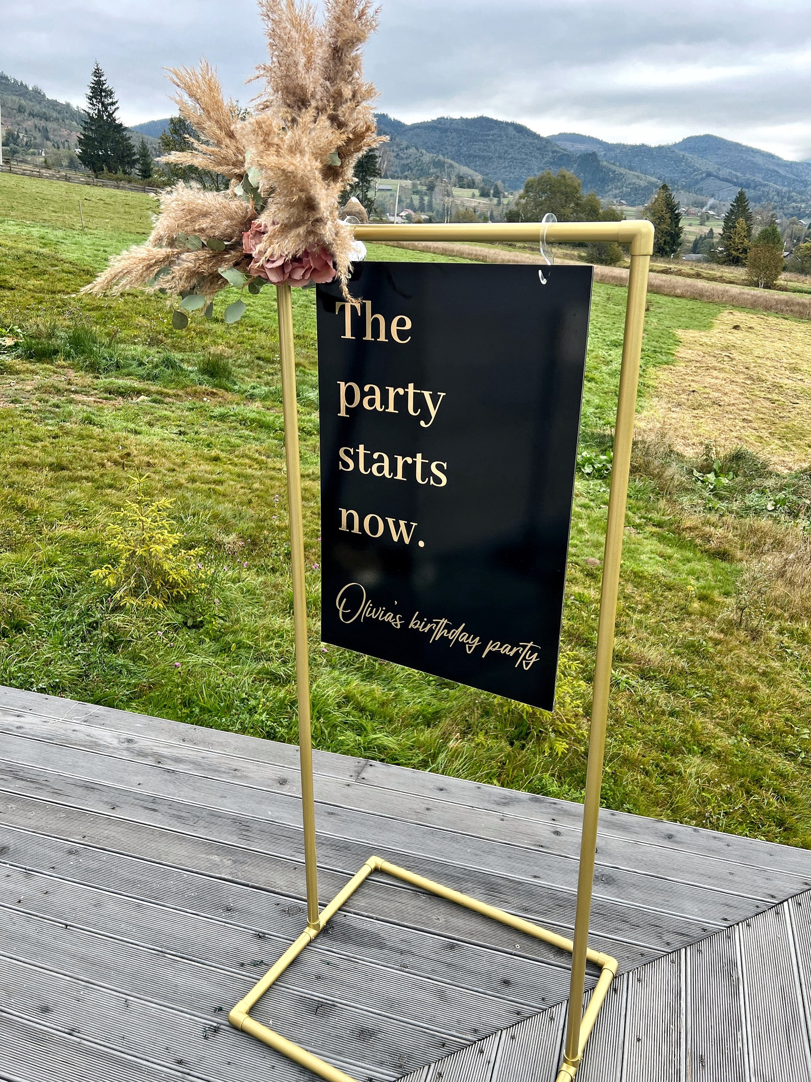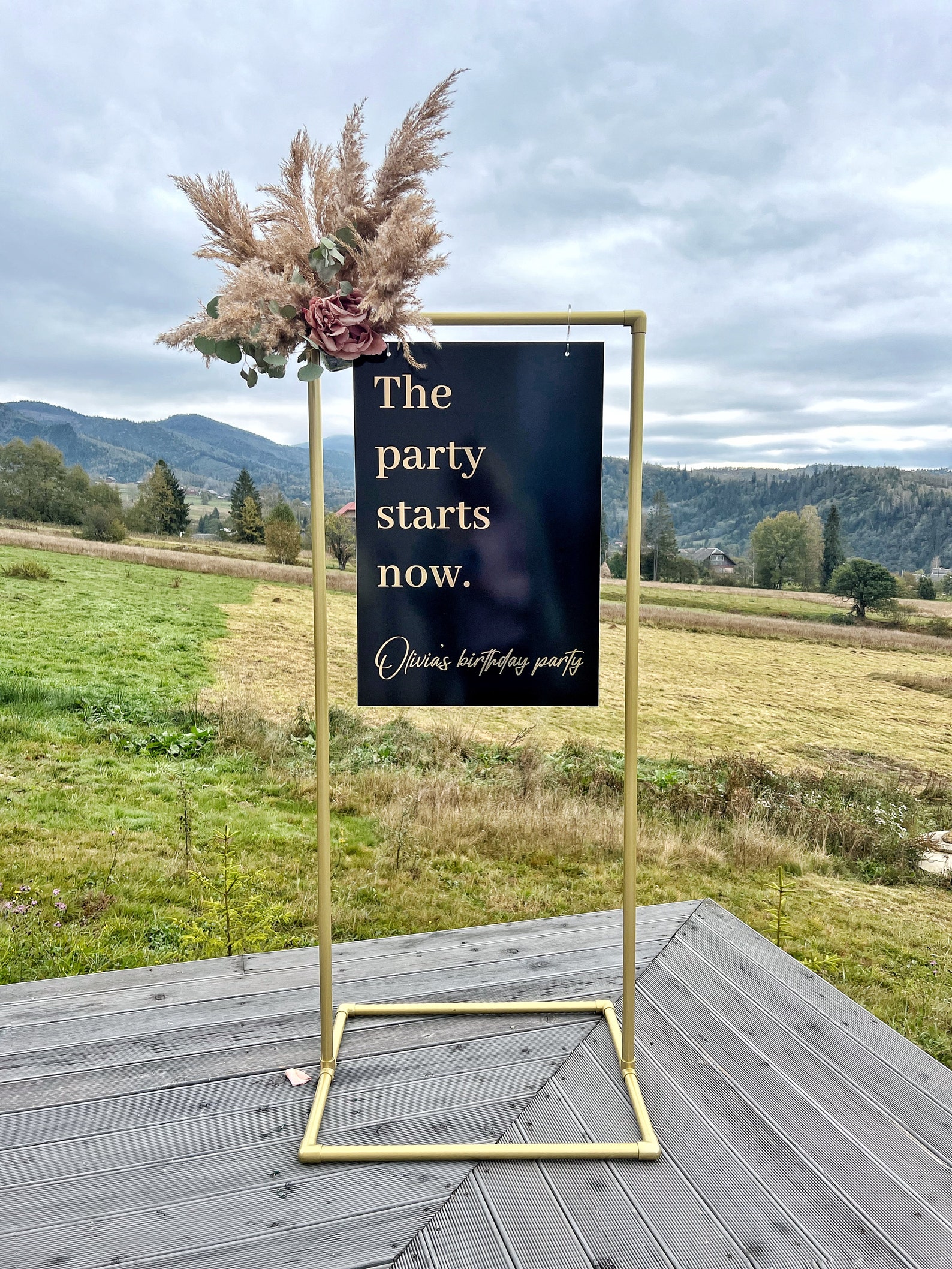 This Gold Metal Stand, Ceremony Backdrop Arch, Welcome Sign with our acrylic wedding sign is the perfect detail for your Wedding, Anniversary, Baby Shower or any other Event.