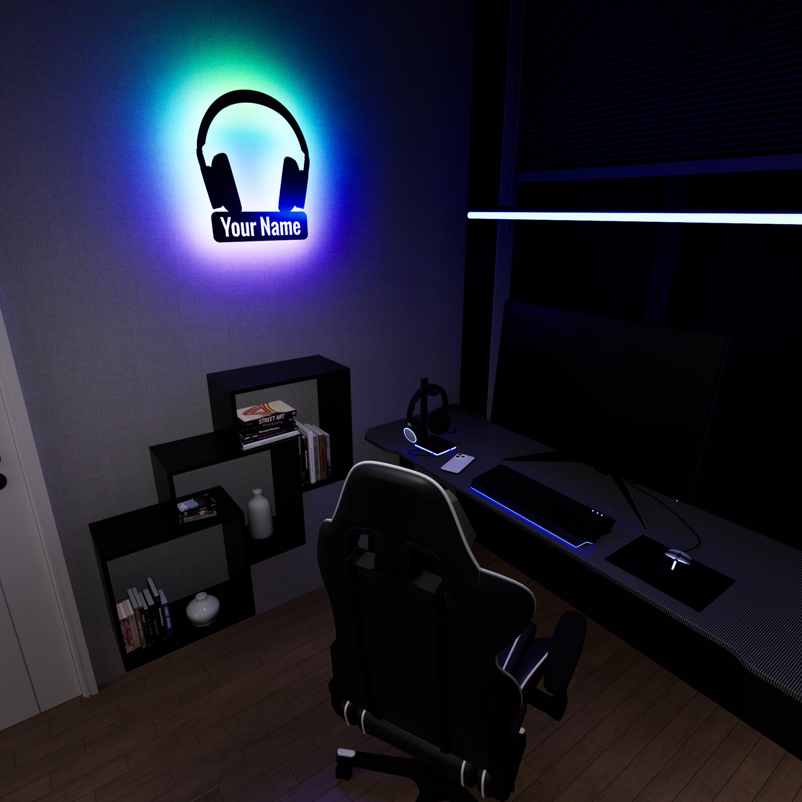 Illuminate your space with our Wireless Headphone RGB LED metal wall sign, where every detail is under your control. Crafted with precision from high-quality MDF or Metal, this wall sign adds a touch of elegance to any room. Personalize it with your name and let the vibrant RGB lighting create an atmosphere that suits your every mood.