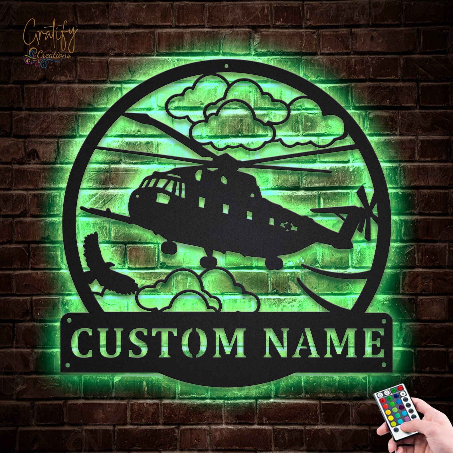 Crafted from high-quality metal, this helicopter wall sign is durable and long-lasting. The addition of LED lights makes it even more eye-catching and adds a touch of modernity to the piece. This helicopter name sign is fully customizable, so you can add the recipient9;s name or a special message to make it truly one-of-a-kind.