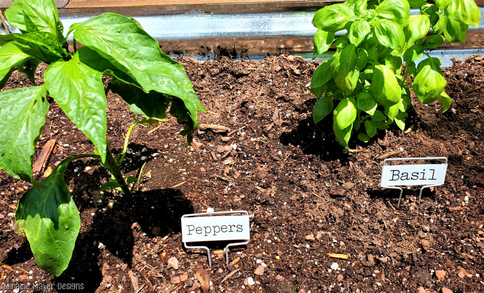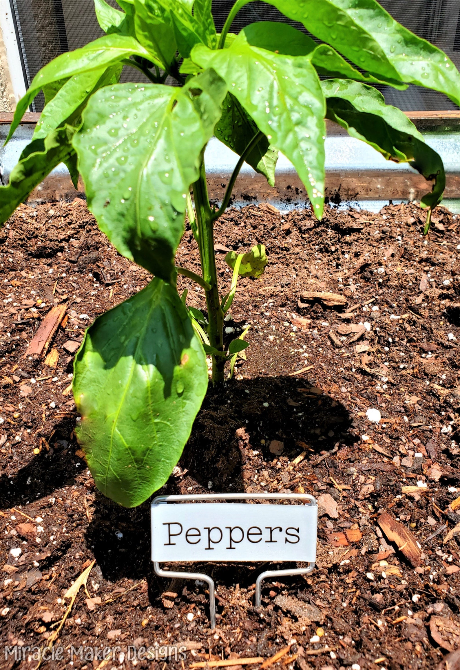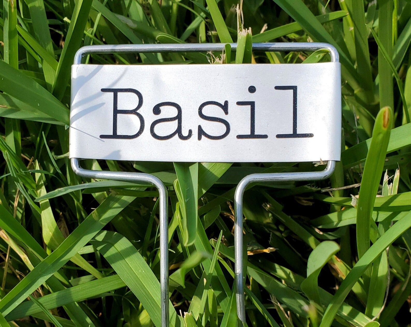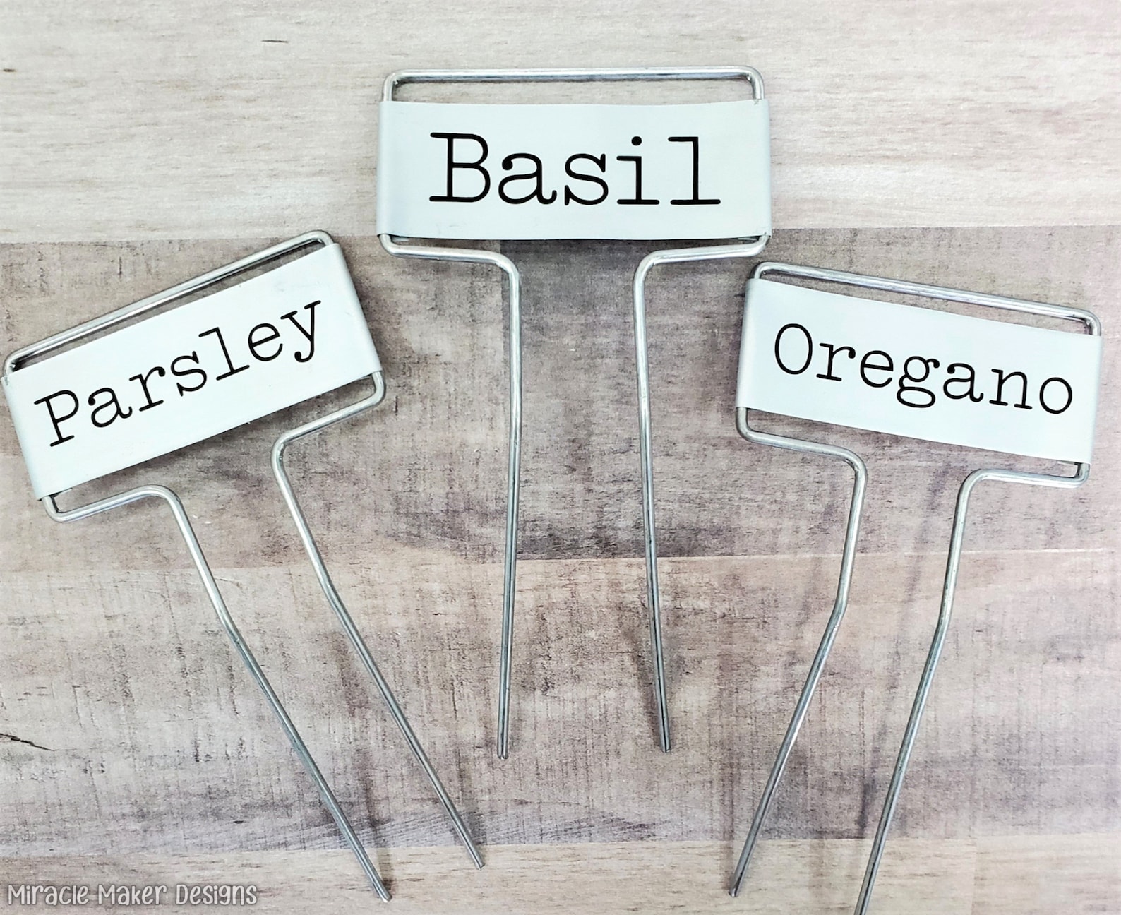 Each metal label is attached to two-5 tall, rust proof wire legs. The face on each label is 1 tall by 2.5 wide. The lettering is customized with premium adhesive vinyl.