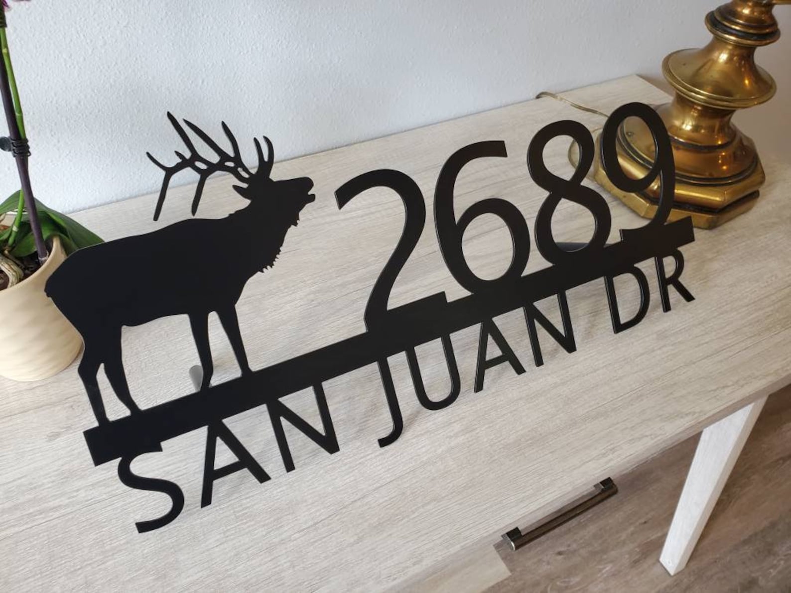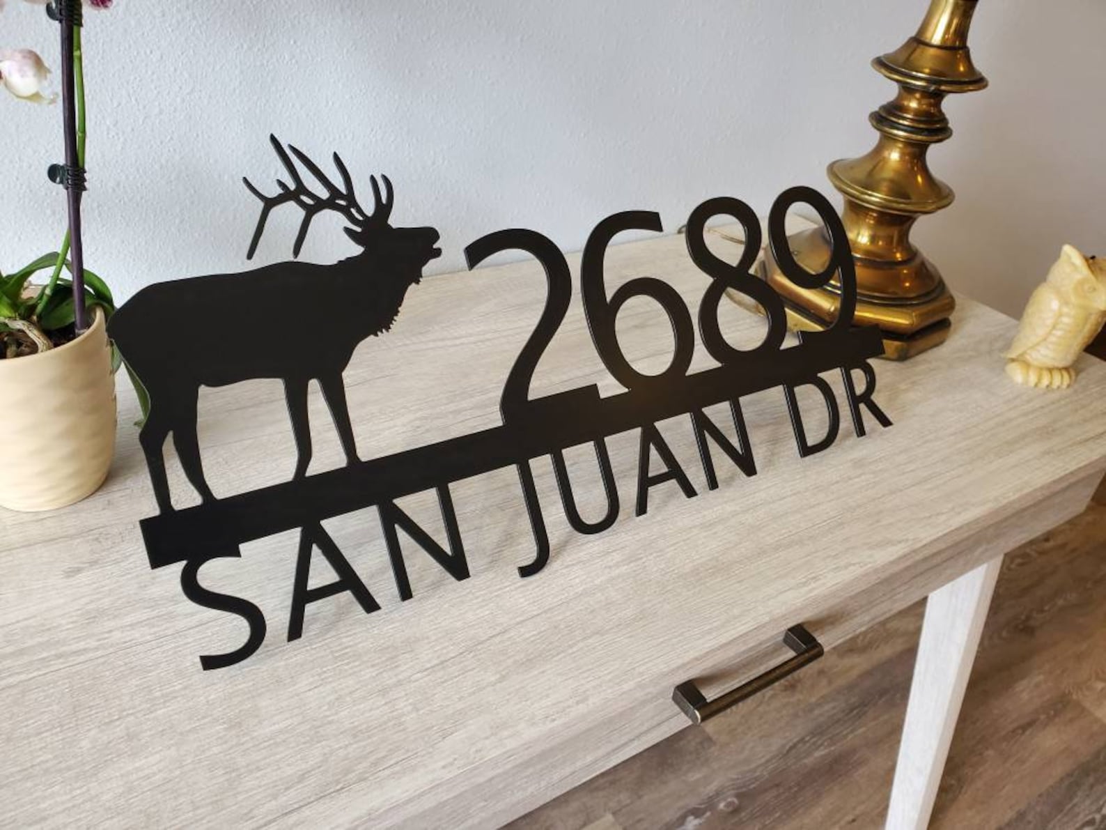 Custom metal personalized modern home house address sign, house numbers, plaque for your rock or wall with ELK design. Finished with highly durable exterior matte black powder coating. This address sign is made out of highly quality durable/sturdy 1/8 inch thick steel(12gauge). This gives the item a very sturdy feel. We do not use cheap thin metal.