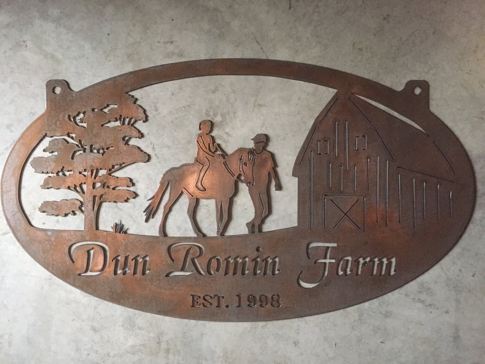 Rustic, personalized metal sign with old barn and tractor scene . Measures 3 ftx 20". Powder coated black or beautiful copper acid and clear coated. LEAVE NOTE TO SELLER WITH NAME AND OR EST. DATE YOU WANT ON SIGN. PROOF PROVIDED NOTE! If you order brushed metal, it will rust within a short time since theres no UV block, unlike black which is a solid finish