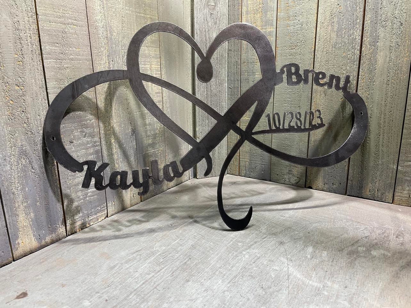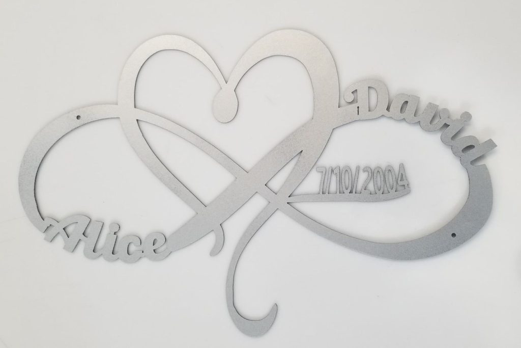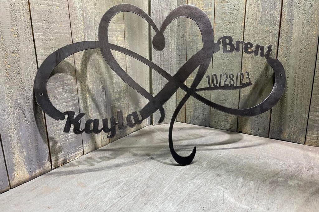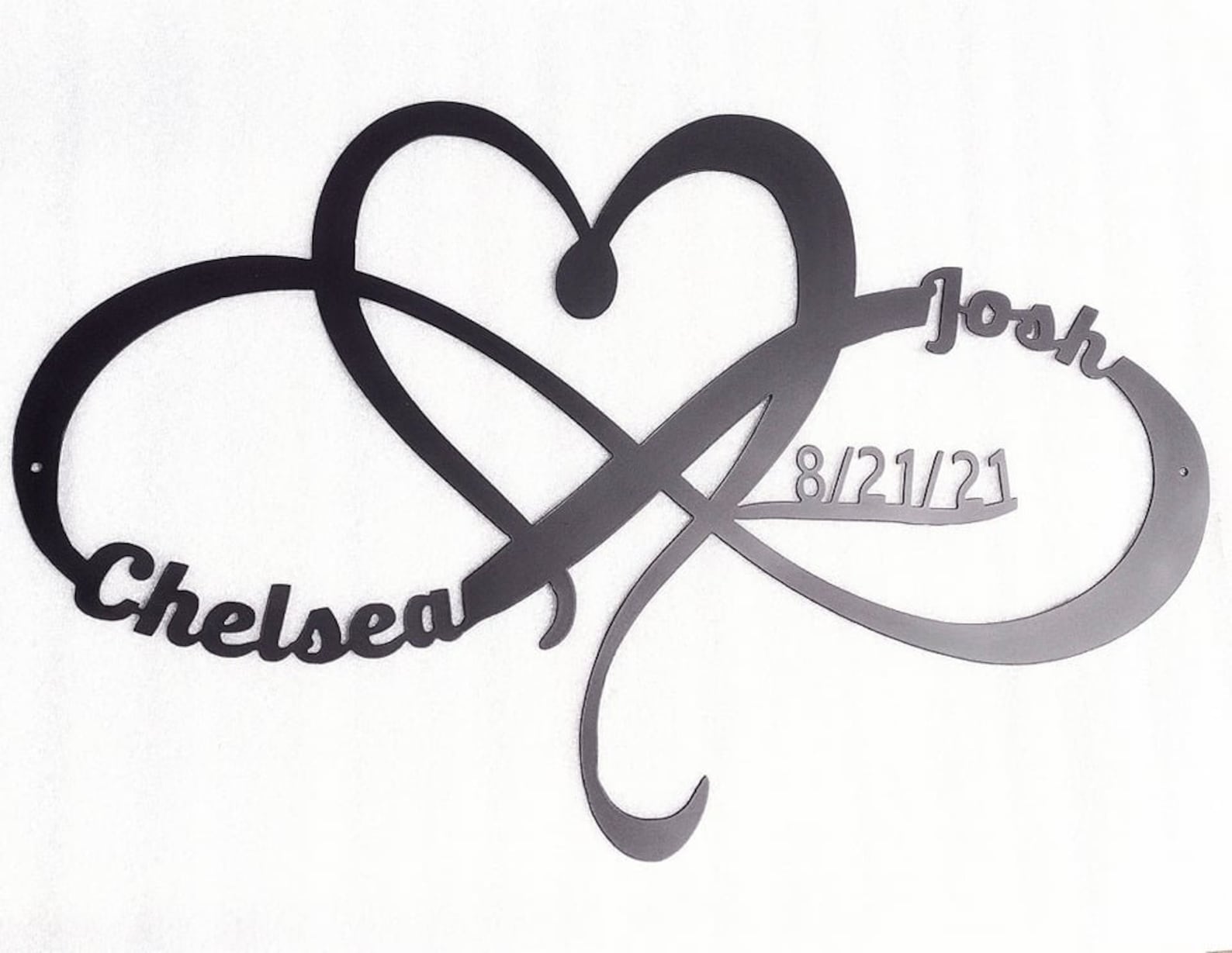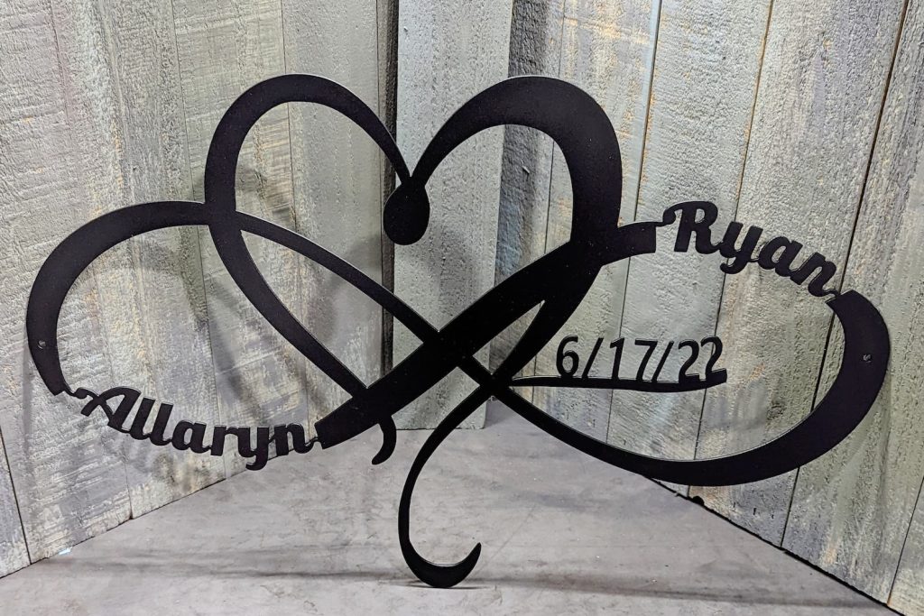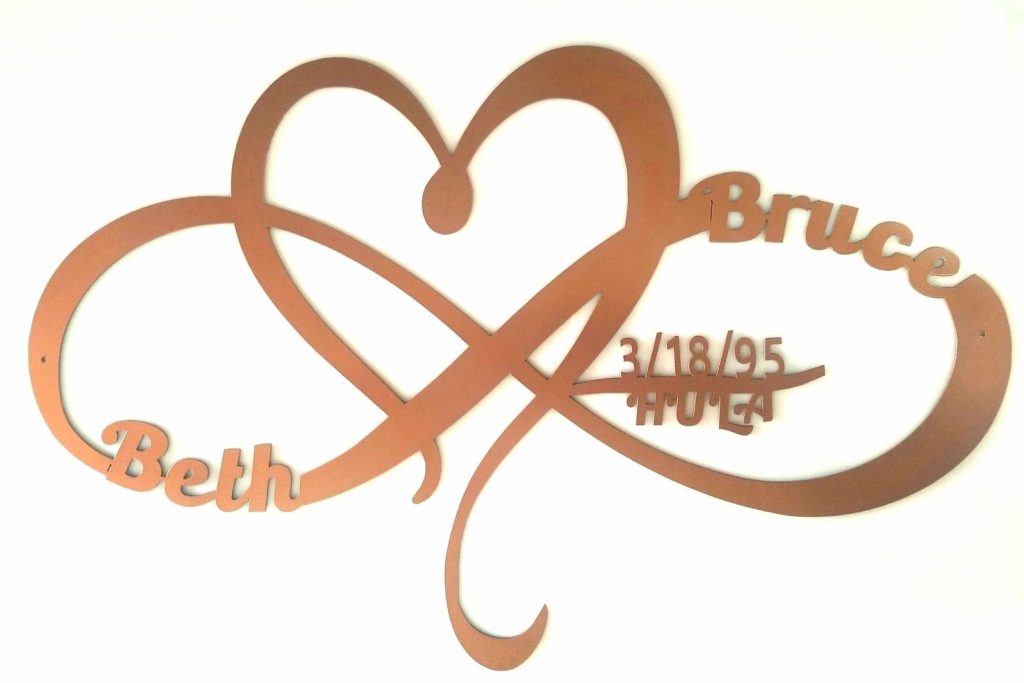 This listing is for a personalized heart and inifty metal sign with custom name, date, size and color!