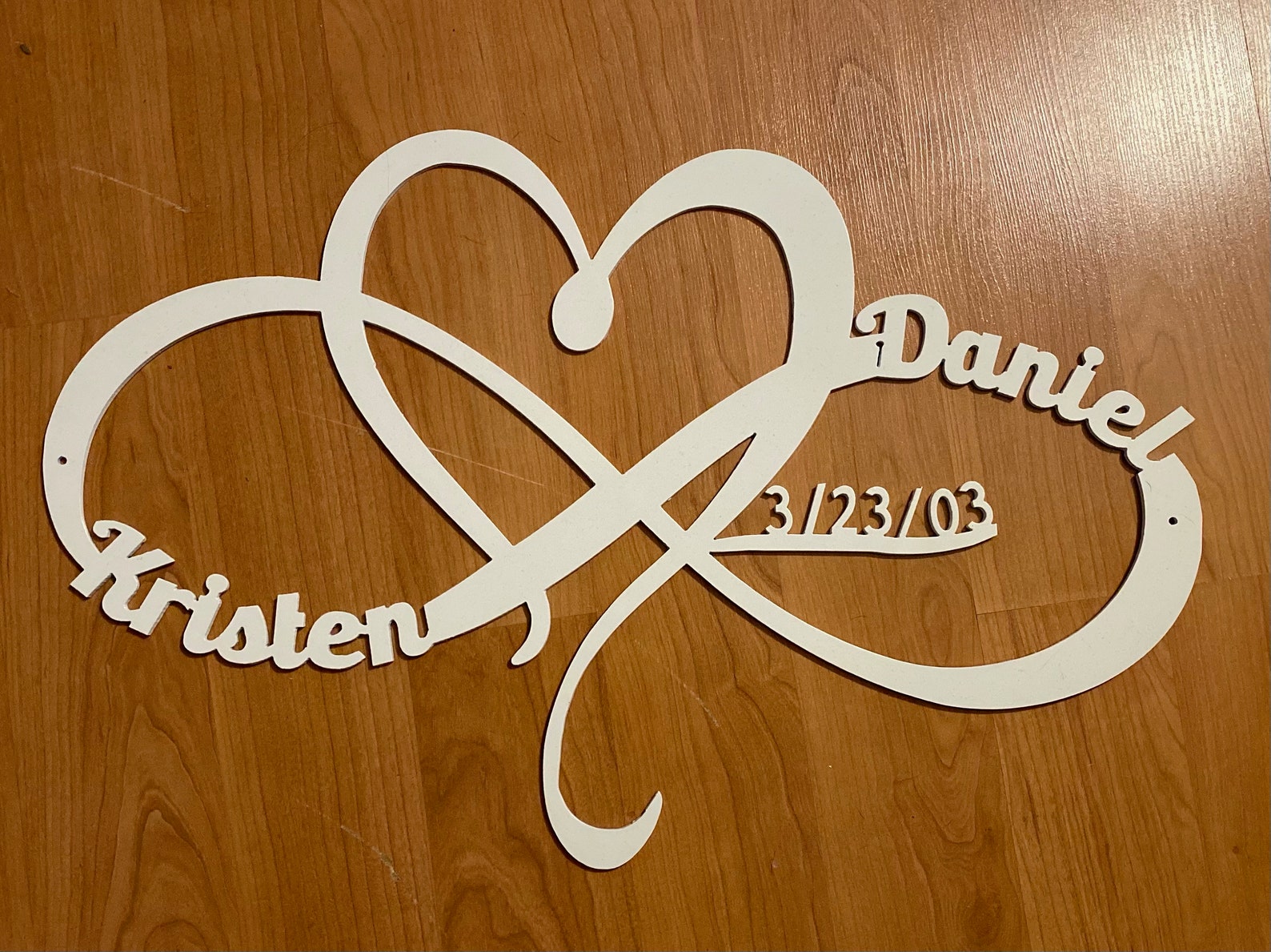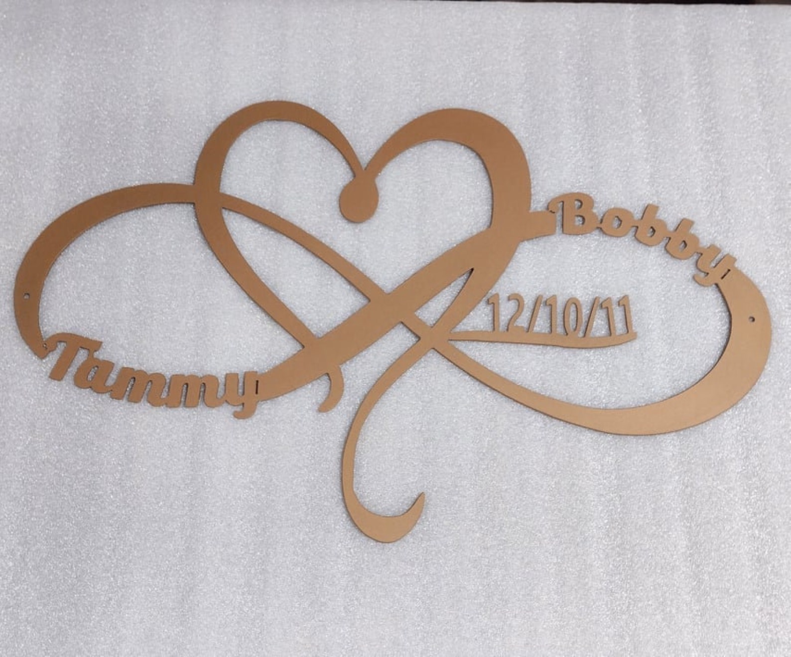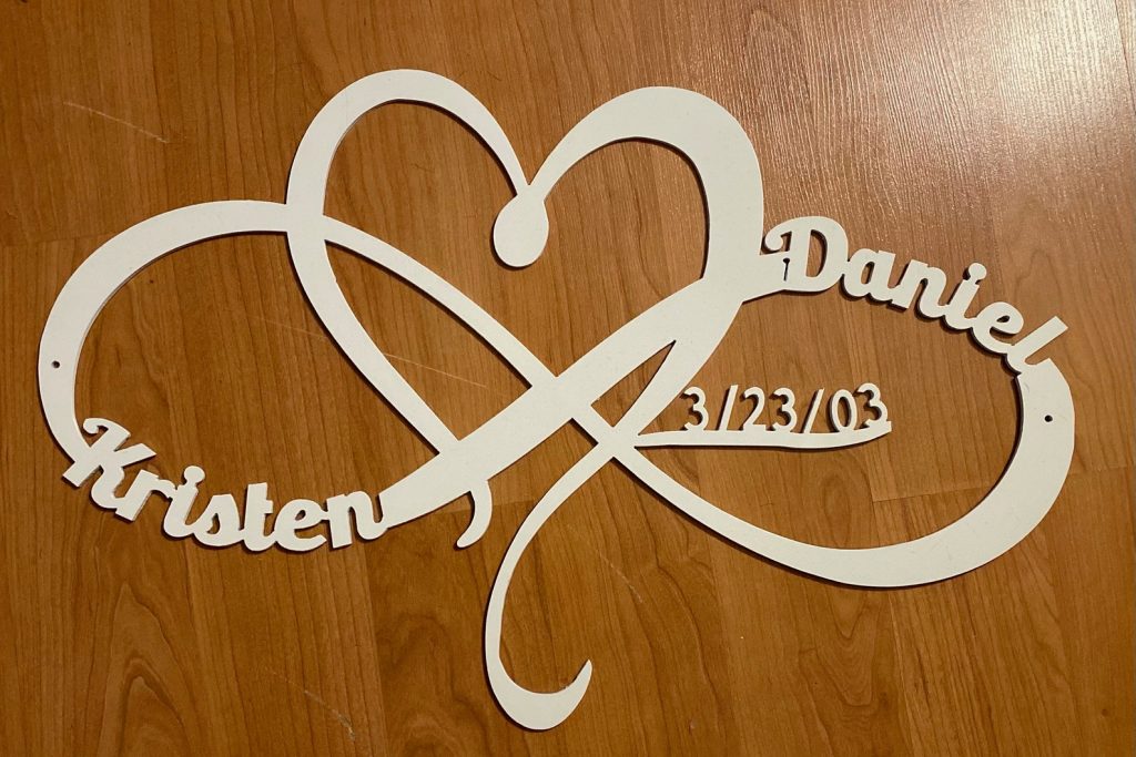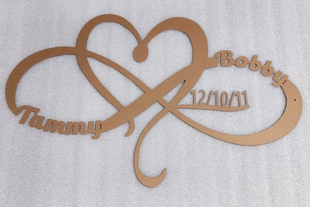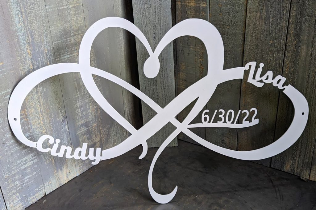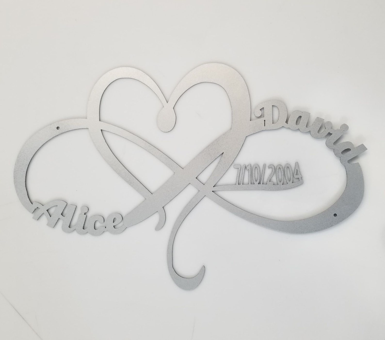 This listing is for a personalized heart and inifty metal sign with custom name, date, size and color!