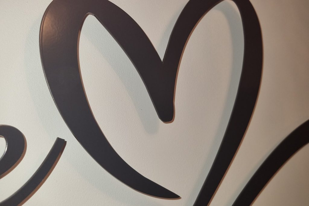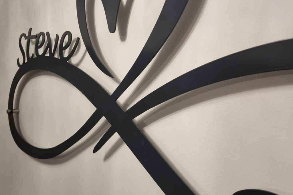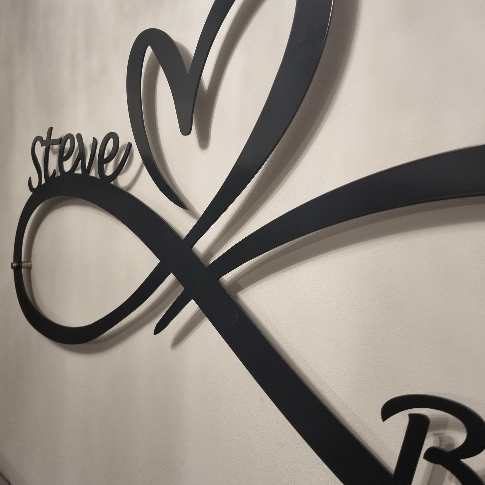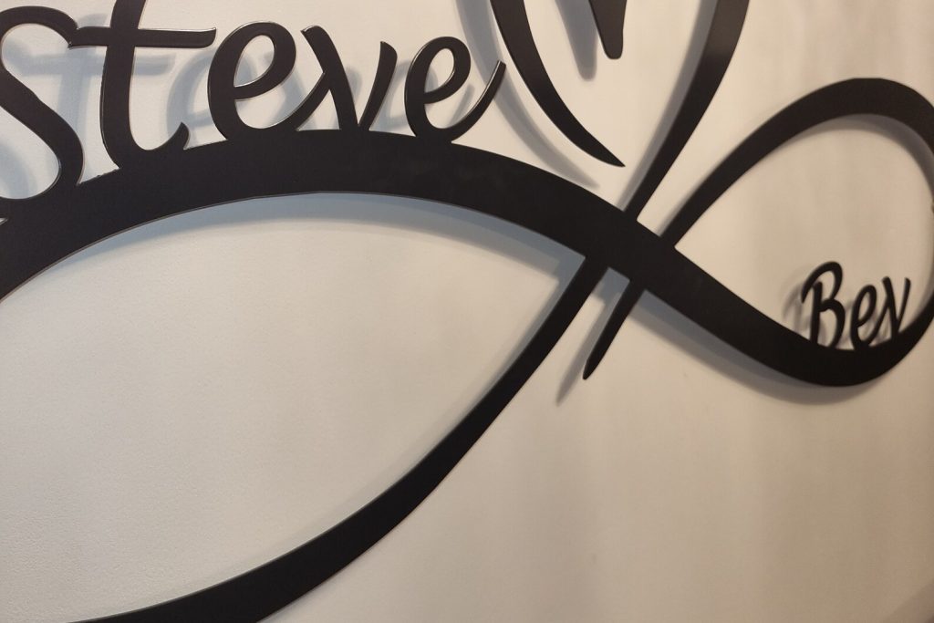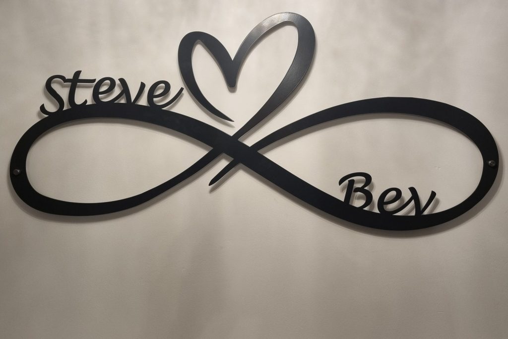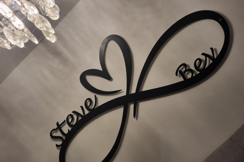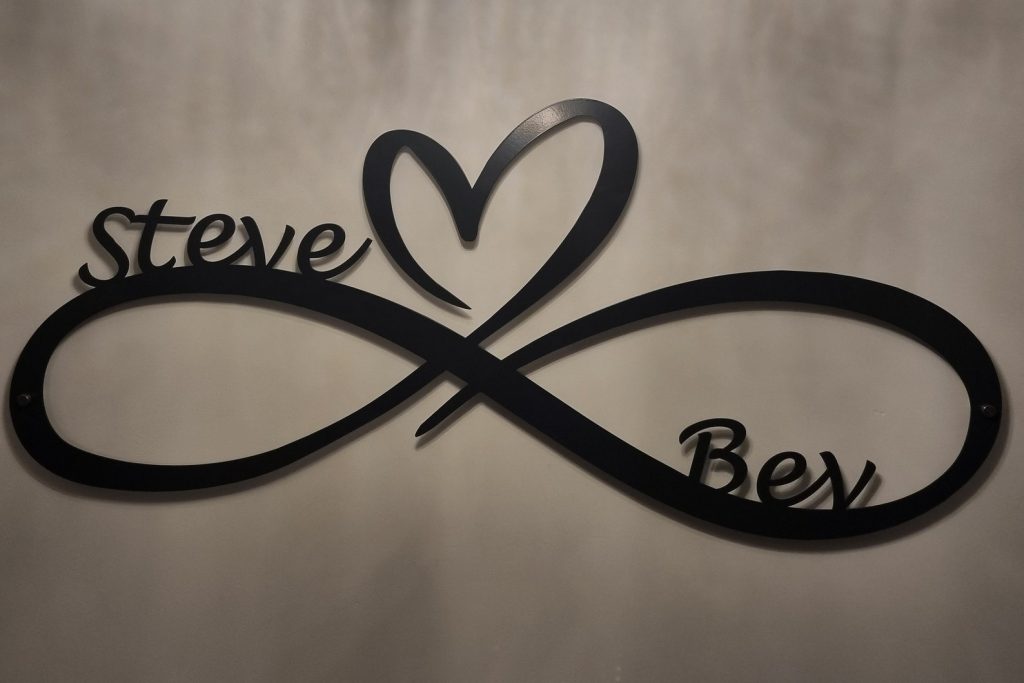 Seal your love with this beautiful infinity heart wall decor, What better way to do that than hanging this sign in your home. The perfect wedding gift for any couple and looks great on any wall, this laser-cut steel sign comes powder coated in a choice of colours and sizes which will last a life time. Comes with stand off brackets.
