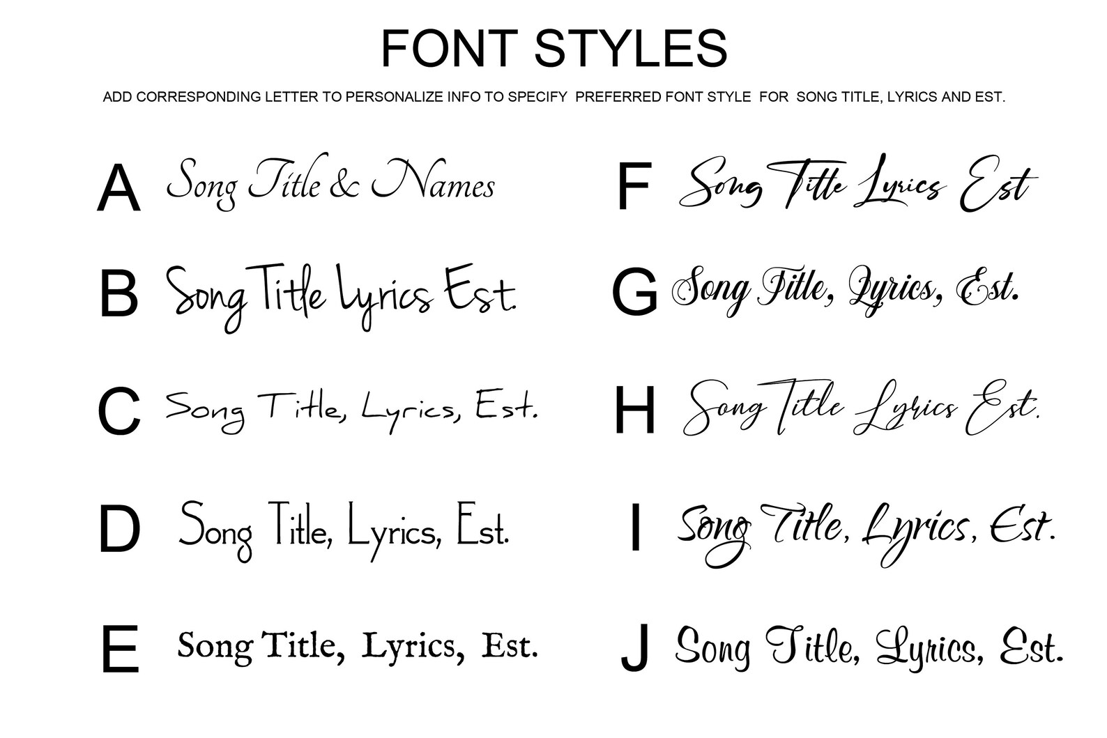 Use the Personalize box to enter preferred font for names and song title (view photos for options), song name and artist, names, and date*