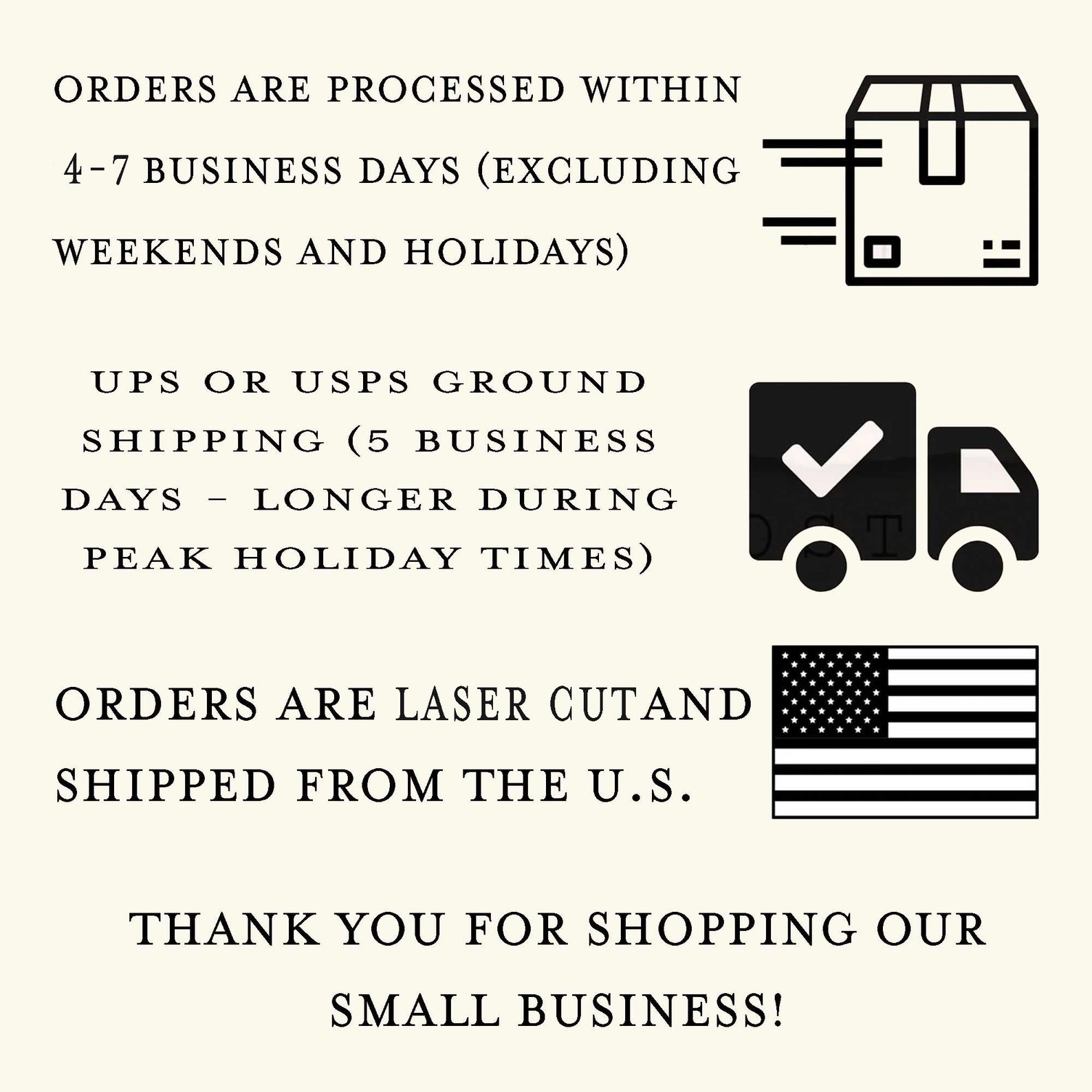 This is custom handcrafted and laser cut to your order. Production takes 4-7 business days (longer during peak seasons) plus shipping (FedEx). Please allow the time necessary to make your personalized gift.