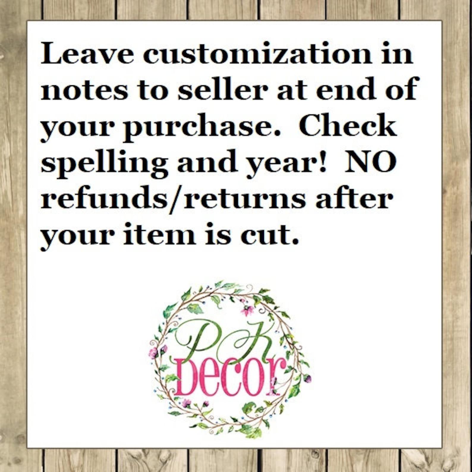 PERSONALIZATION: Only ONE initial in the background and ONLY Year, no dates, for Established year. Leave ONLY customization needed for dcor in image you are purchasing. TOO MUCH CUSTOMIZATION WILL BE LEFT OFF. Leave customization AS YOU WANT IT CUT (Smith Smiths The Smiths Smith Family). NOTE: Names show up nicer with fewer letters, we recommend leaving off "The" when possible. We are NOT responsible for typos or grammatic errors you make. For names with 2 capital letters it will be cut as follows unless you specify differently in order LeBeau will be cut LeBEAU in sign. Double last names – we cannot do a hyphen in the middle.