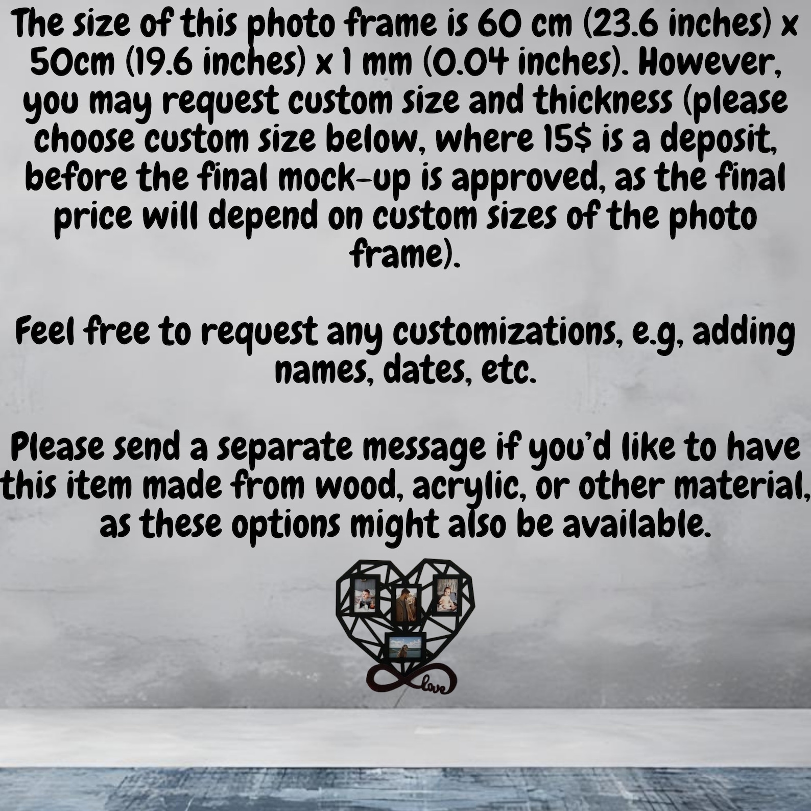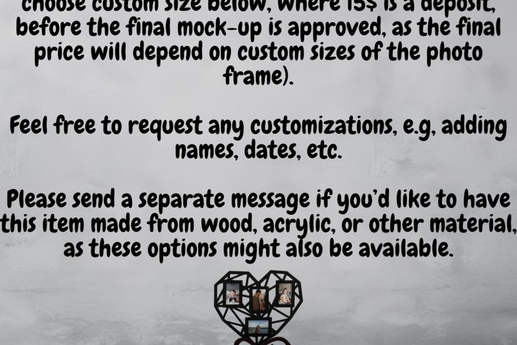 Please note: custom size / material prices are deposits, with final price to be announced and the final mock-up is ready.