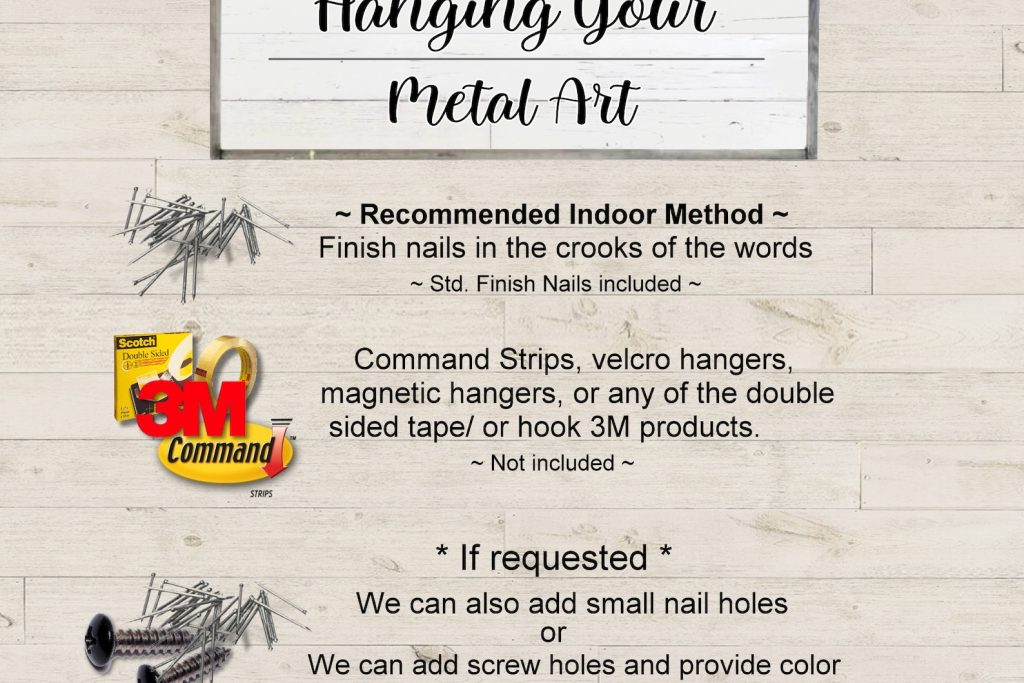 ~ This piece comes standard with nails for hanging and no holes (3M tape can also be used)