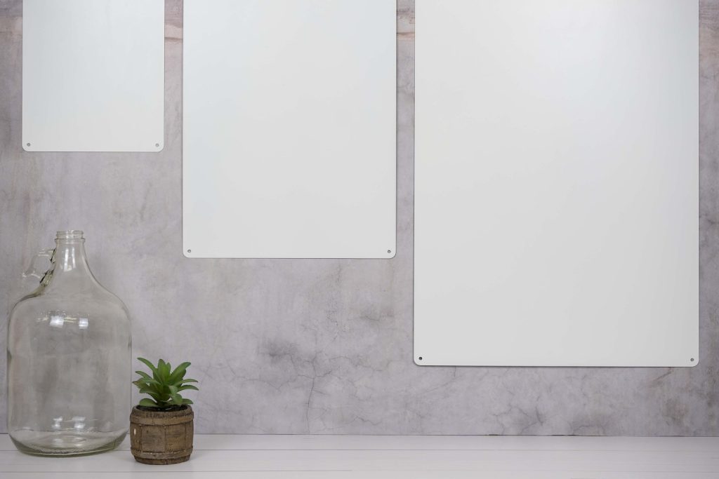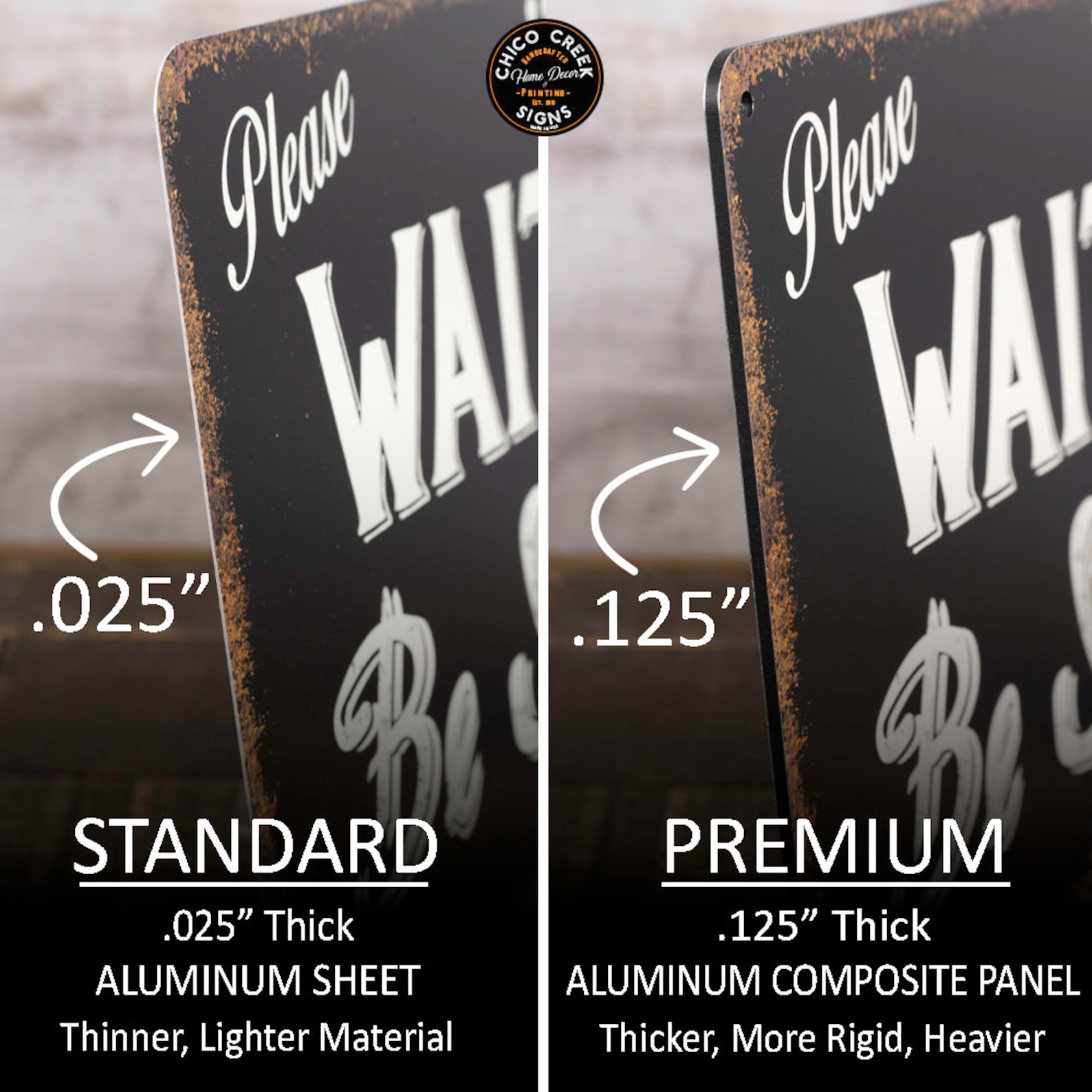 -PREMIUM options are crafted from 100% recycled Aluminum Composite panels that are .125" thick. Aluminum composite panel is comprised of a reinforced synthetic core sandwiched between two sheets of aluminum. The benefits of this material is that it9;s more rigid yet lightweight making it easy to hang and it9;s 100% recycled.