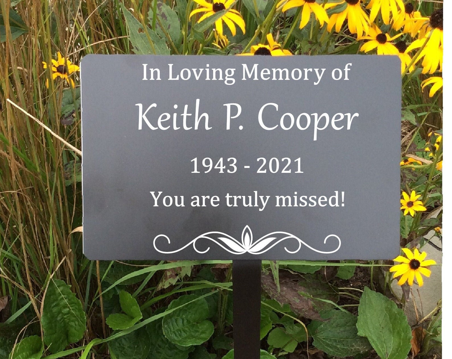 Engraved black metal plaque and stake. 8"L x 5"H comes with a 25" stake. Our metal ID plates are commercial grade. They will not fade or rust and will last years outdoors.