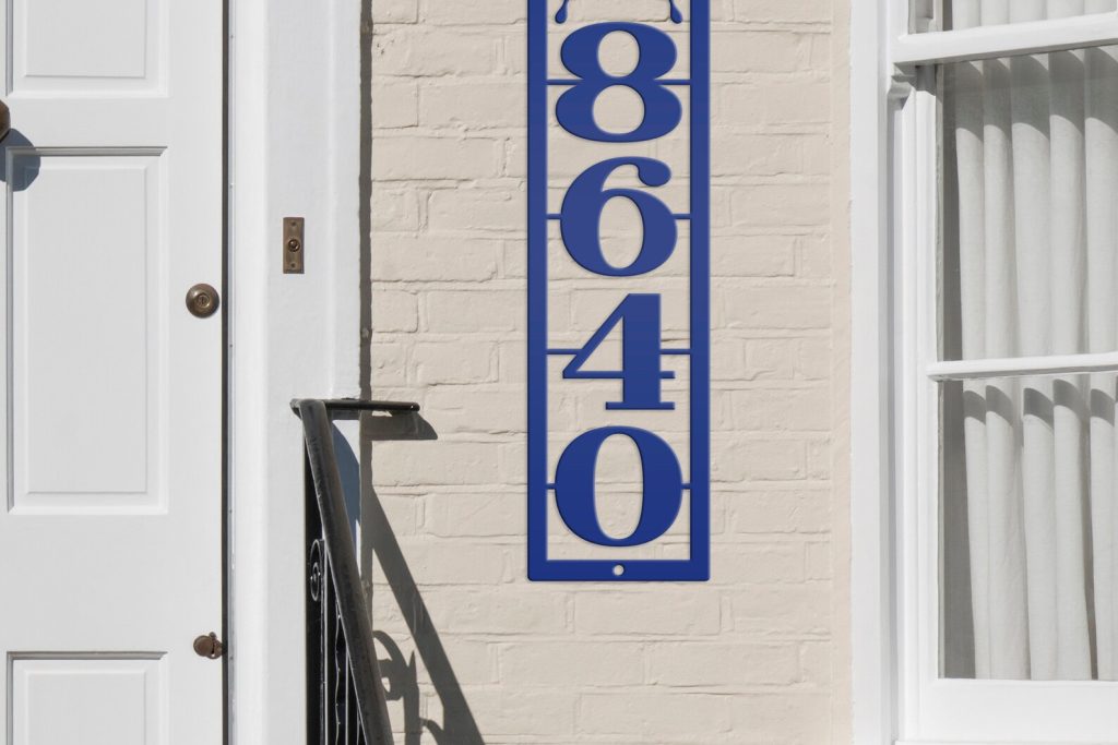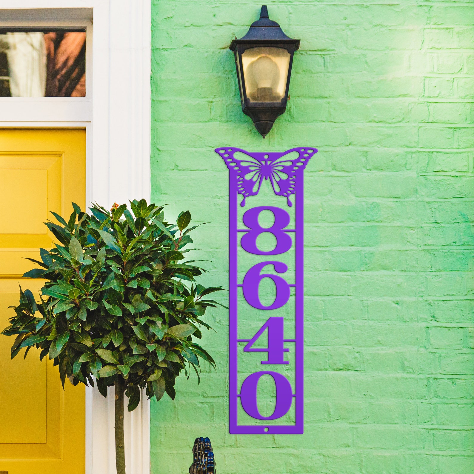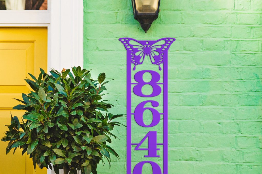 Introducing our beautifully crafted Metal Address Sign! Enhance your home or business with this exquisite Vertical House Numbers Plaque featuring a stunning Detailed Butterfly design. This versatile piece can be easily displayed on your Mailbox Post, used as a Home Marker or even as striking Business Wall Decor. Make a statement and impress your guests with this elegant addition to your Front Porch. Perfect for both personal and HOA use.