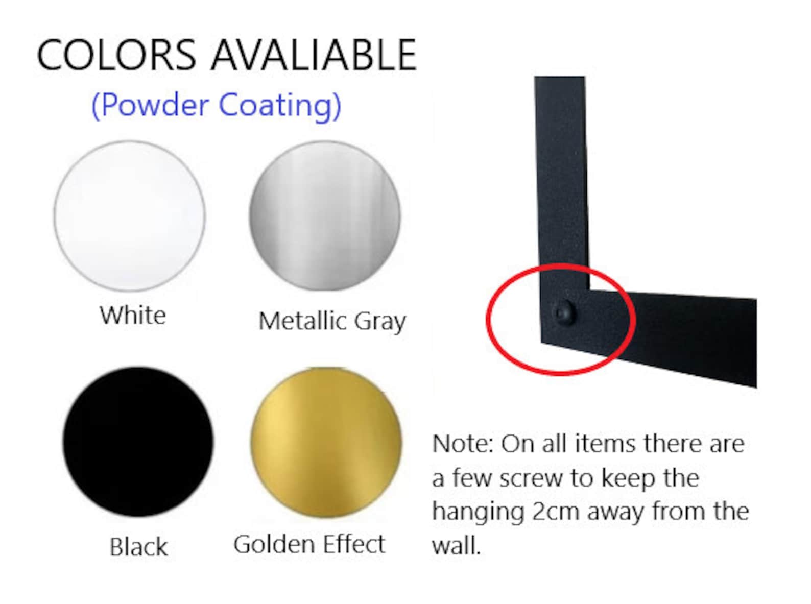 tColor: Electrostatic Powder Coating.(Please note that silver effect ,copper effect and white color may take 3-4 days more to be ready to ship due to special long coloring process)