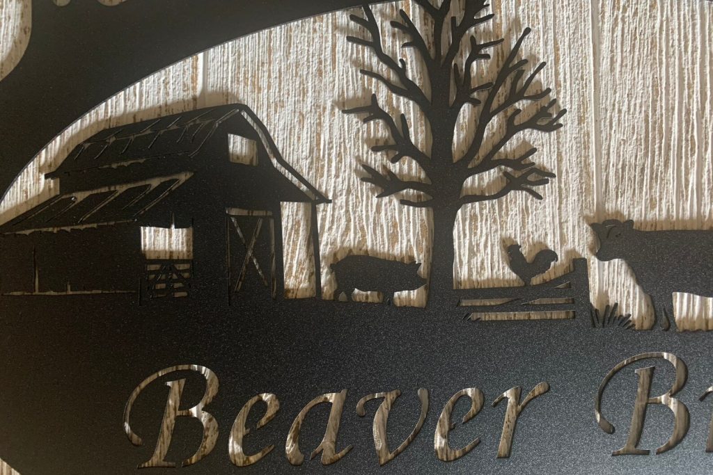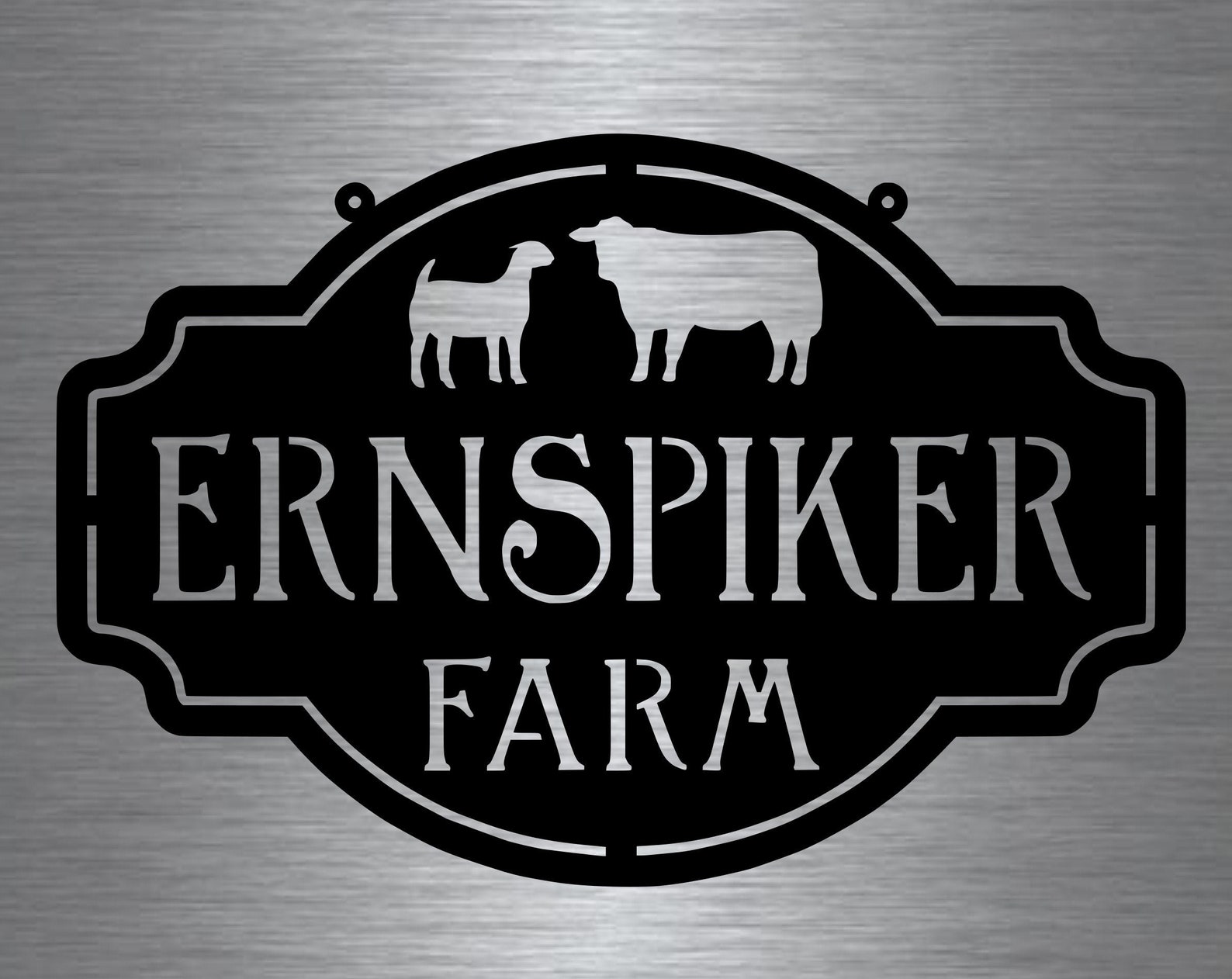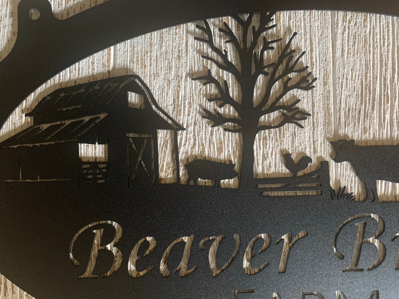 Rustic, personalized metal sign with barn scene . Measures 3 ftx 20" or 30" if you choose the smaller size. Powder coated black or beautiful copper acid and clear coated. LEAVE NOTE TO SELLER WITH NAME AND OR EST. DATE YOU WANT ON SIGN,. PROOF PROVIDED NOTE! If you order brushed metal, it will rust within a short time since theres no UV block, unlike black which is a solid finish