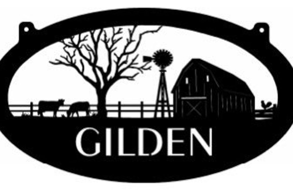 Rustic, personalized metal sign with barn scene . Measures 3 ftx 20" or 49;x 26".