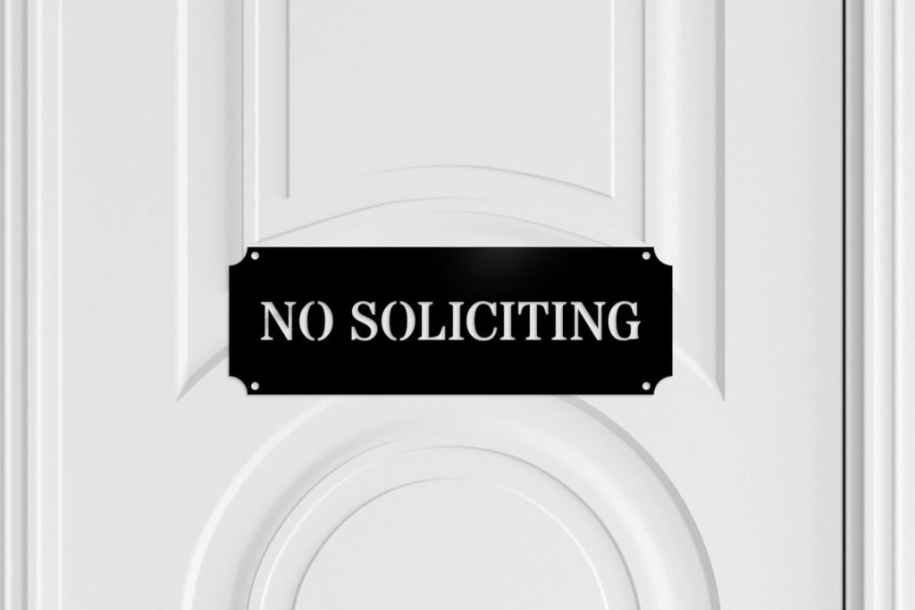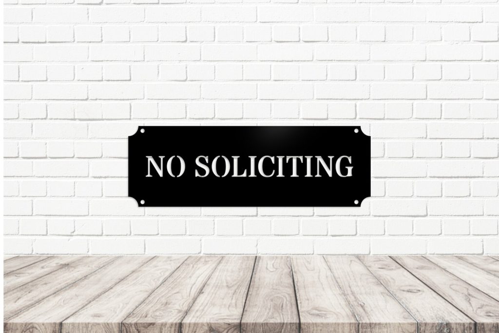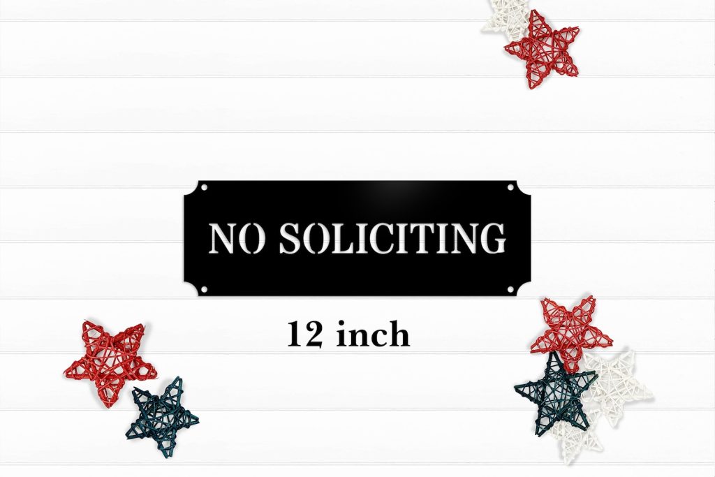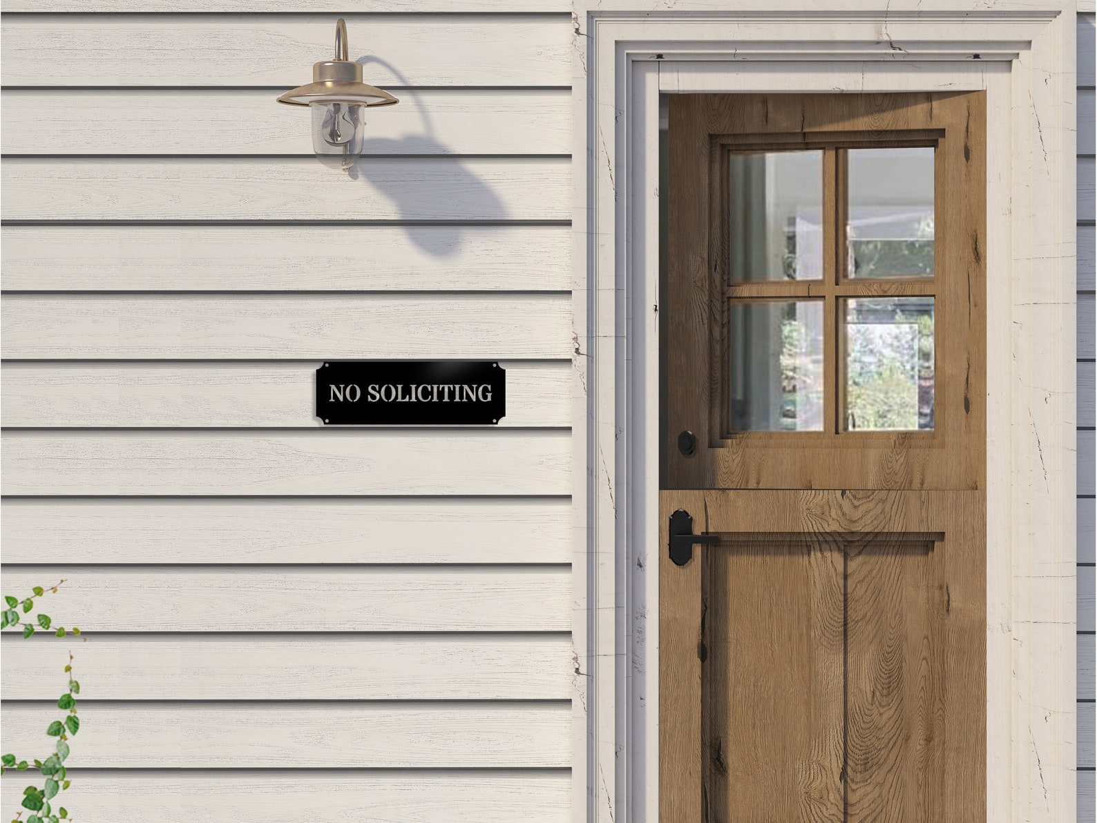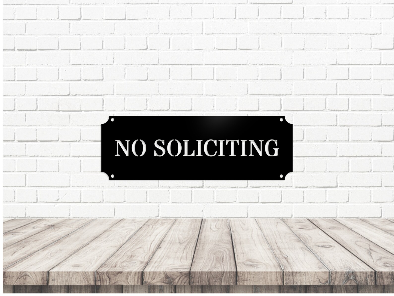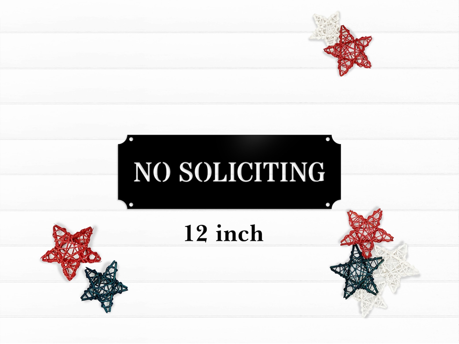 Keep pesky salesmen away with this custom metal sign! This No Soliciting Sign makes a great door hanger or wall hanger, and comes with pre-cut holes for easy mounting.