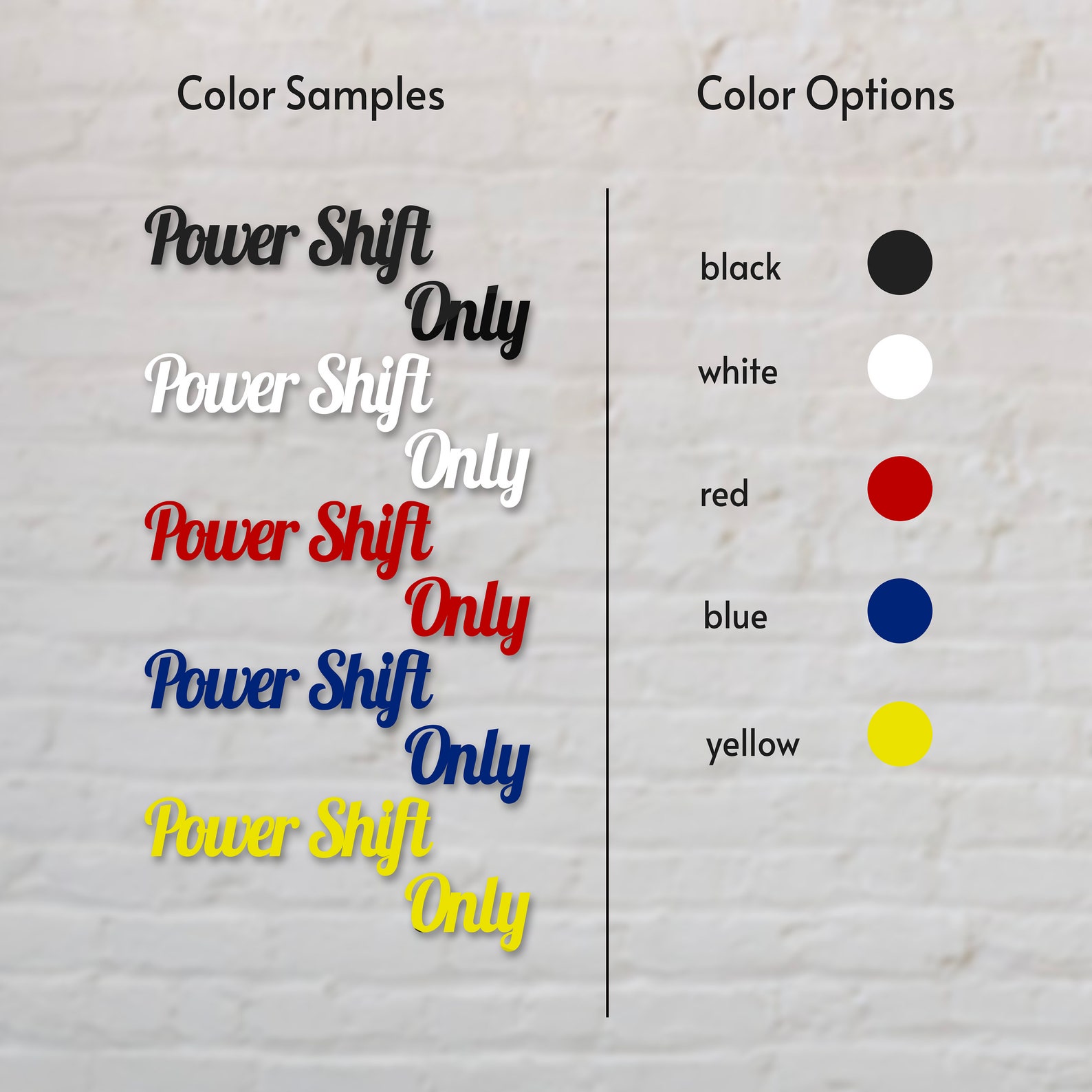 Our Metal Power Shift Only Sign Home Decor is available in three different sizes – 28in, 39in, and 55in – and five different colors – black, white, red, blue, and yellow. It is suitable for both indoor and outdoor use, making it a versatile decor item that can be used in various settings.