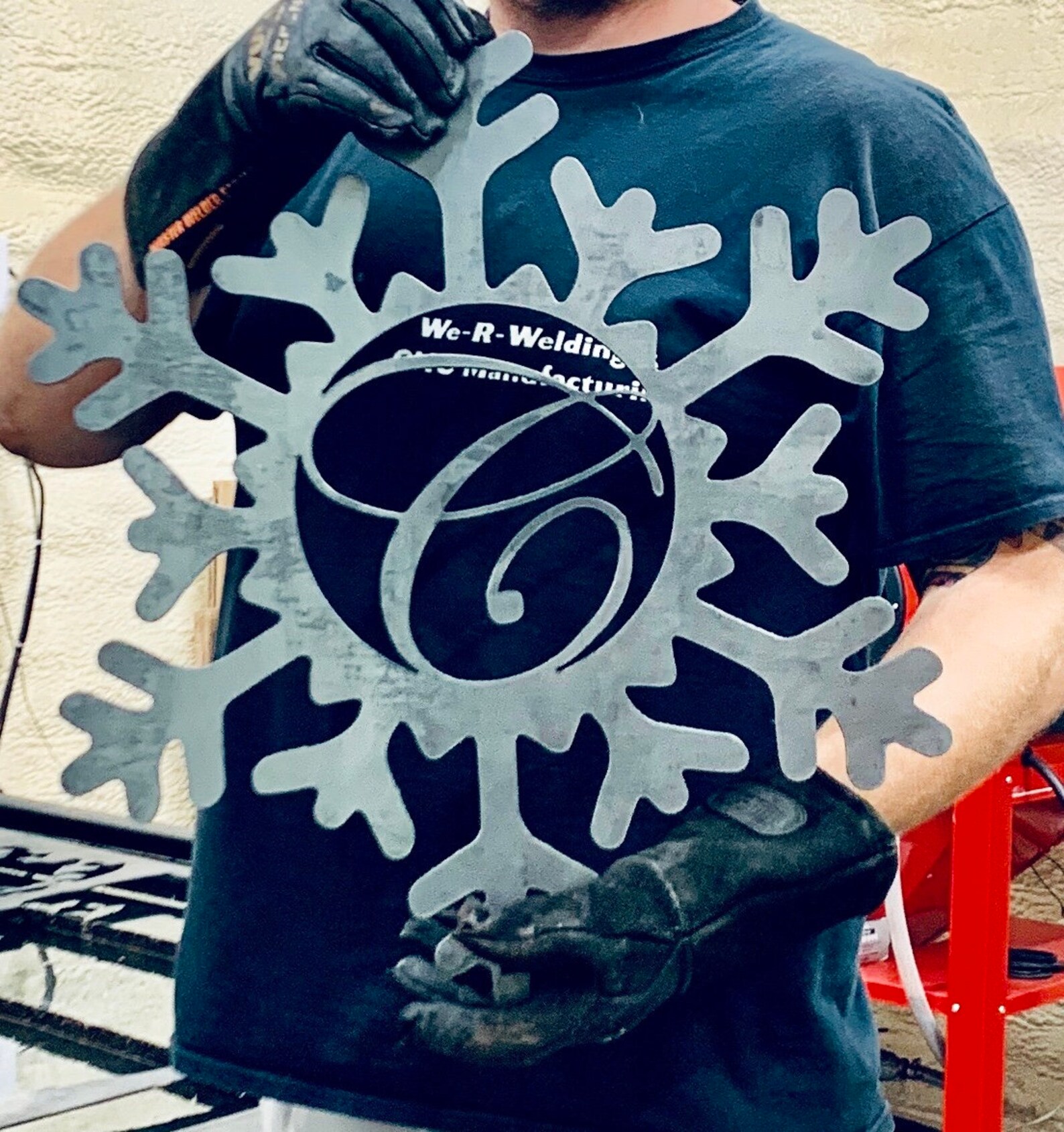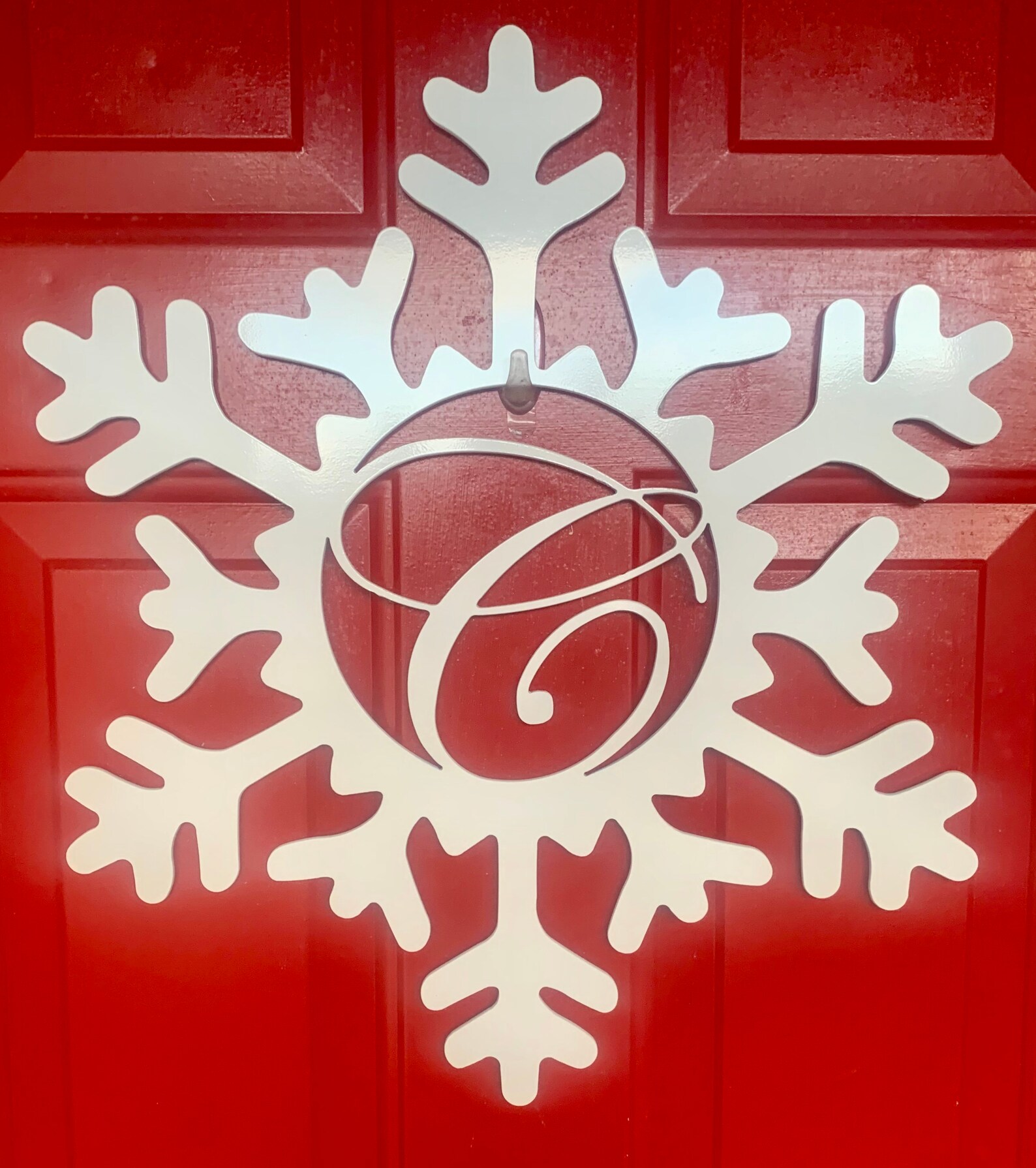 This listing is for a custom metal snowflake with a script letter of your choice in the center. It is made from 16 gauge steel and will measure 20 inch wide x 20 inch tall. It will be powder coated with your choice of color. All of our products are made and powder coated in house.