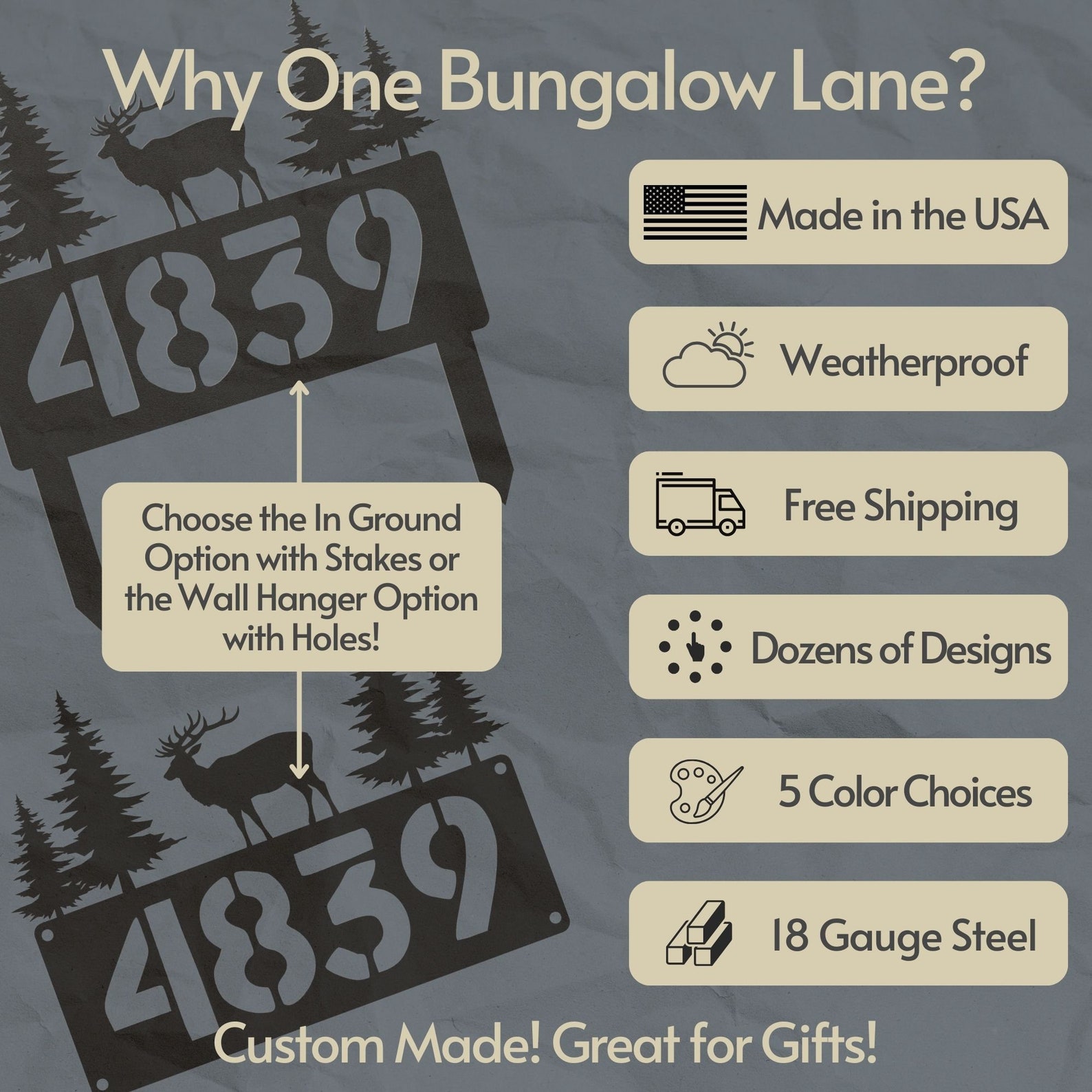 Our address signs are crafted using durable 18-gauge steel, ensuring both sturdiness and longevity.