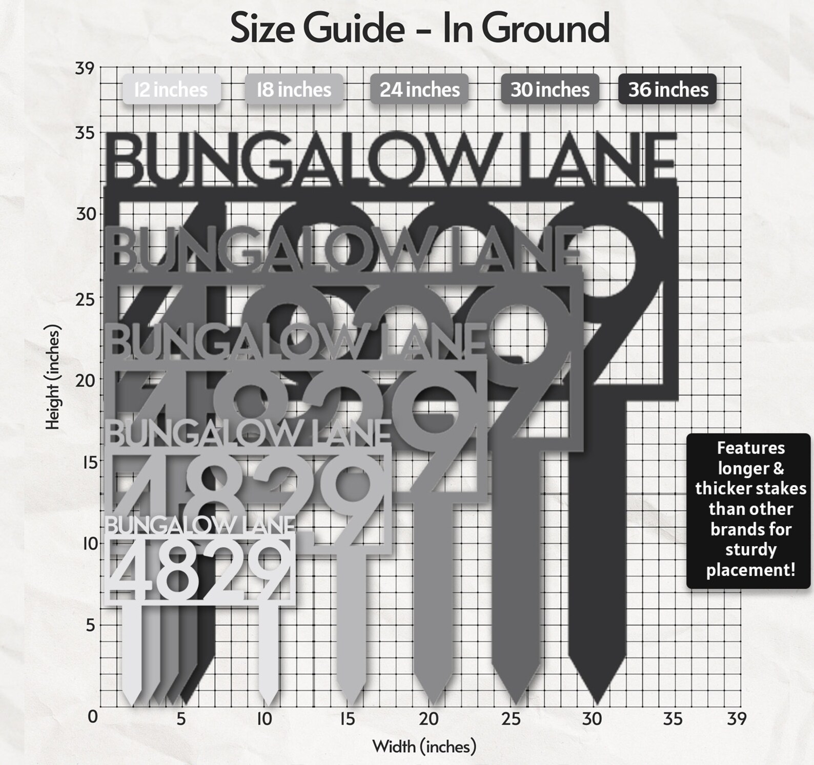 In Ground: These signs come with two strong stakes for easy placing in the ground. Our stakes are longer and wider than competing brands, meaning you have more freedom to let your sign sit as low or high off the ground as you want, with confidence it will reliably stay in place. Refer to sizing images to see how long the stakes are for every sign.