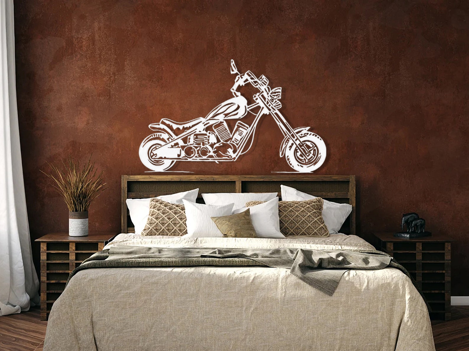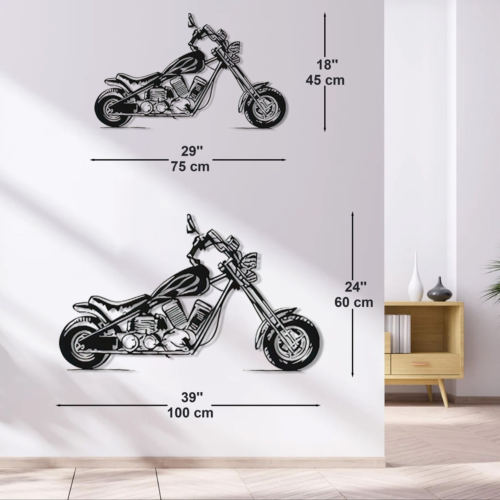 Elevate your space with our Motorcycle Metal Wall Art. Perfect for the garage or man cave, this Chopper Motorcycle Wall Decor adds a rugged yet artistic touch. Ideal boyfriend gift for motorcycle lovers. Versatile metal wall decor for living rooms, entryways, and more. Capture the spirit of the open road with this large, classic motorcycle design.