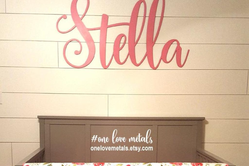 Thank you for shopping One Love Metals nursery name signs in metal! This listing is for a laser cut name sign. Name signs are the highlight of nursery decor and the best baby shower gift. Our custom name signs make beautiful wedding, business, and family home wall decor. Create any name, word, or phrase. You will LOVE it!