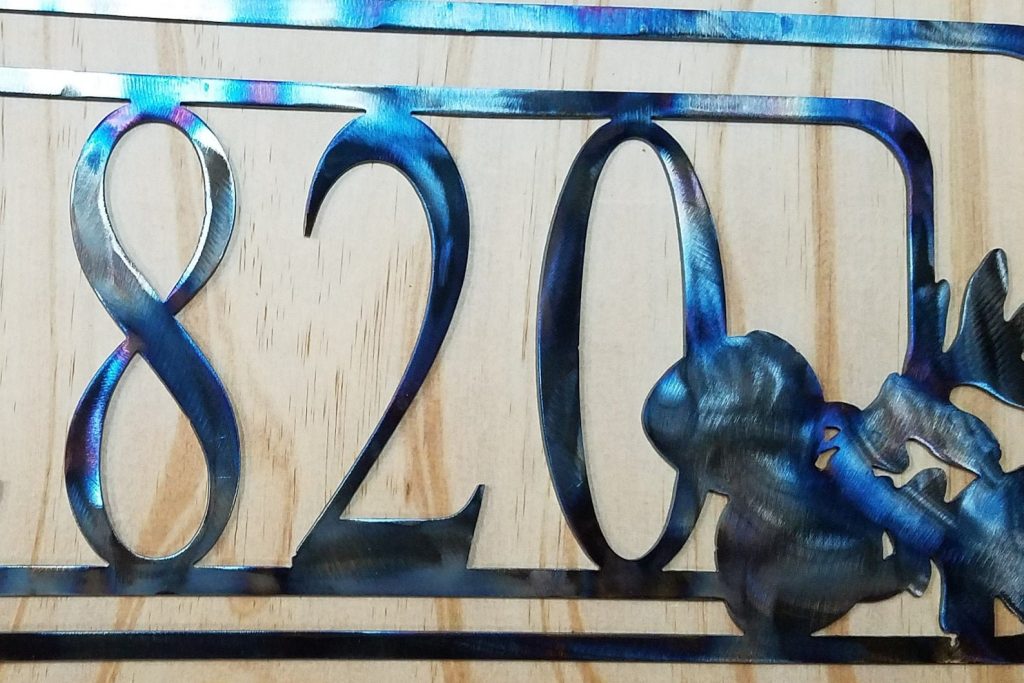 Custom designed oak inspired metal address plate. Plasma cut from 16 gauge cold rolled steel and added holes for mounting on house or fence, screws not incl. Choose from heat blued with clear coat, shined metal with clear coat, white, black, bronze. All items are powder coated giving them lasting uv protection and durability.