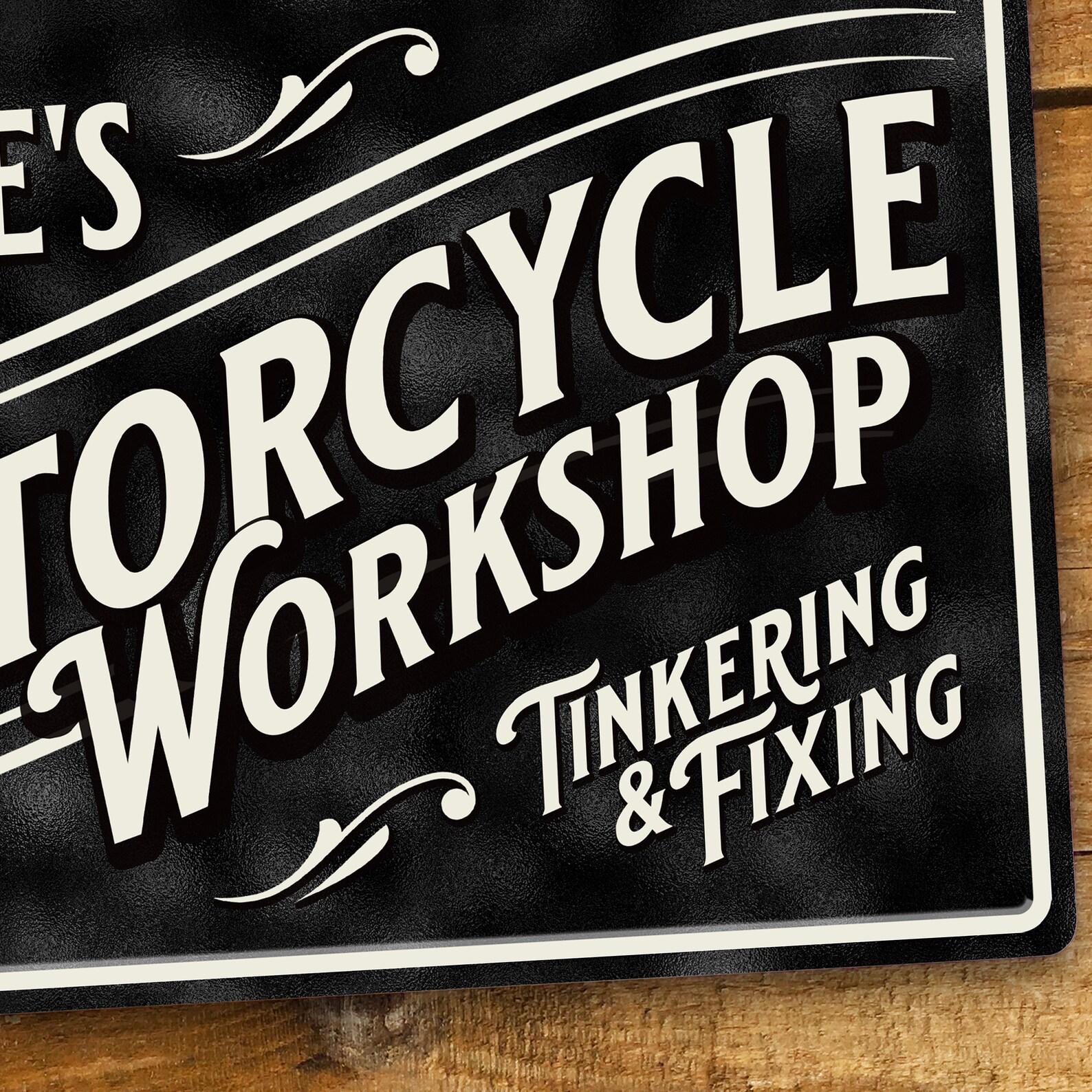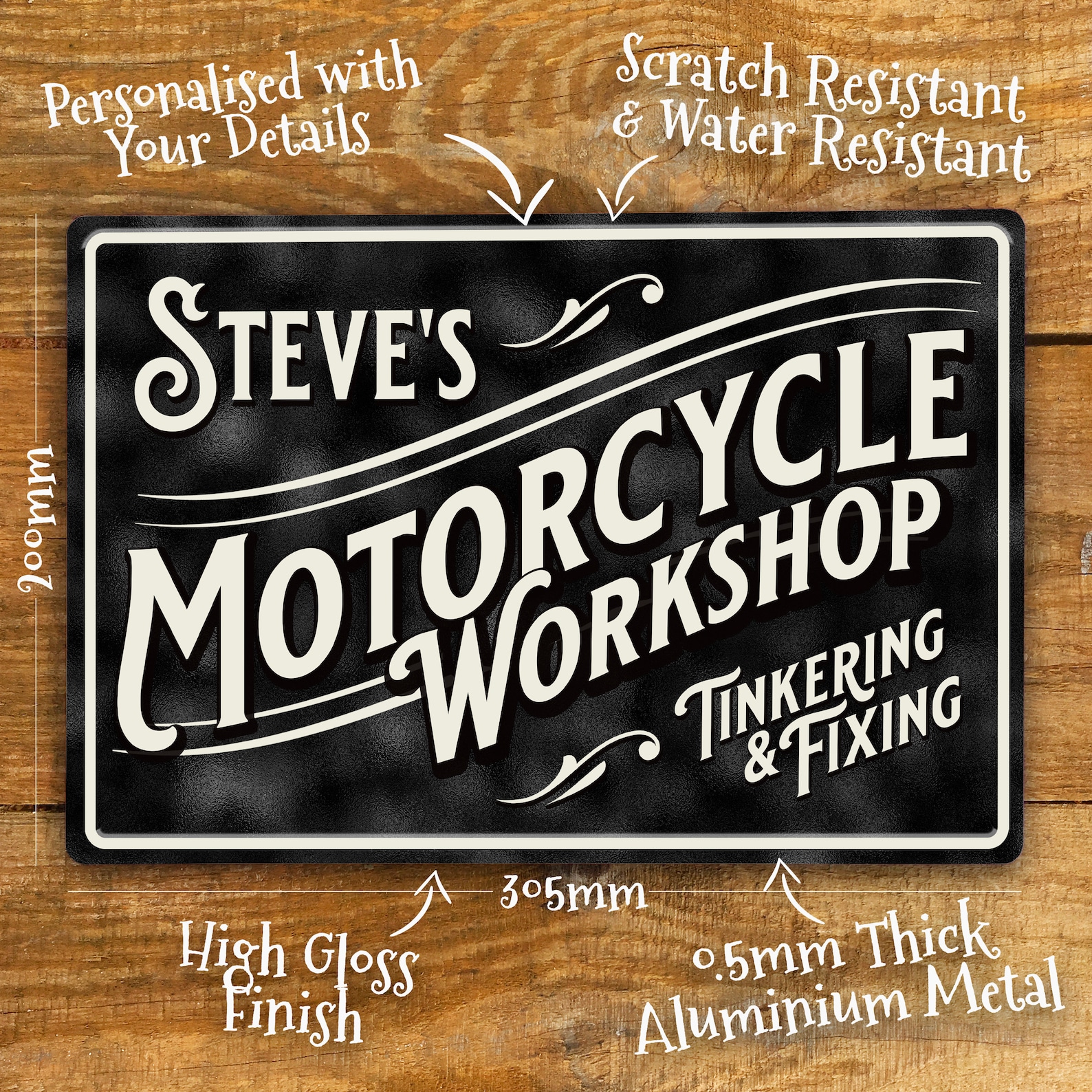 Personalised Motorcycle Workshop Sign Metal Wall Door Decor Motorbike Accessory Garage Shed Vintage Retro Tin Plaque Aluminium 200mm x 305mm
