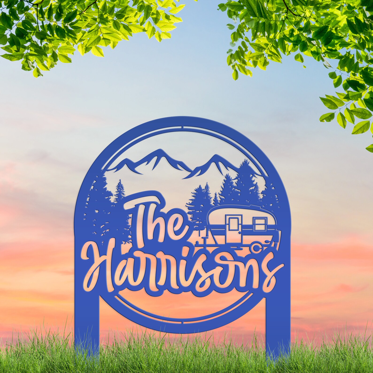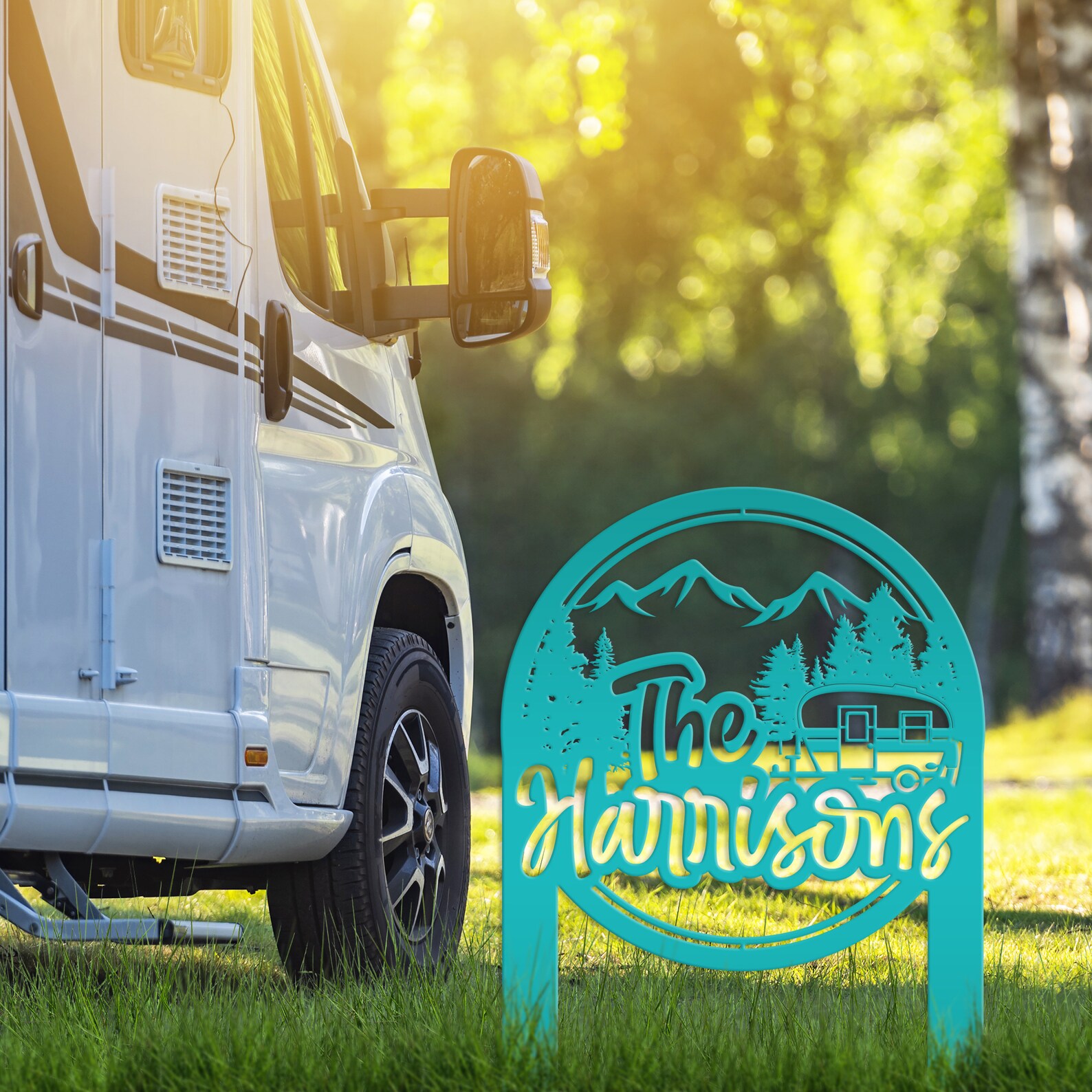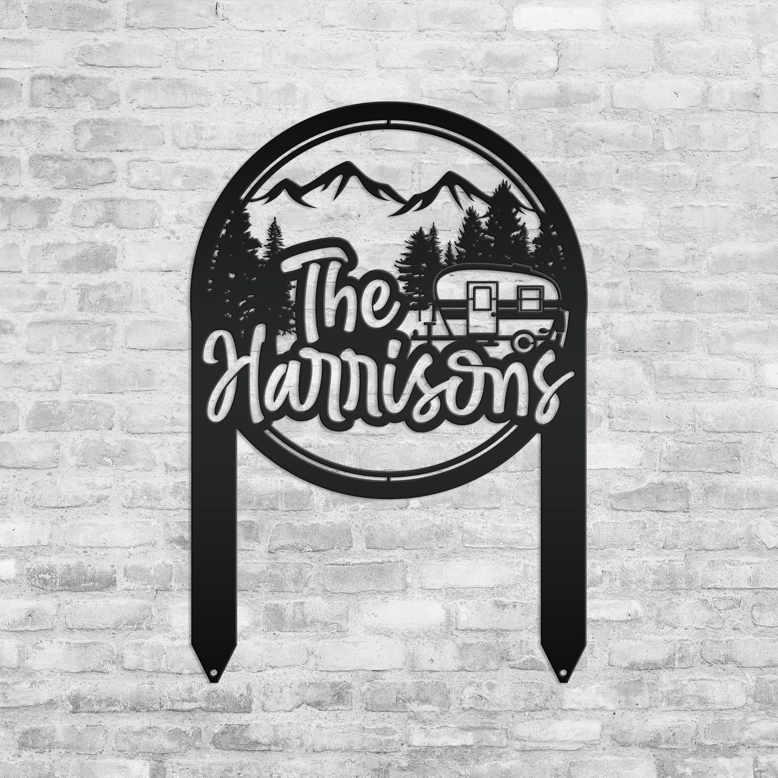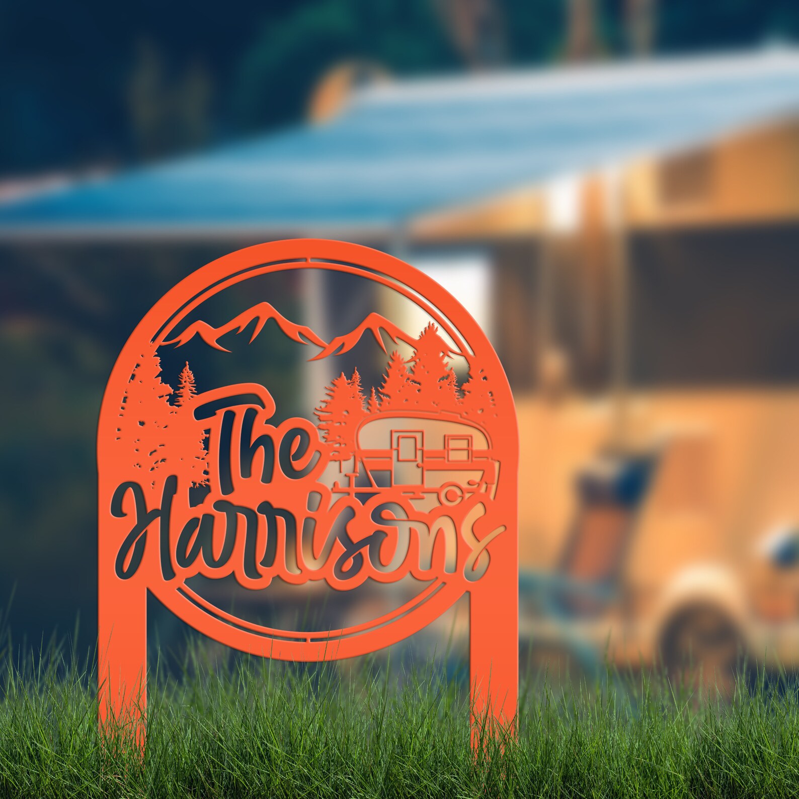 This metal camping sign is personalized with your family name. It is perfect for outdoor campsites and makes a great gift for weddings or any other special event. This sign can also be used as a decoration in your RV park or camper.