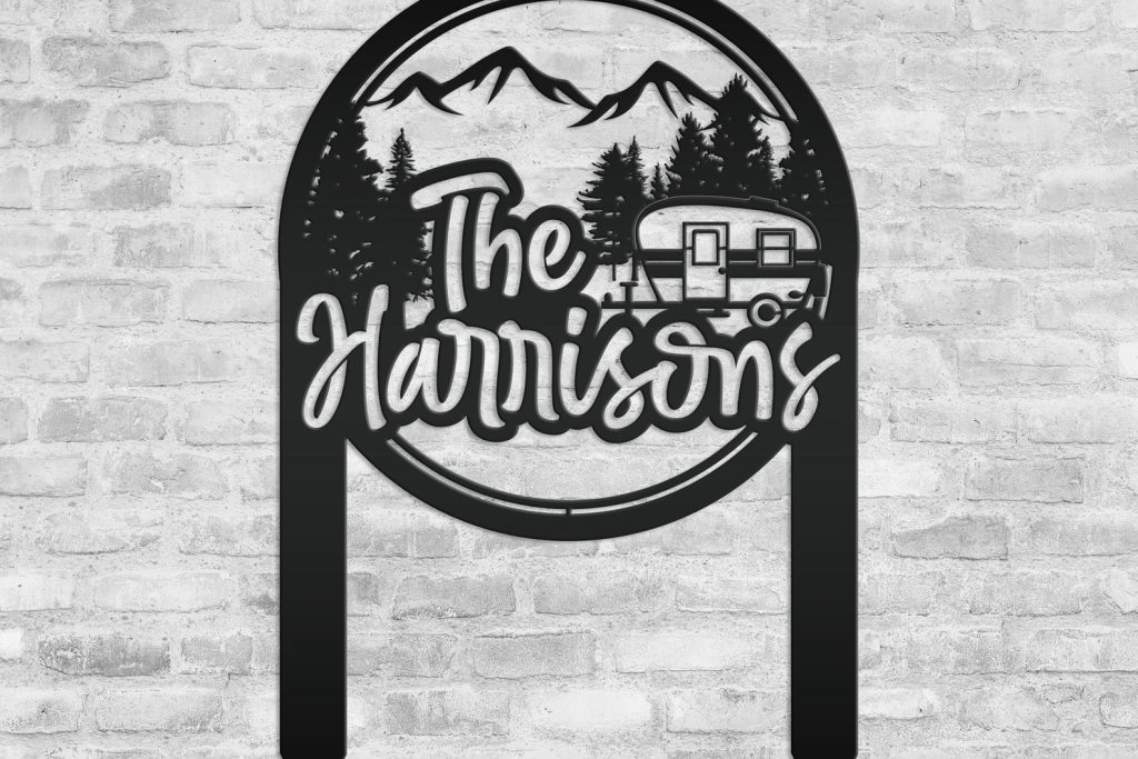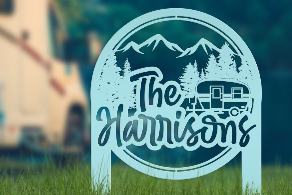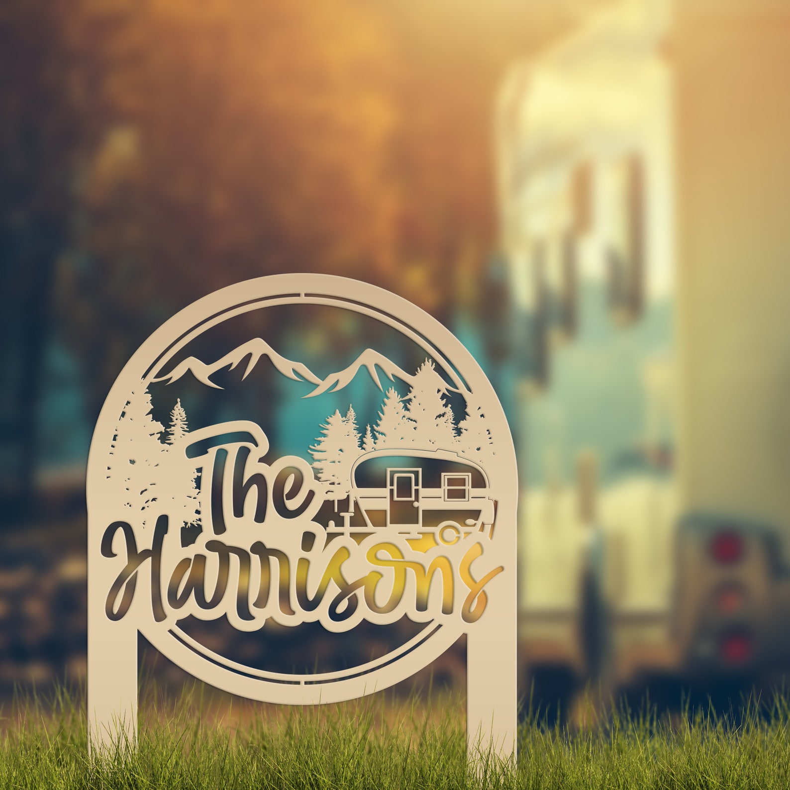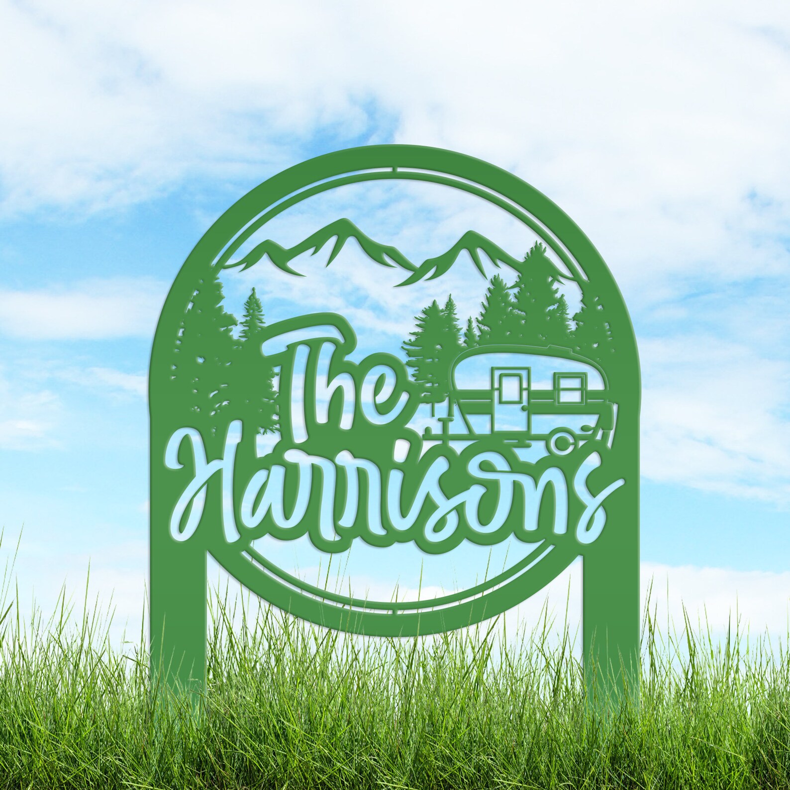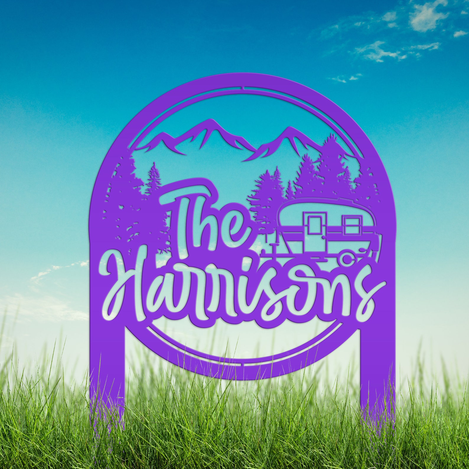 This metal camping sign is personalized with your family name. It is perfect for outdoor campsites and makes a great gift for weddings or any other special event. This sign can also be used as a decoration in your RV park or camper.