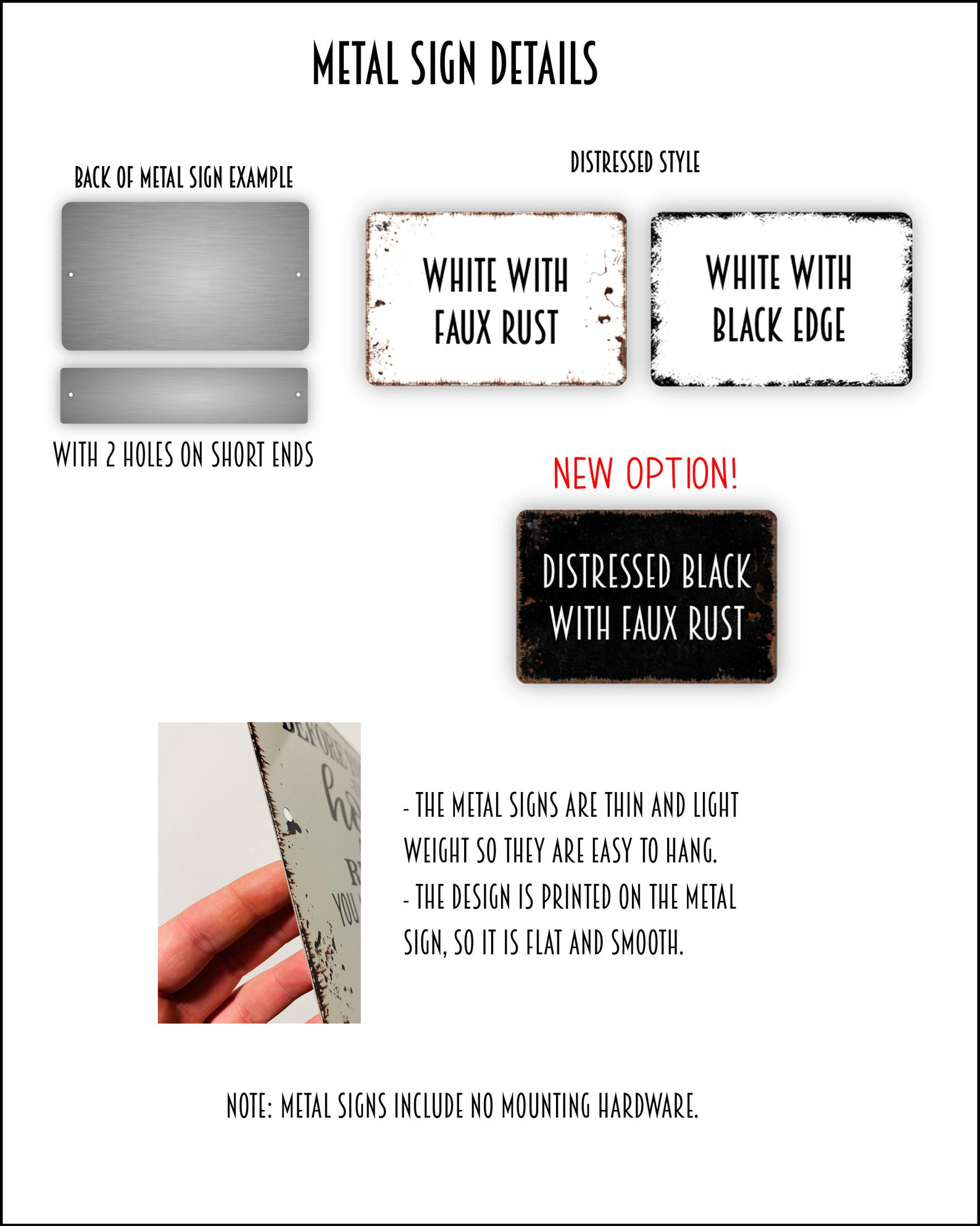 NOTE: All rustic add-ons including any rust, distressed marks, etc. are printed on and not real, so the signs are smooth to the touch.