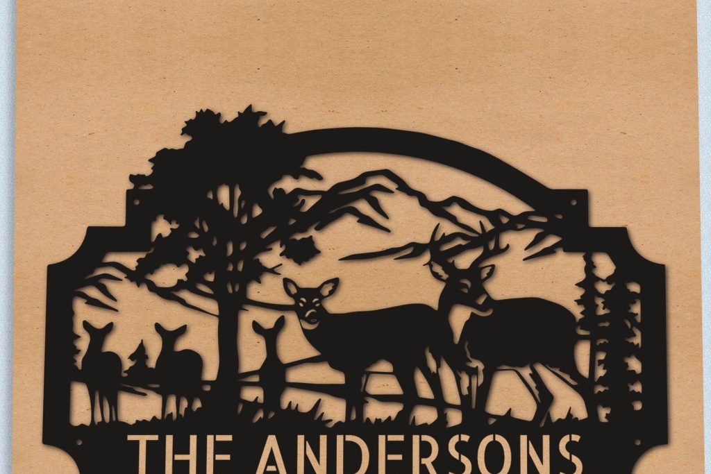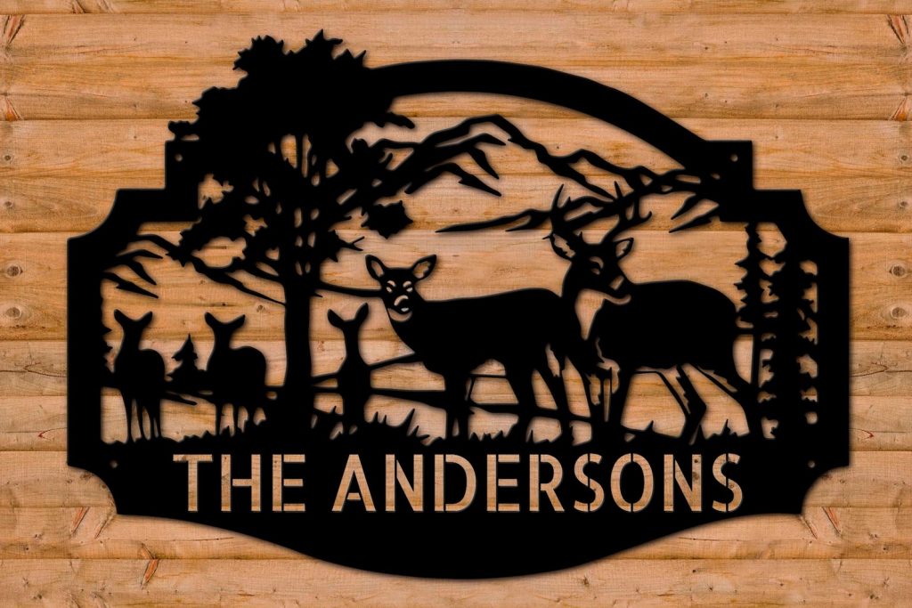 At the heart of this stunning sign is a silhouette depiction of a family of deer, gracefully moving across a serene forest landscape. The intricate design showcases the unity and harmony of these majestic creatures, while the backdrop of the forest transports you to a tranquil woodland setting.
